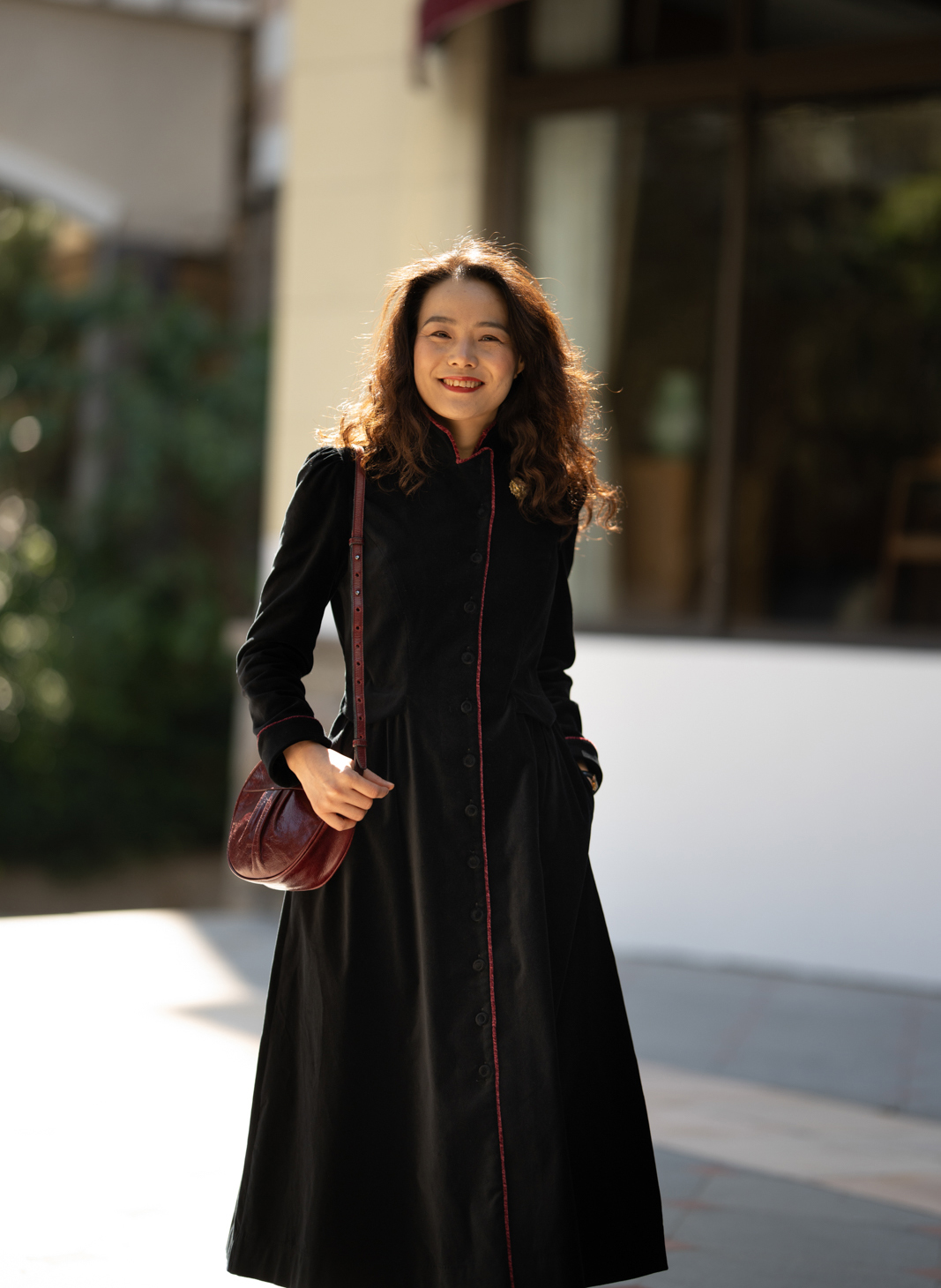 心中仰望真理的淑女,能够穿越纷繁喧嚣的凡尘,成就卓然脱俗的生命……幽幽深蓝,释放出淑女内心深沉美好的信念;智识条纹,透露着淑女一如既往的坚实哲思;精良绵羊毛,流露着淑女柔软芬芳的气韵。经典的最大魅力在于恒久美丽,细细品味,“你的不凡穿尘而过”是知性淑女越穿越精彩的裙装……复古雅致的翻领,与弧形的腰部袋盖及袖口波浪反折设计相呼应,彰显出淑女的不凡:坚定却不乏端丽的女人味,理性但趣致横生。精致的本布包扣和腰部碎褶不仅增加内敛气质与层次感,也...