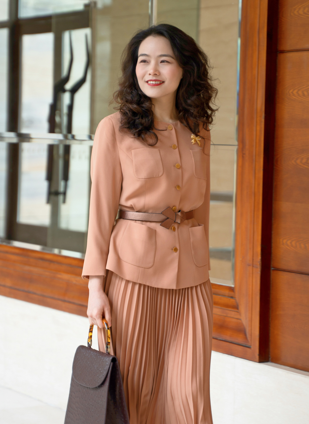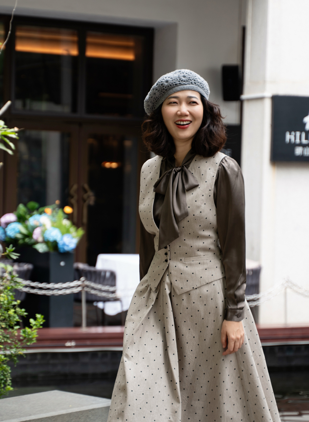 特蕾莎曾说:“我们无法做伟大的事,只能用伟大的爱做小事”。每个美愿的实现都是用伟大的爱做成小事的历程,它从你的心湖出发,遇到另一片心湖时,被重新放大形成温柔而美善的涟漪,不断扩大晕开,直至祝福遍及每个角落……黑色粗花呢它从不“时尚”,因为它不属于“一时”。轻拂面料肌理,你的指腹读到了它编织在纬线与经线中的语言:我在这里,我经久,我陪伴!厚实的全羊毛质地,让温暖在寒冷中缓慢释放,像壁炉余烬的持久暖意。最令人惊艳的莫过于门襟处自然流畅的荷叶...