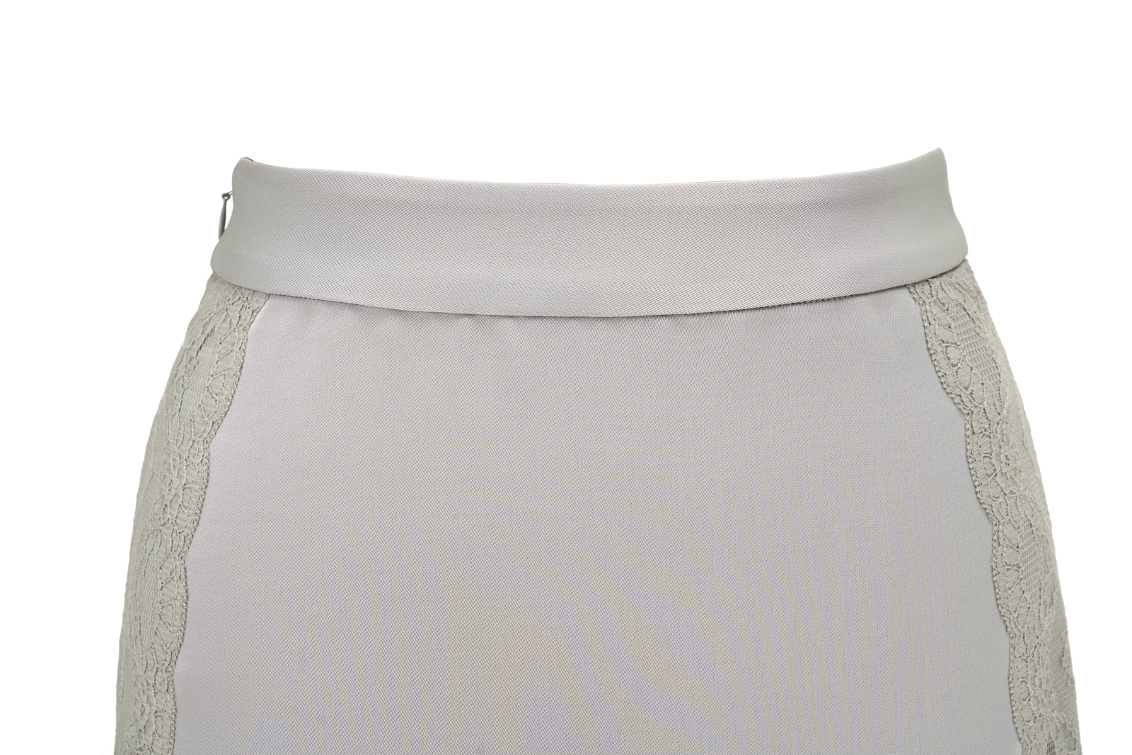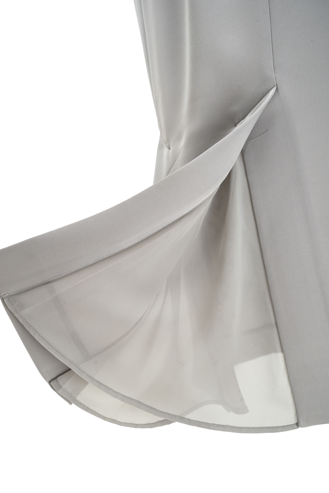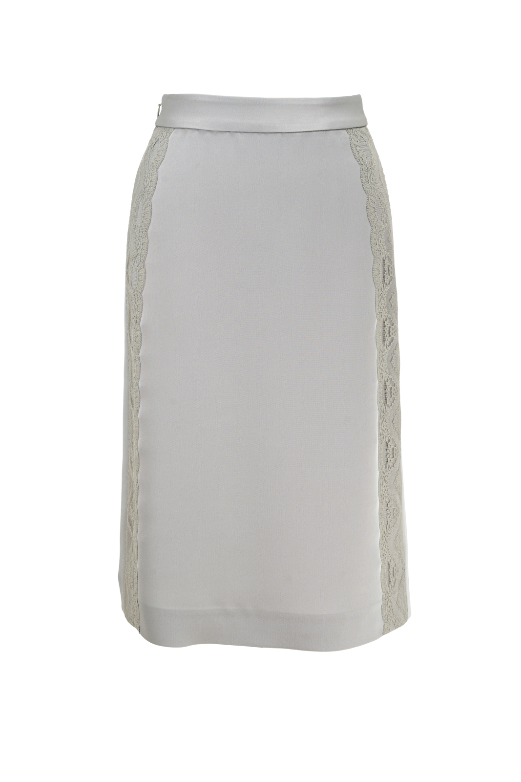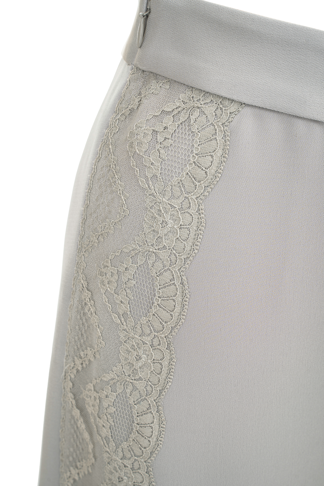 晨曦般的淑女,充满勃勃生机……简洁的浅灰色调带着柔和光泽,是从容得体、自信、合宜的郑重。醋酸混纺面料垂顺,裙身线条流畅,两侧细腻考究的蕾丝花边与莹润的珠光气质相互融合,简约中透出温婉女性魅力。裙身后腰的松紧设计为腰腹的舒展留出空间,后下摆融入三角衩设计,拼接同色轻盈薄纱,令行走的端丽增添曼妙的通透。
