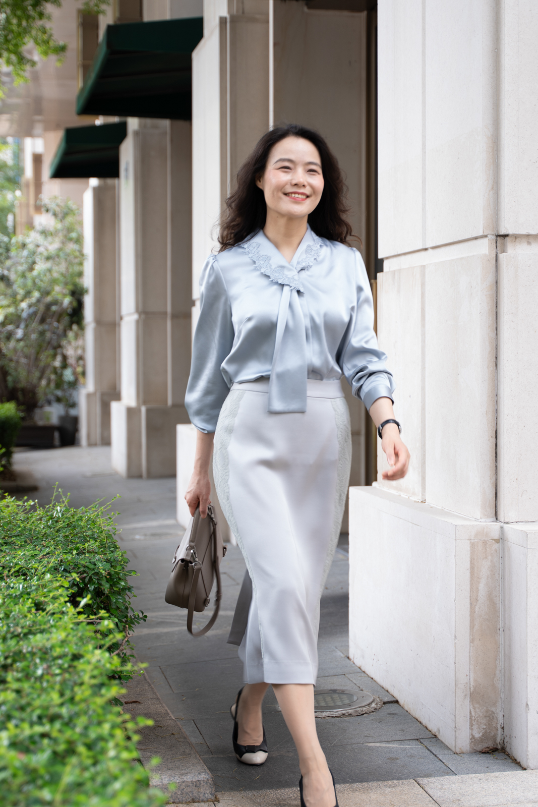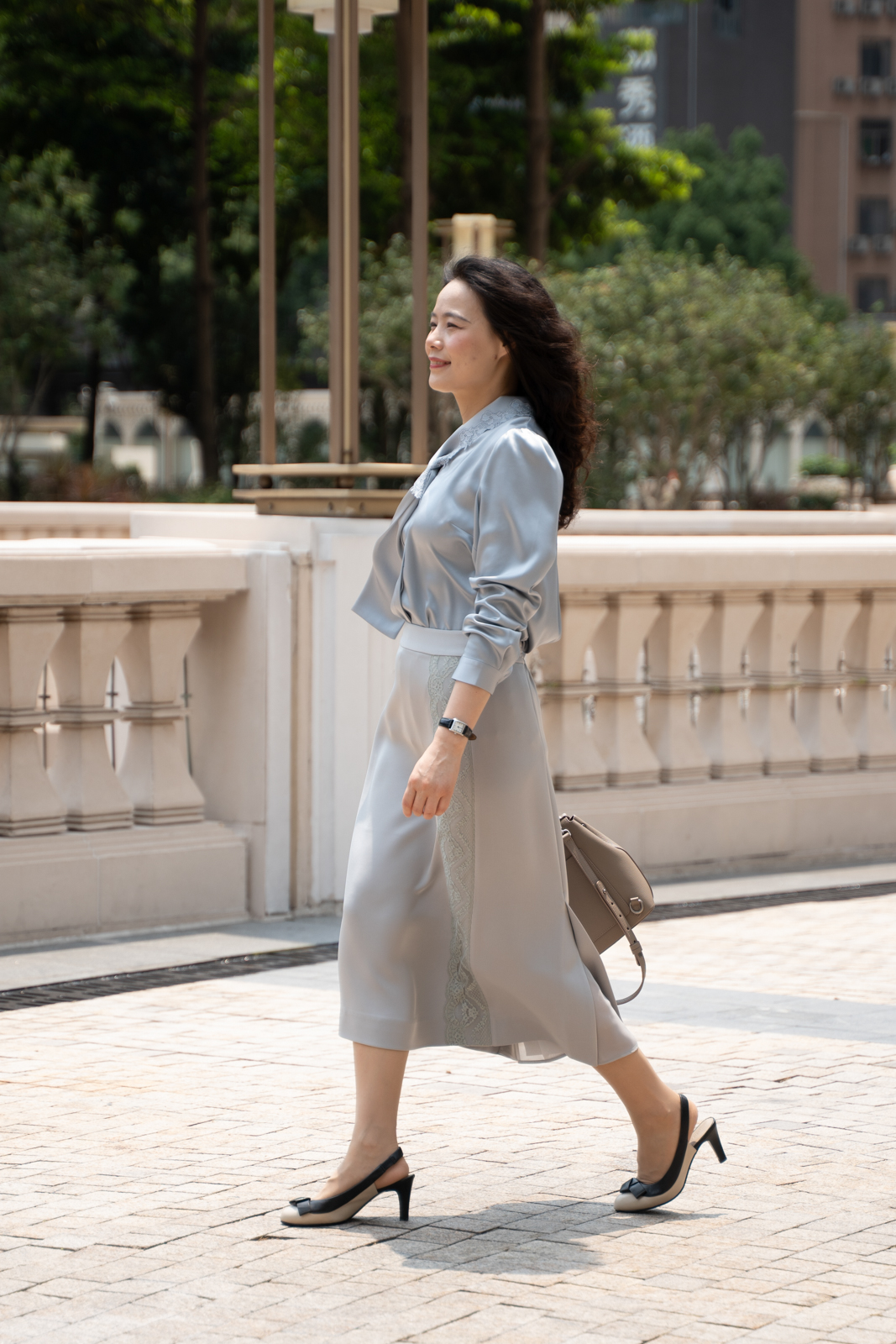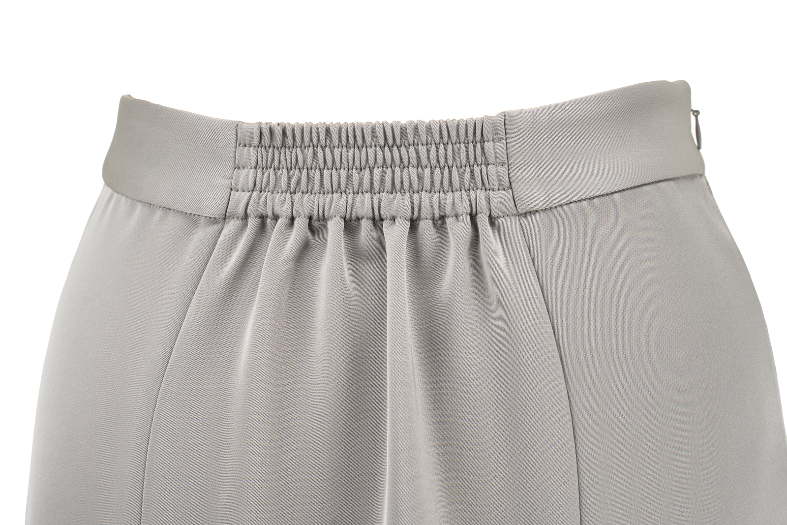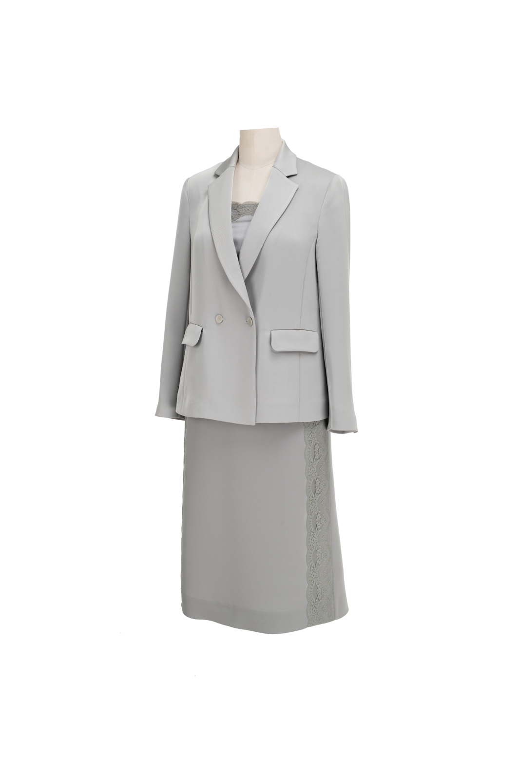 晨曦般的淑女,充满勃勃生机……简洁的浅灰色调带着柔和光泽,是从容得体、自信、合宜的郑重。醋酸混纺面料垂顺,裙身线条流畅,两侧细腻考究的蕾丝花边与莹润的珠光气质相互融合,简约中透出温婉女性魅力。裙身后腰的松紧设计为腰腹的舒展留出空间,后下摆融入三角衩设计,拼接同色轻盈薄纱,令行走的端丽增添曼妙的通透。