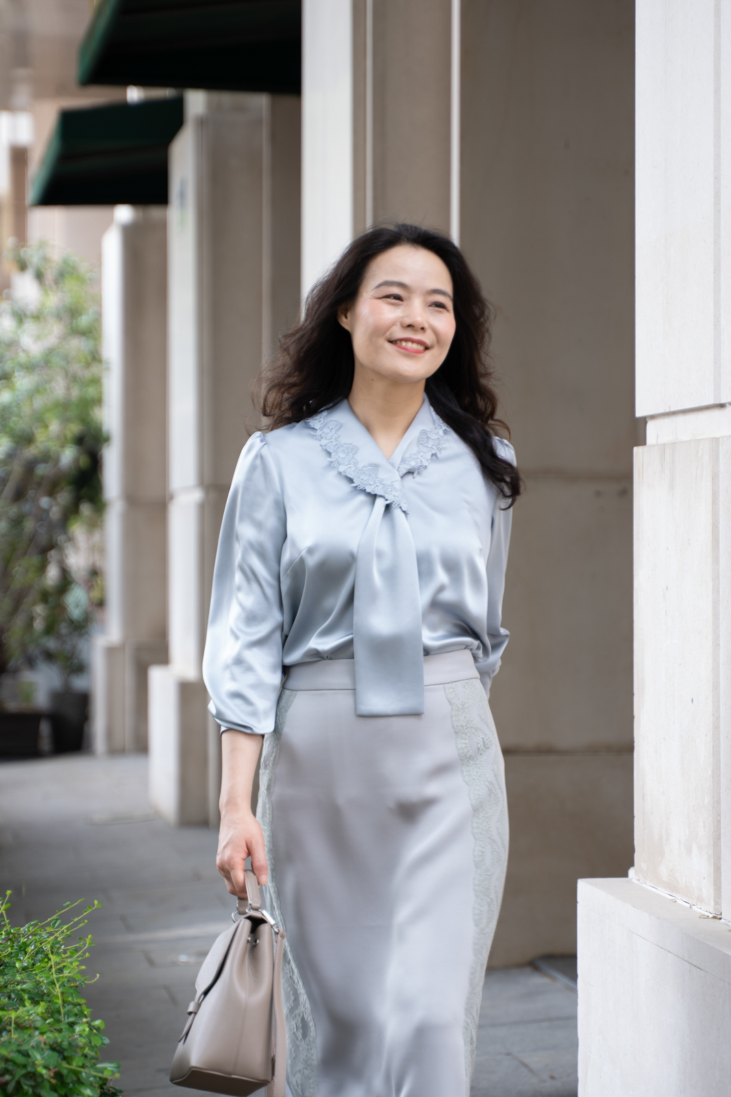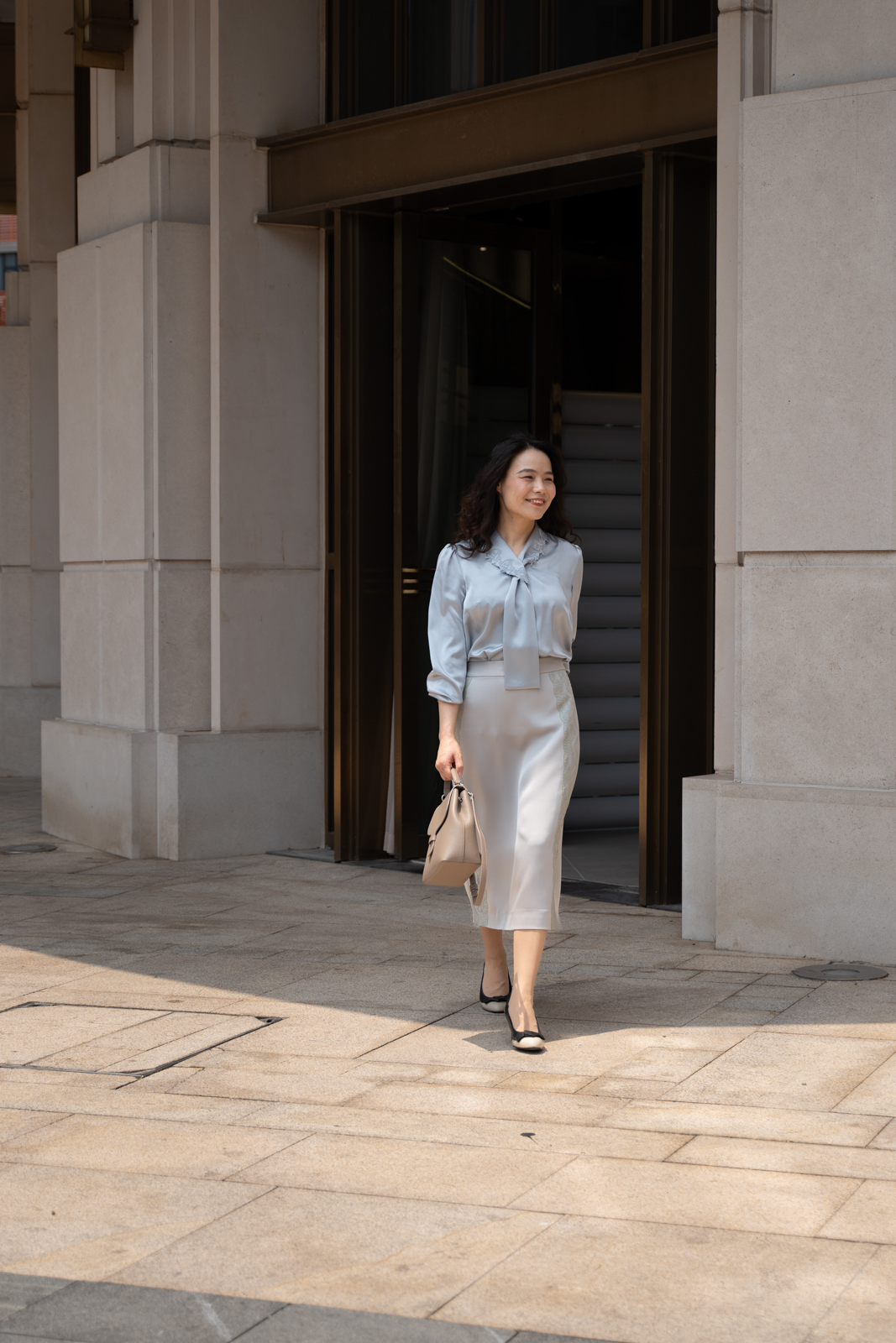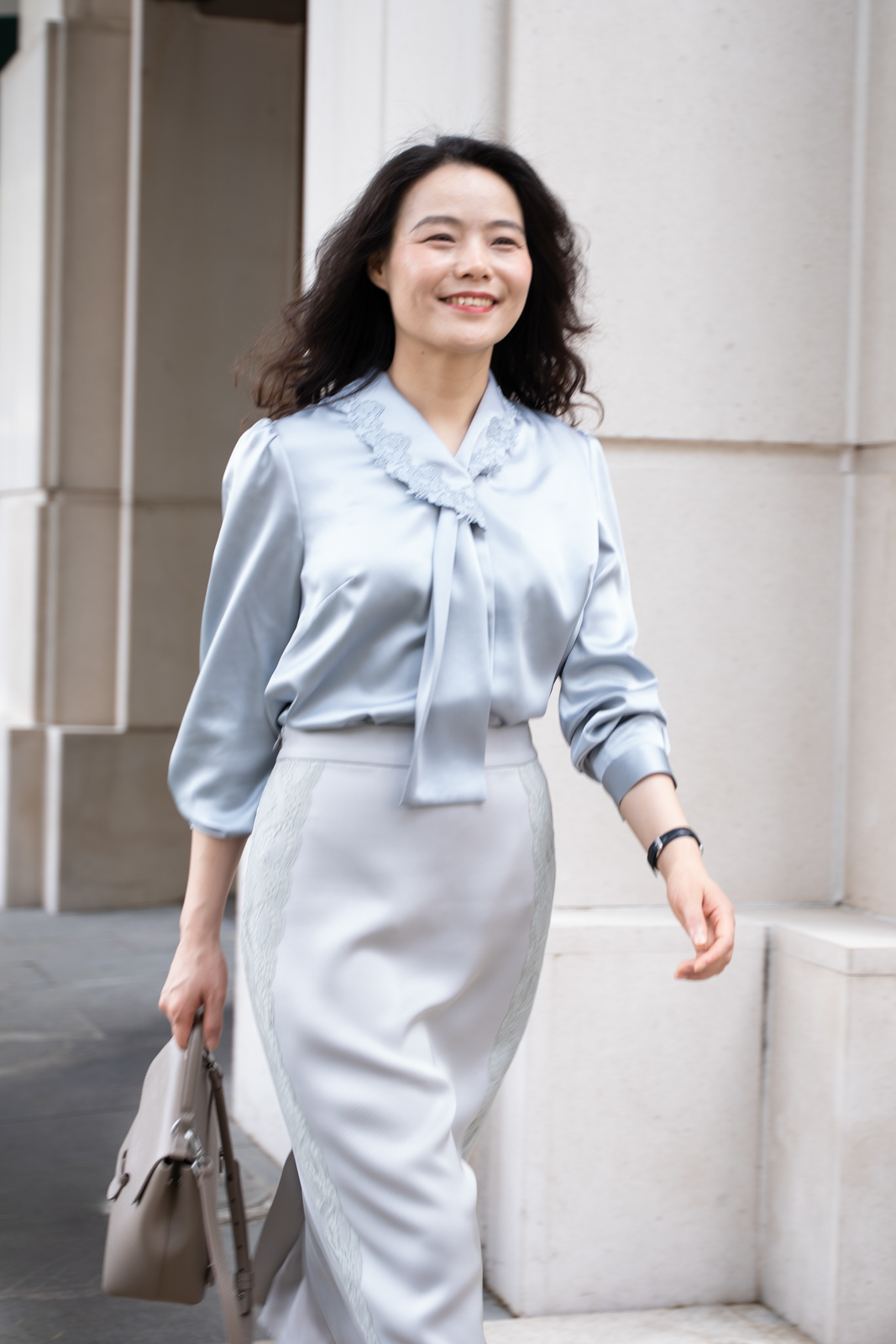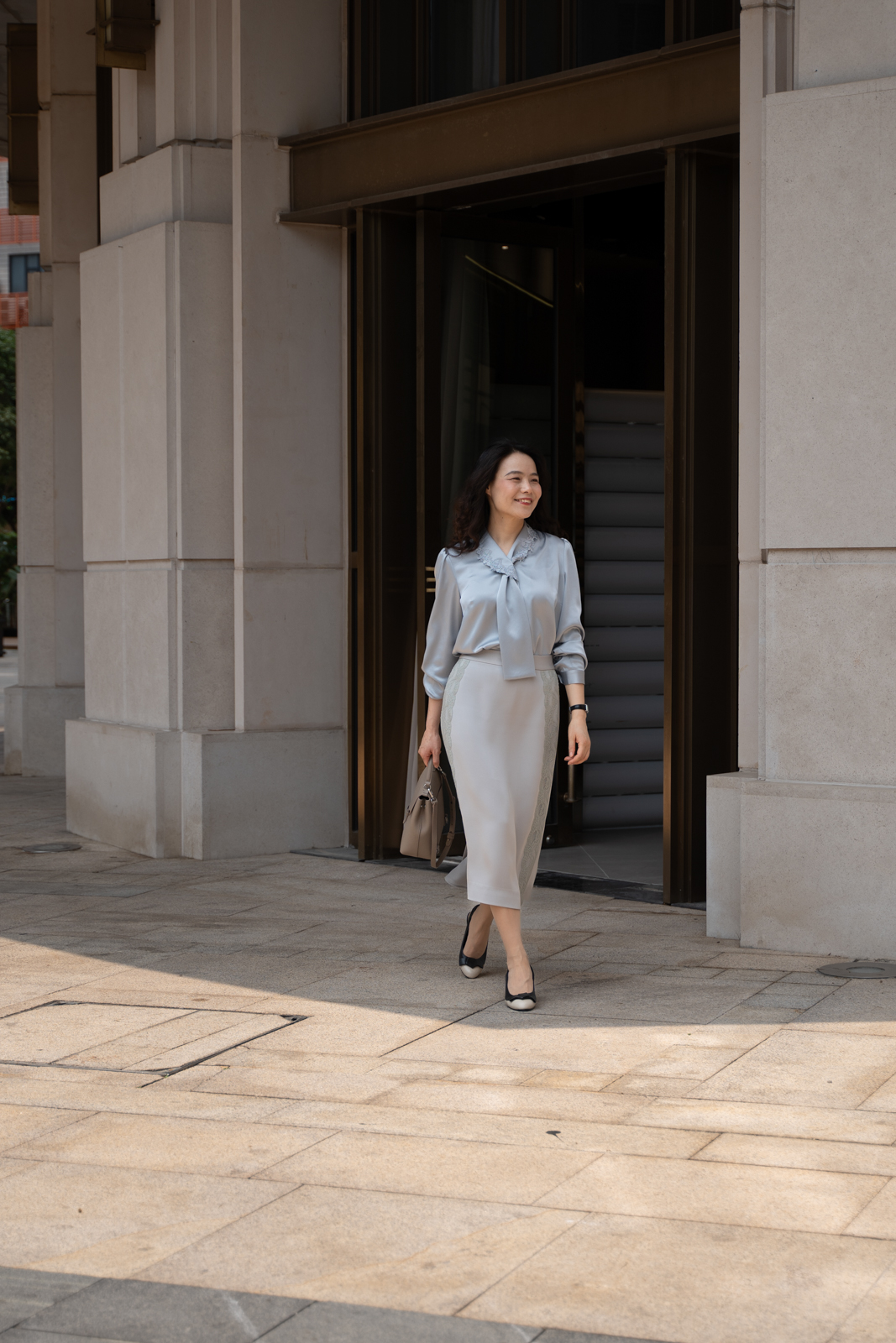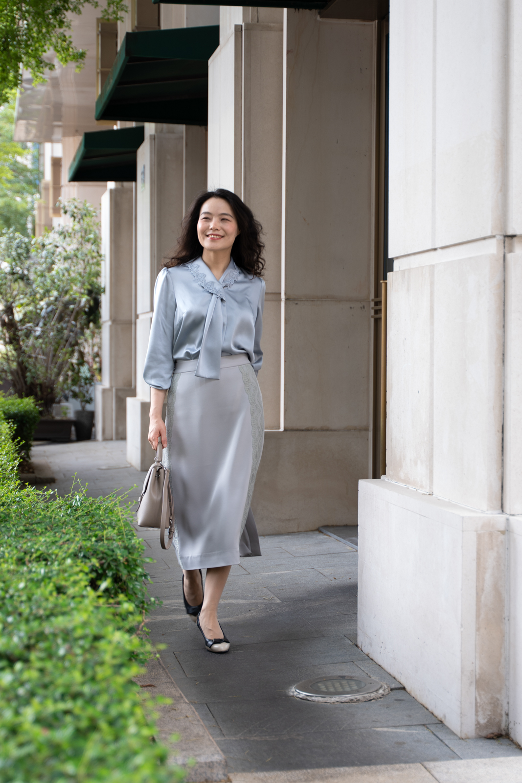 晨曦般的淑女,充满勃勃生机……简洁的浅灰色调带着柔和光泽,是从容得体、自信、合宜的郑重。醋酸混纺面料垂顺,裙身线条流畅,两侧细腻考究的蕾丝花边与莹润的珠光气质相互融合,简约中透出温婉女性魅力。裙身后腰的松紧设计为腰腹的舒展留出空间,后下摆融入三角衩设计,拼接同色轻盈薄纱,令行走的端丽增添曼妙的通透。