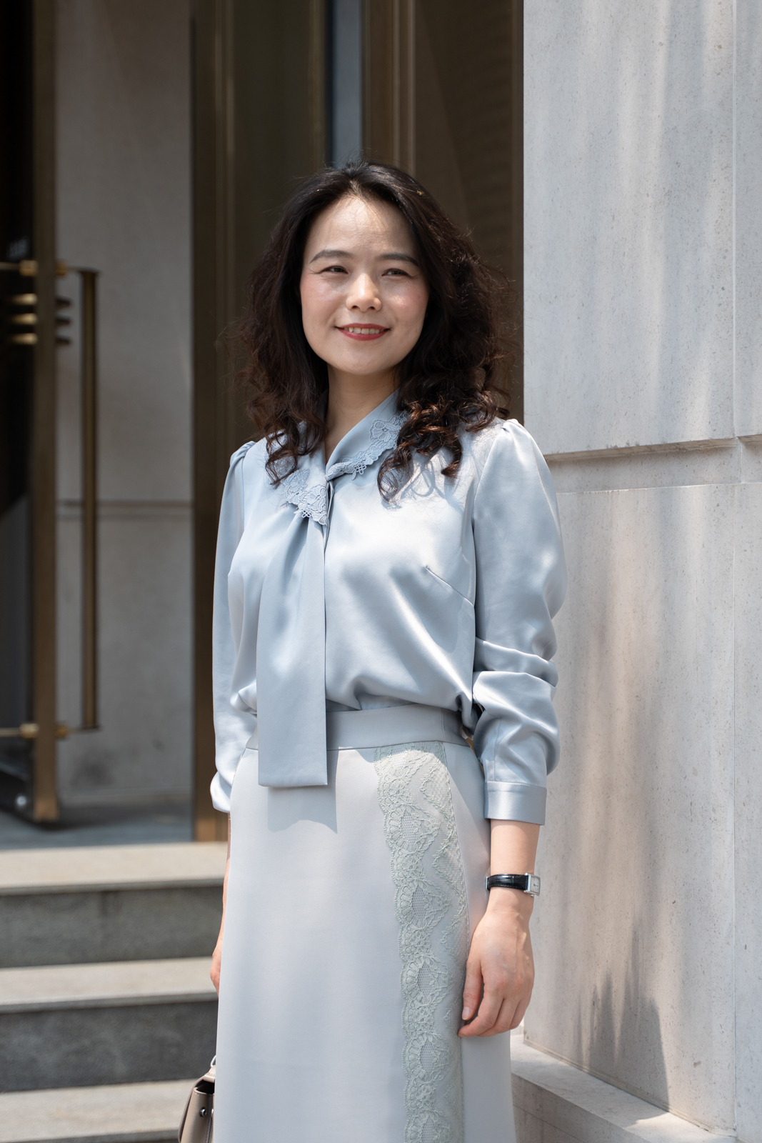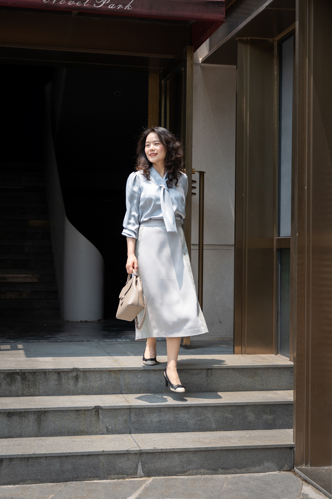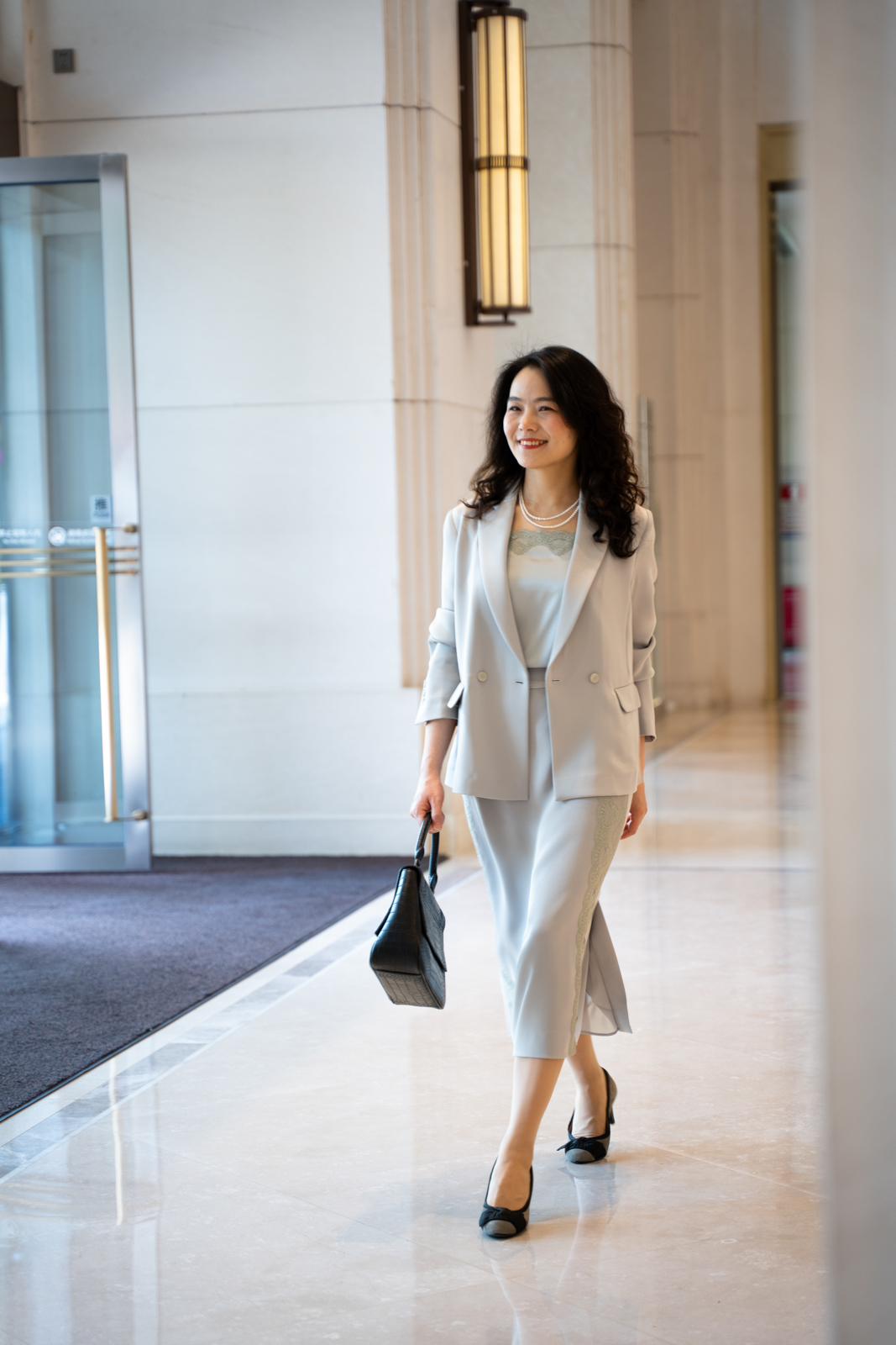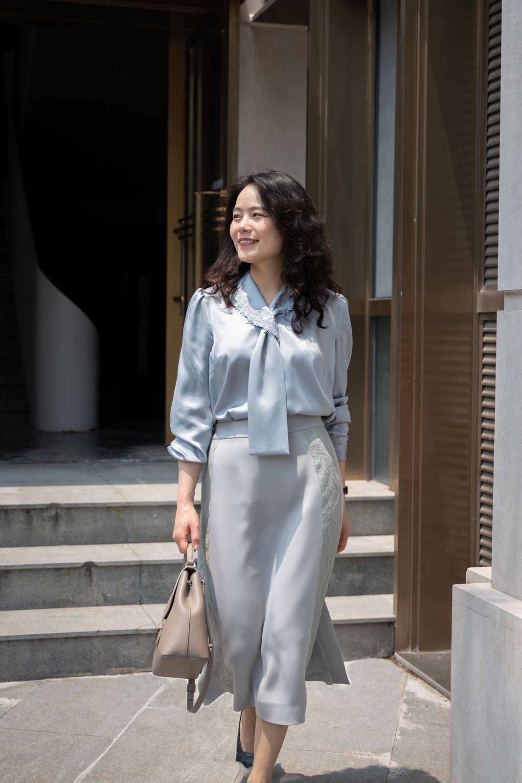 晨曦般的淑女,充满勃勃生机……简洁的浅灰色调带着柔和光泽,是从容得体、自信、合宜的郑重。醋酸混纺面料垂顺,裙身线条流畅,两侧细腻考究的蕾丝花边与莹润的珠光气质相互融合,简约中透出温婉女性魅力。裙身后腰的松紧设计为腰腹的舒展留出空间,后下摆融入三角衩设计,拼接同色轻盈薄纱,令行走的端丽增添曼妙的通透。