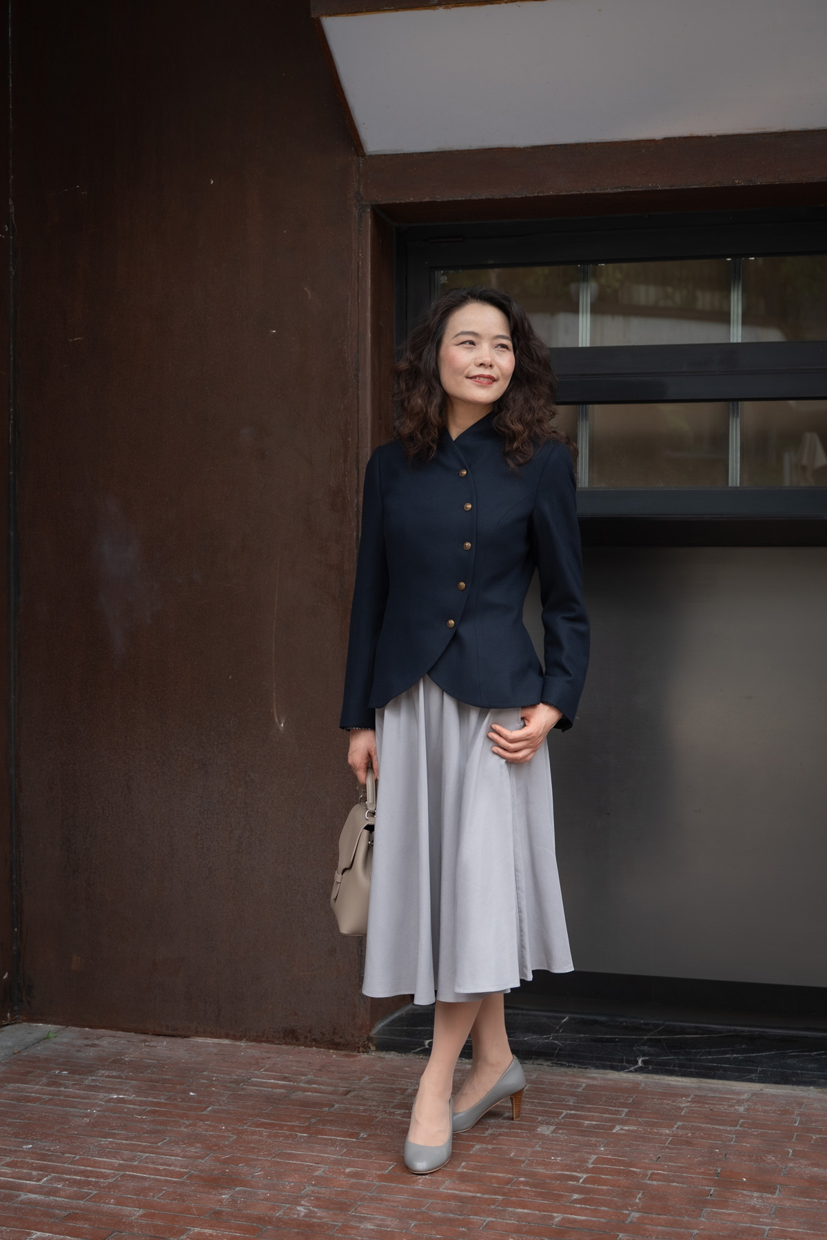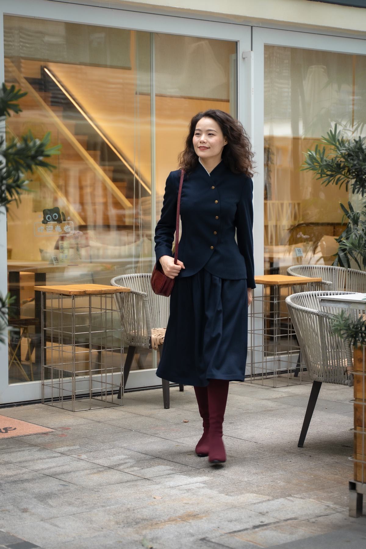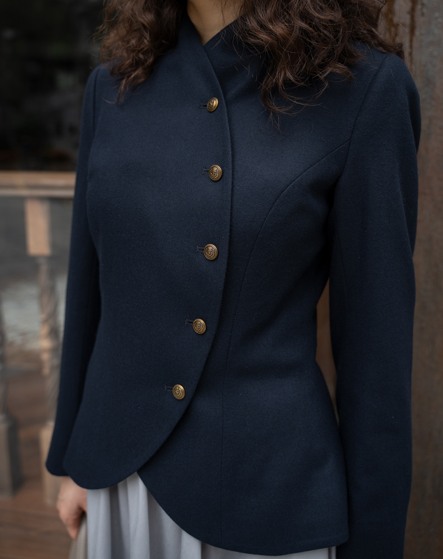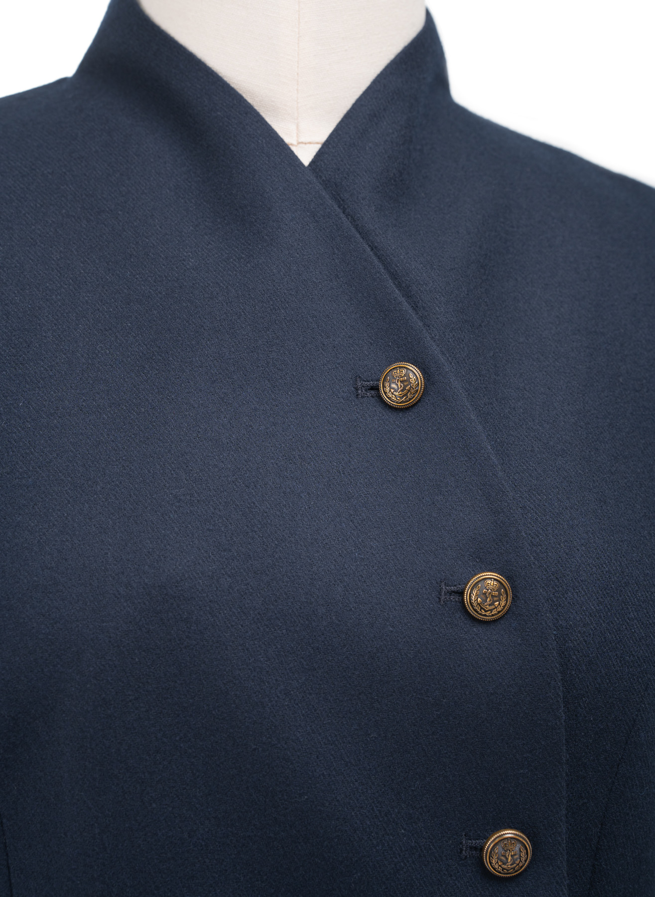 全羊毛质地的细腻与柔软是碧波蓝天里的柔情,深蓝的沉稳深邃润饰着内心的宽广与丰富;领口的设计修饰颈部曲线,像天鹅美颈般优美端庄,流畅而下交叠出的弧线形门襟设计灵动自然,好似湖面泛起的波澜,古铜色复古扣饰妆点其上像粼粼波光,整体造型昂扬优美,经典实穿,是兼顾品位质感和易搭配性的优雅设计,让淑女安然笃定又竭力生活的精神气质有准确而迷人的表达……
