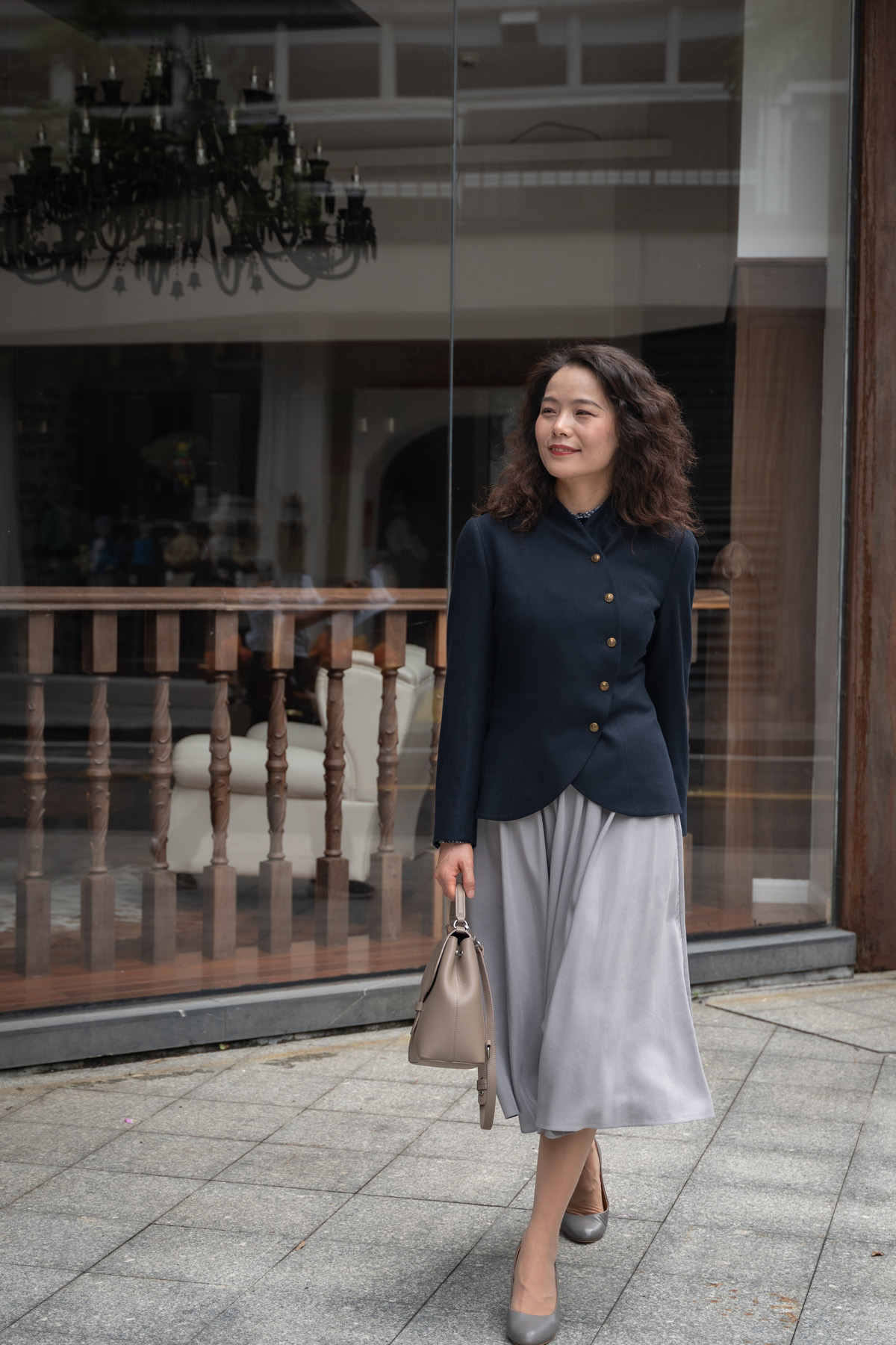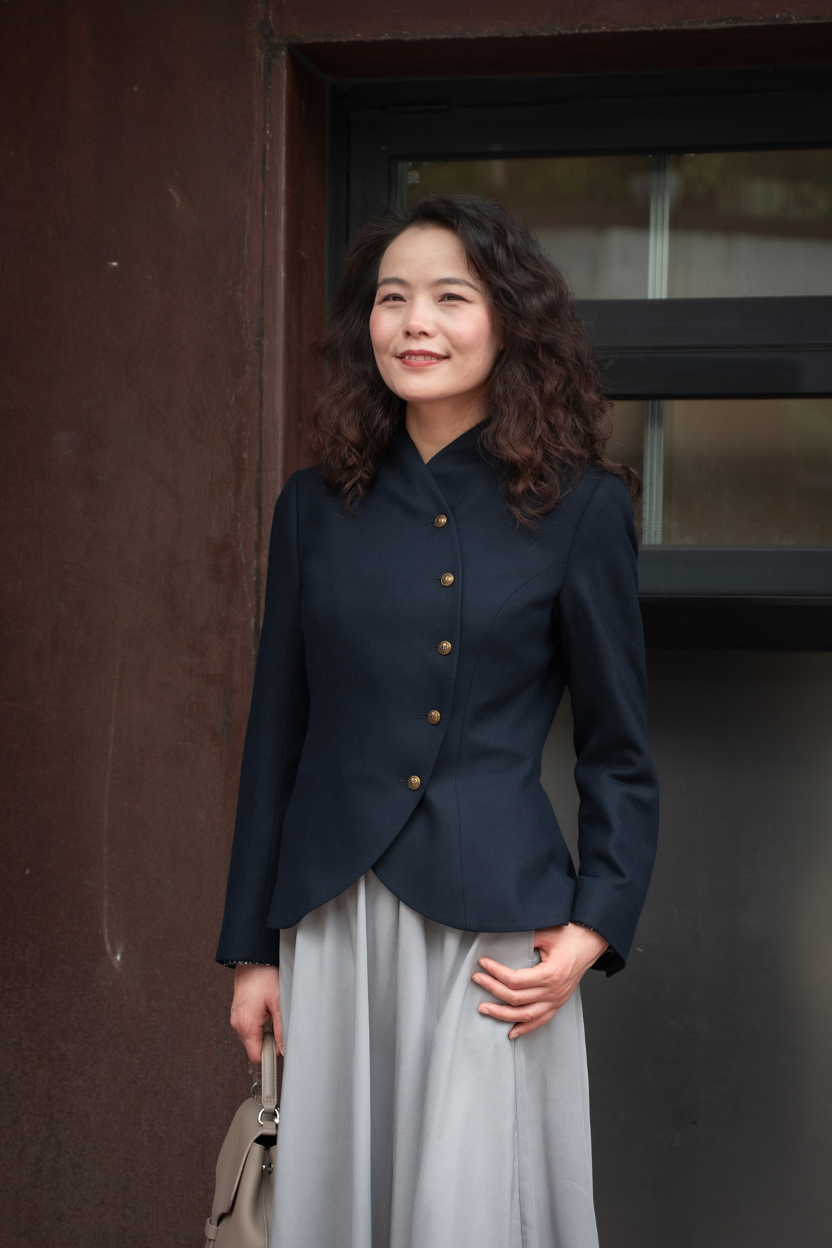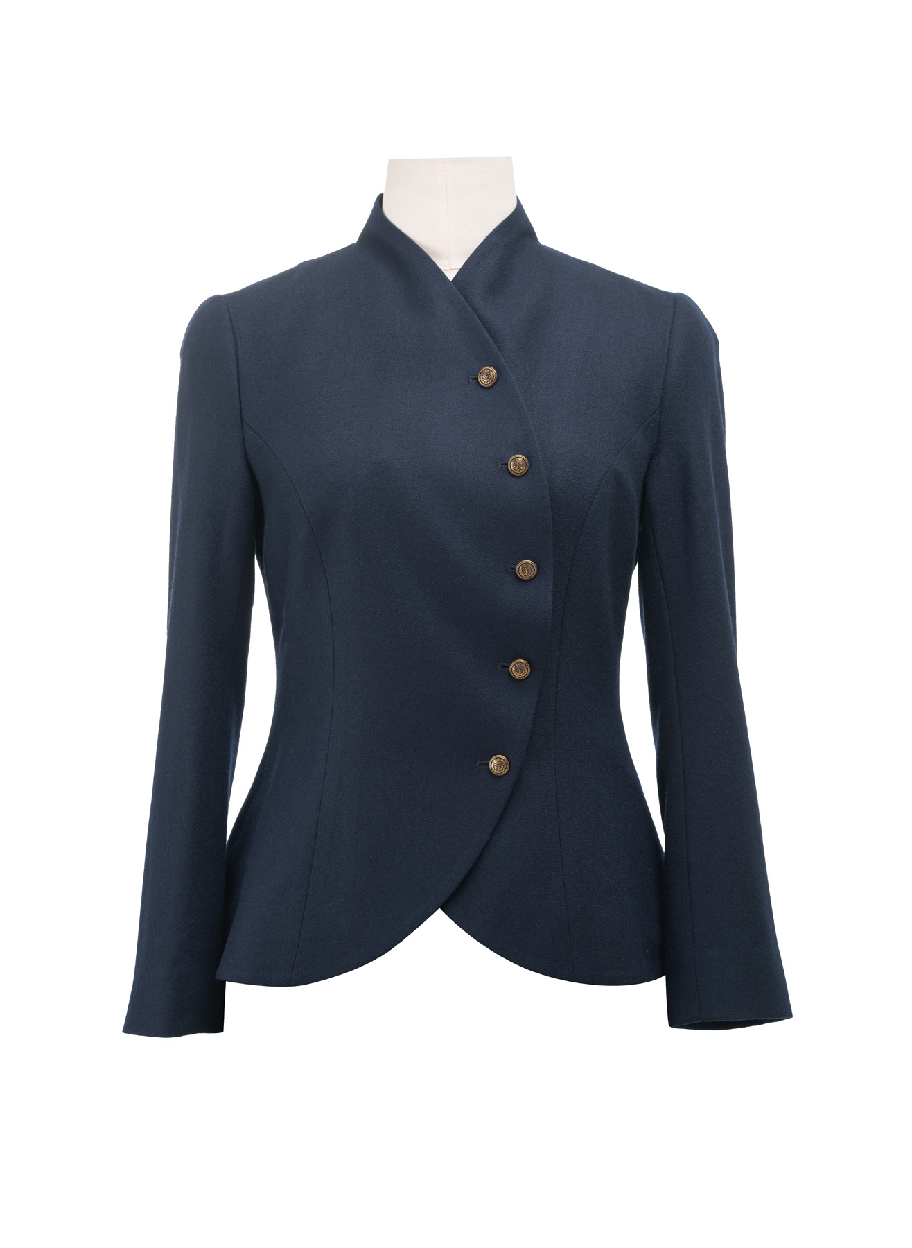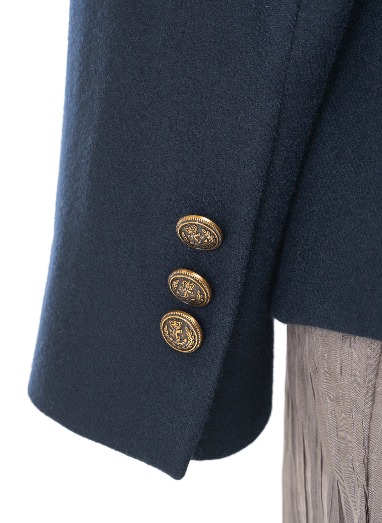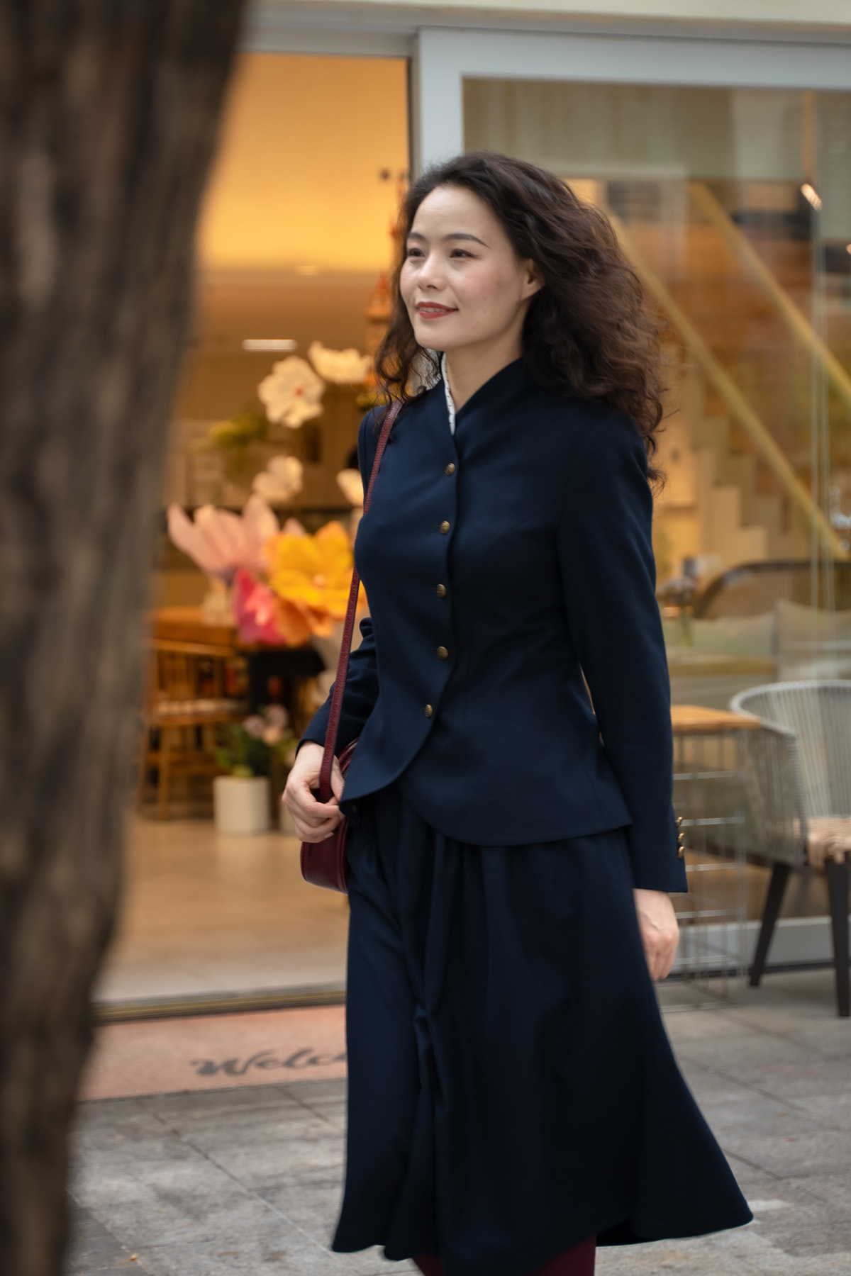 全羊毛质地的细腻与柔软是碧波蓝天里的柔情,深蓝的沉稳深邃润饰着内心的宽广与丰富;领口的设计修饰颈部曲线,像天鹅美颈般优美端庄,流畅而下交叠出的弧线形门襟设计灵动自然,好似湖面泛起的波澜,古铜色复古扣饰妆点其上像粼粼波光,整体造型昂扬优美,经典实穿,是兼顾品位质感和易搭配性的优雅设计,让淑女安然笃定又竭力生活的精神气质有准确而迷人的表达……