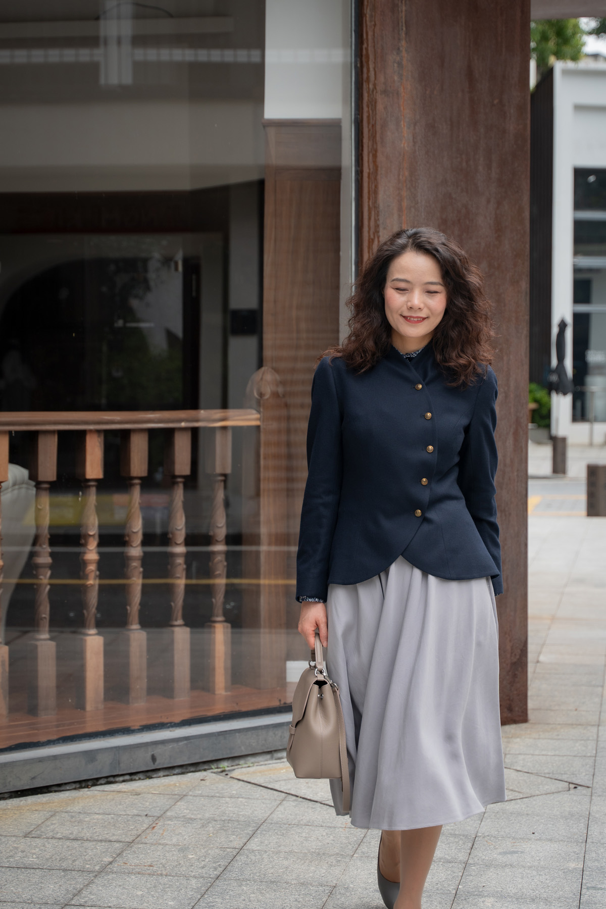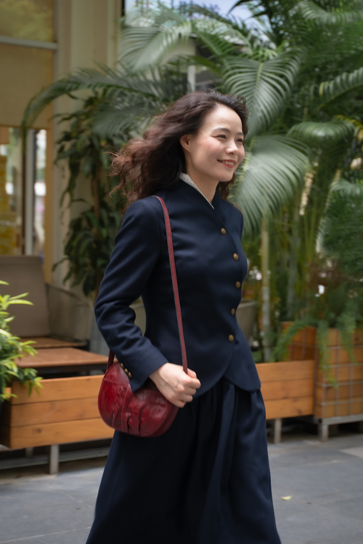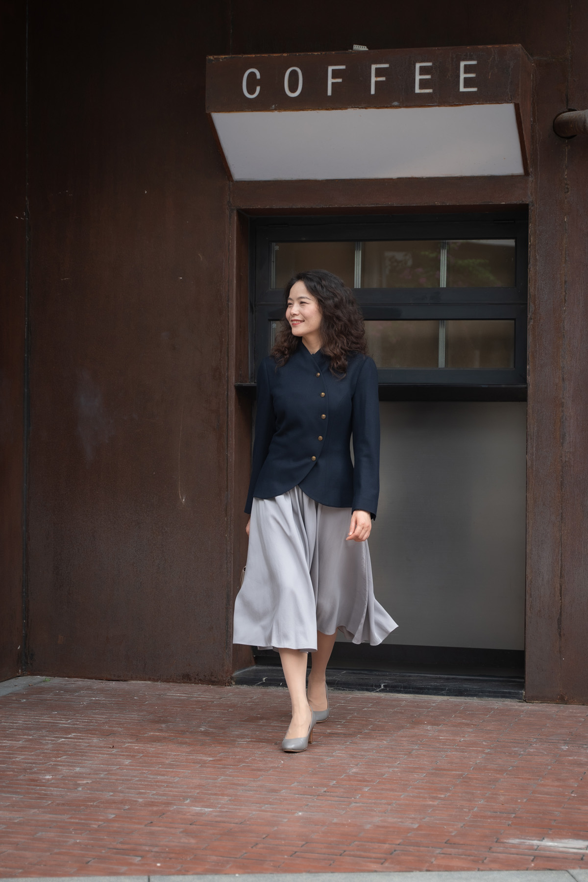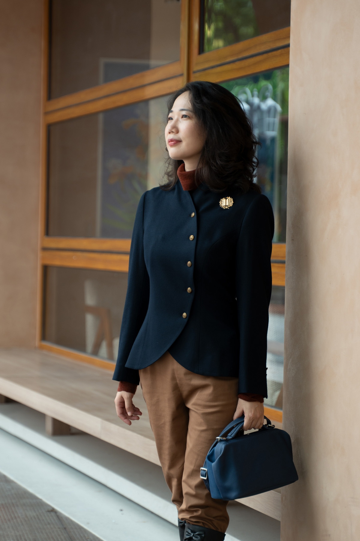 全羊毛质地的细腻与柔软是碧波蓝天里的柔情,深蓝的沉稳深邃润饰着内心的宽广与丰富;领口的设计修饰颈部曲线,像天鹅美颈般优美端庄,流畅而下交叠出的弧线形门襟设计灵动自然,好似湖面泛起的波澜,古铜色复古扣饰妆点其上像粼粼波光,整体造型昂扬优美,经典实穿,是兼顾品位质感和易搭配性的优雅设计,让淑女安然笃定又竭力生活的精神气质有准确而迷人的表达……