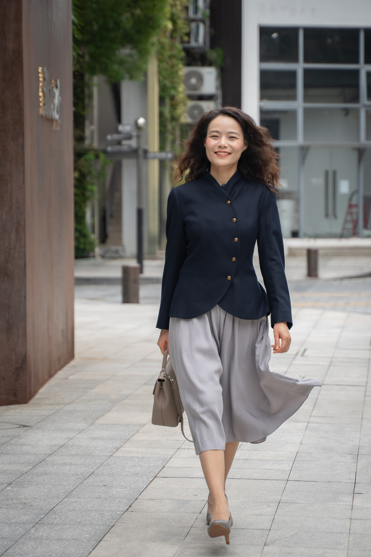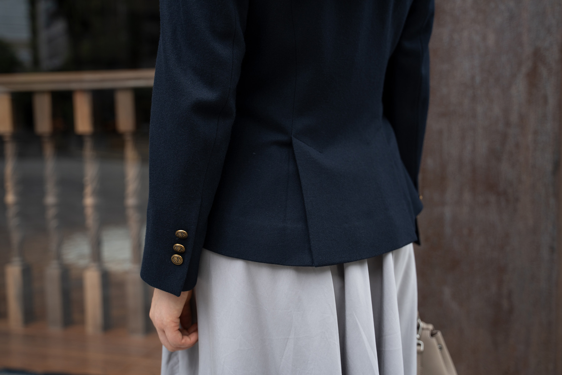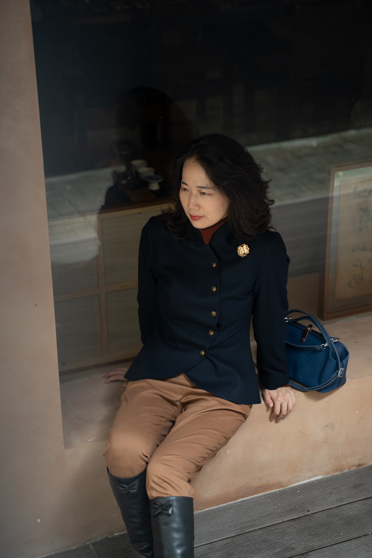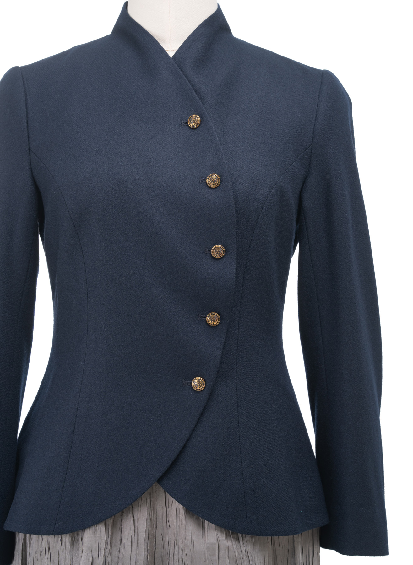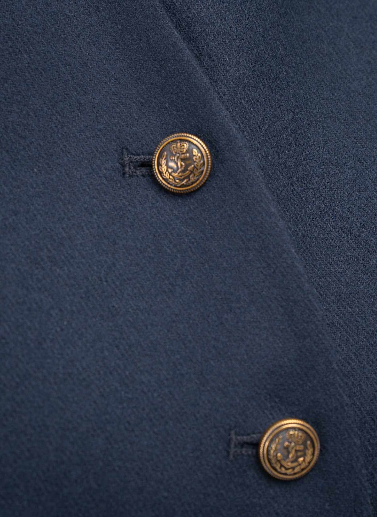 全羊毛质地的细腻与柔软是碧波蓝天里的柔情,深蓝的沉稳深邃润饰着内心的宽广与丰富;领口的设计修饰颈部曲线,像天鹅美颈般优美端庄,流畅而下交叠出的弧线形门襟设计灵动自然,好似湖面泛起的波澜,古铜色复古扣饰妆点其上像粼粼波光,整体造型昂扬优美,经典实穿,是兼顾品位质感和易搭配性的优雅设计,让淑女安然笃定又竭力生活的精神气质有准确而迷人的表达……
