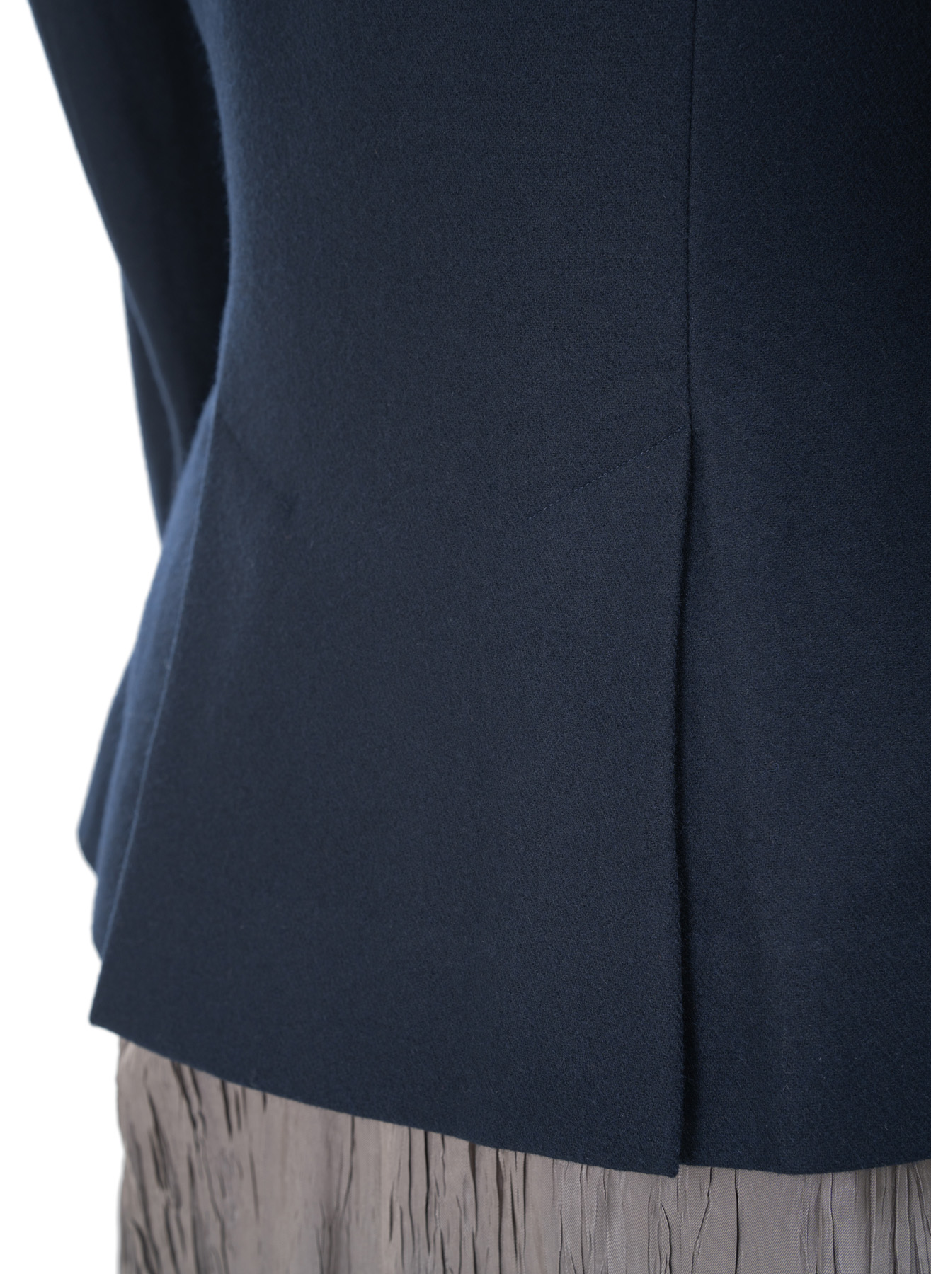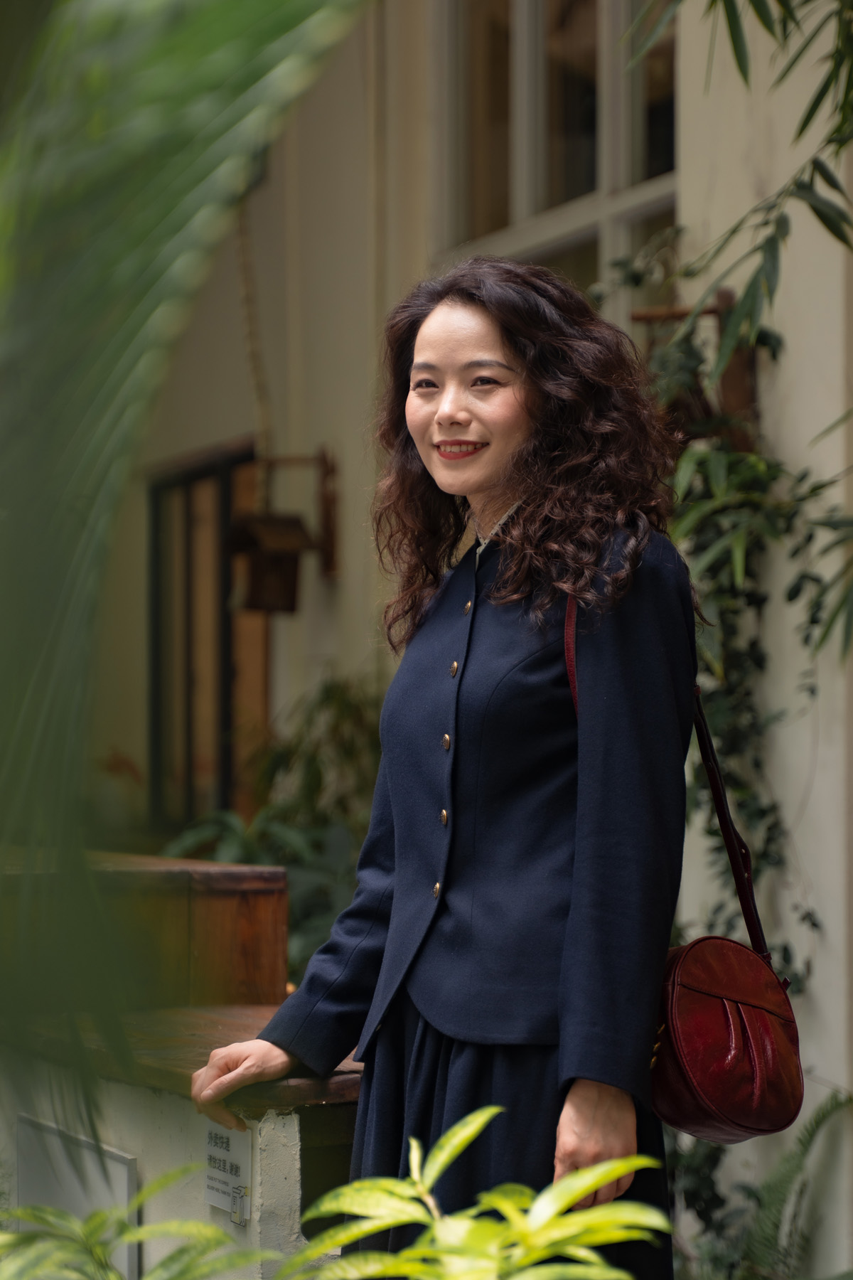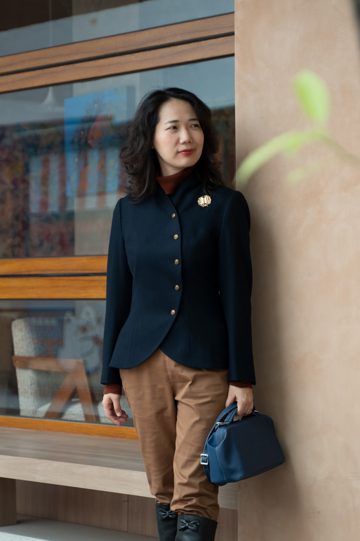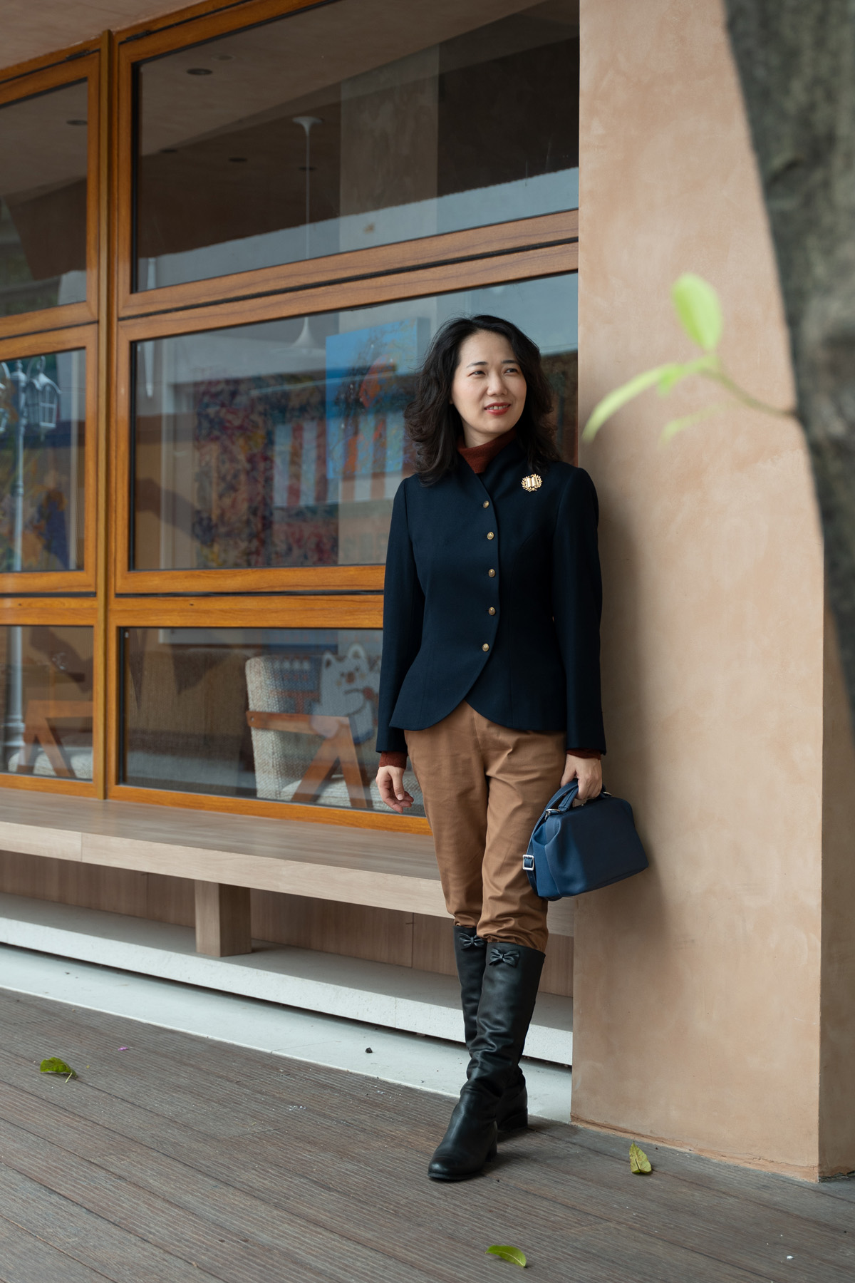 全羊毛质地的细腻与柔软是碧波蓝天里的柔情,深蓝的沉稳深邃润饰着内心的宽广与丰富;领口的设计修饰颈部曲线,像天鹅美颈般优美端庄,流畅而下交叠出的弧线形门襟设计灵动自然,好似湖面泛起的波澜,古铜色复古扣饰妆点其上像粼粼波光,整体造型昂扬优美,经典实穿,是兼顾品位质感和易搭配性的优雅设计,让淑女安然笃定又竭力生活的精神气质有准确而迷人的表达……