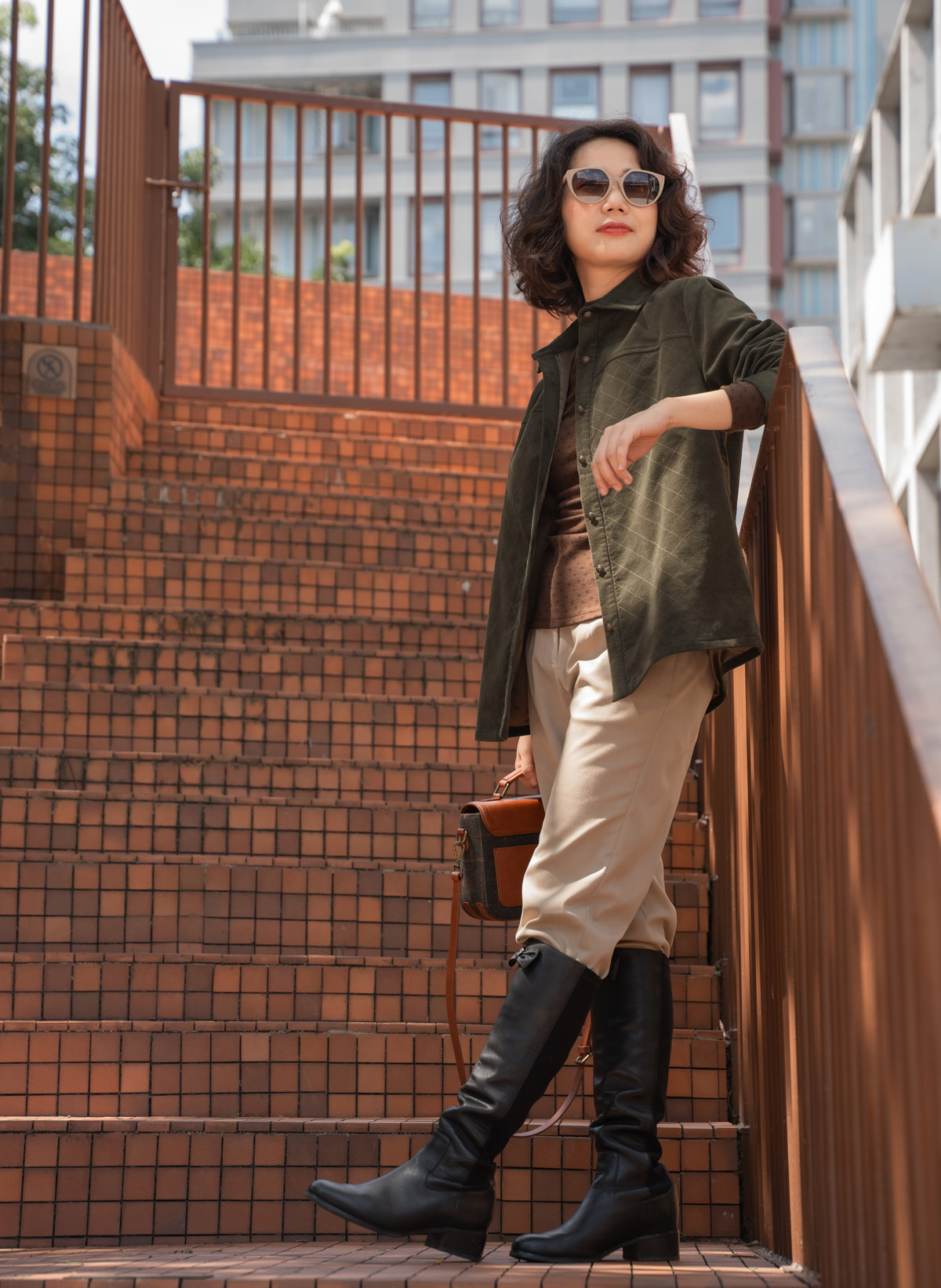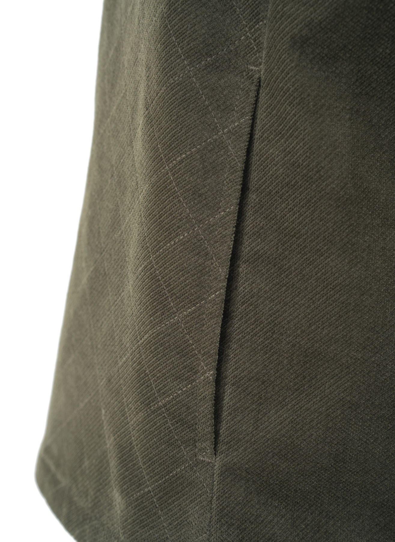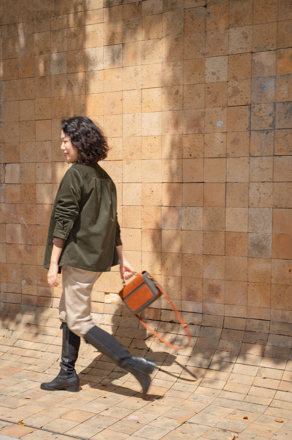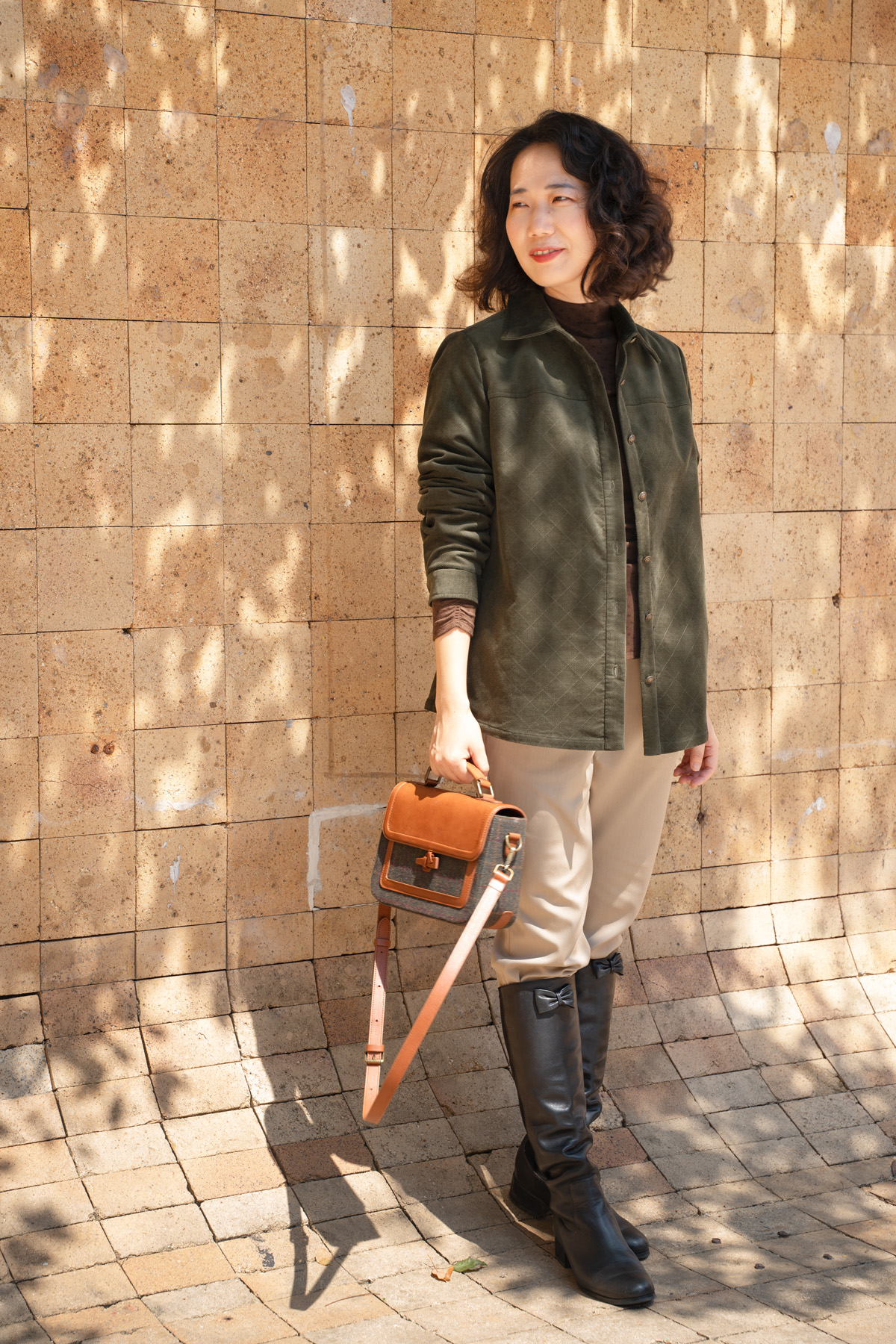 有故事的设计总是很迷人,“故事”也会因穿着者的生命历程而变得生动、隽永、丰富、精彩……“故事”的开头,是来自对永恒生命的向往,那一抹深沉的橄榄绿不畏时光的磨砺,总以谦和平稳积极的笔触书写,给人永不磨灭的希望。“故事”在进口平绒细腻的质感里书写温暖,精湛的车缝技术勾勒出若隐若现的菱形格纹,仿佛在复古纸页上描画书写的格式,规整精致,又赋予层次。再以古铜色金属扣做“标点”,充满怀旧的情感,是对美好时光的追忆与纪念……