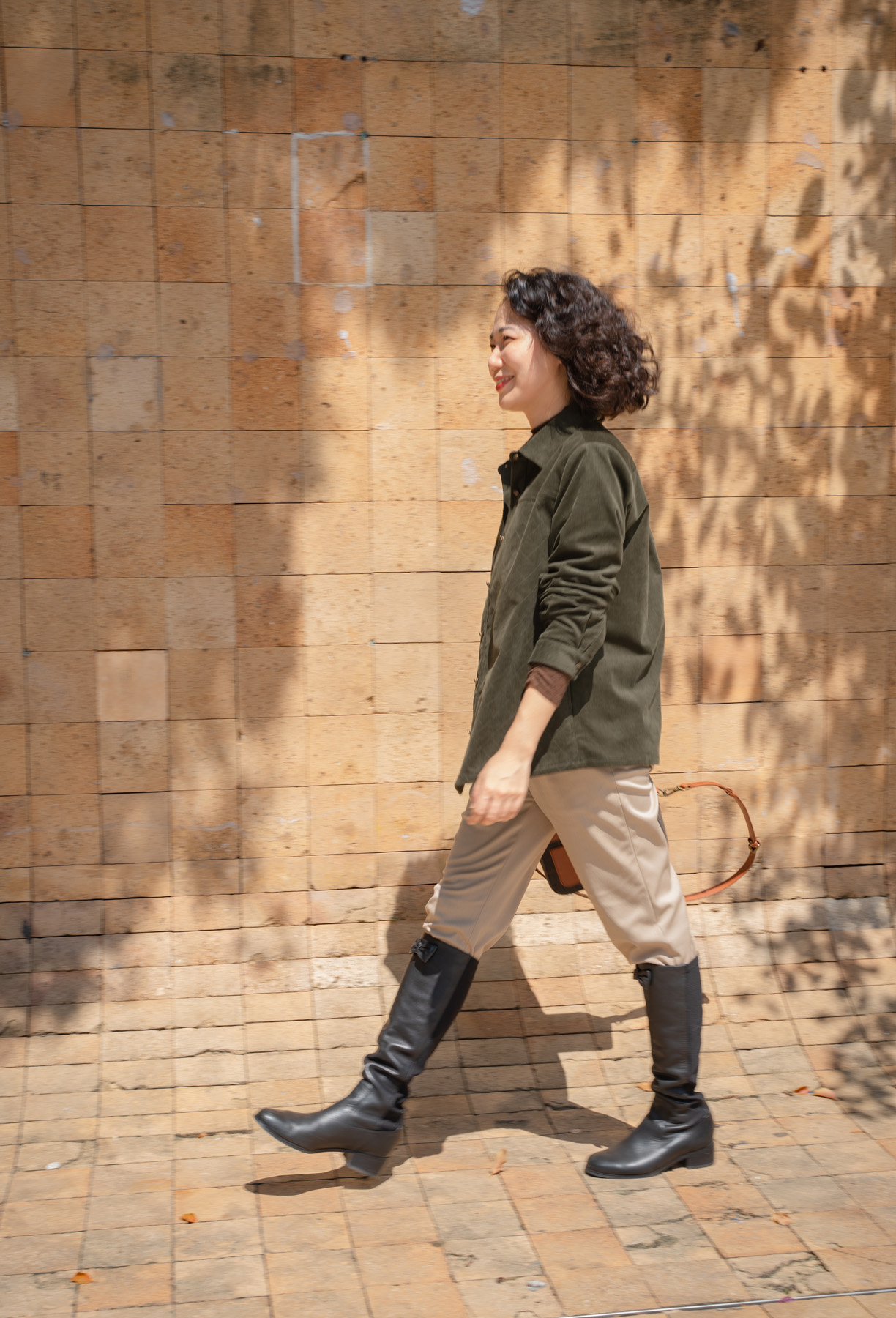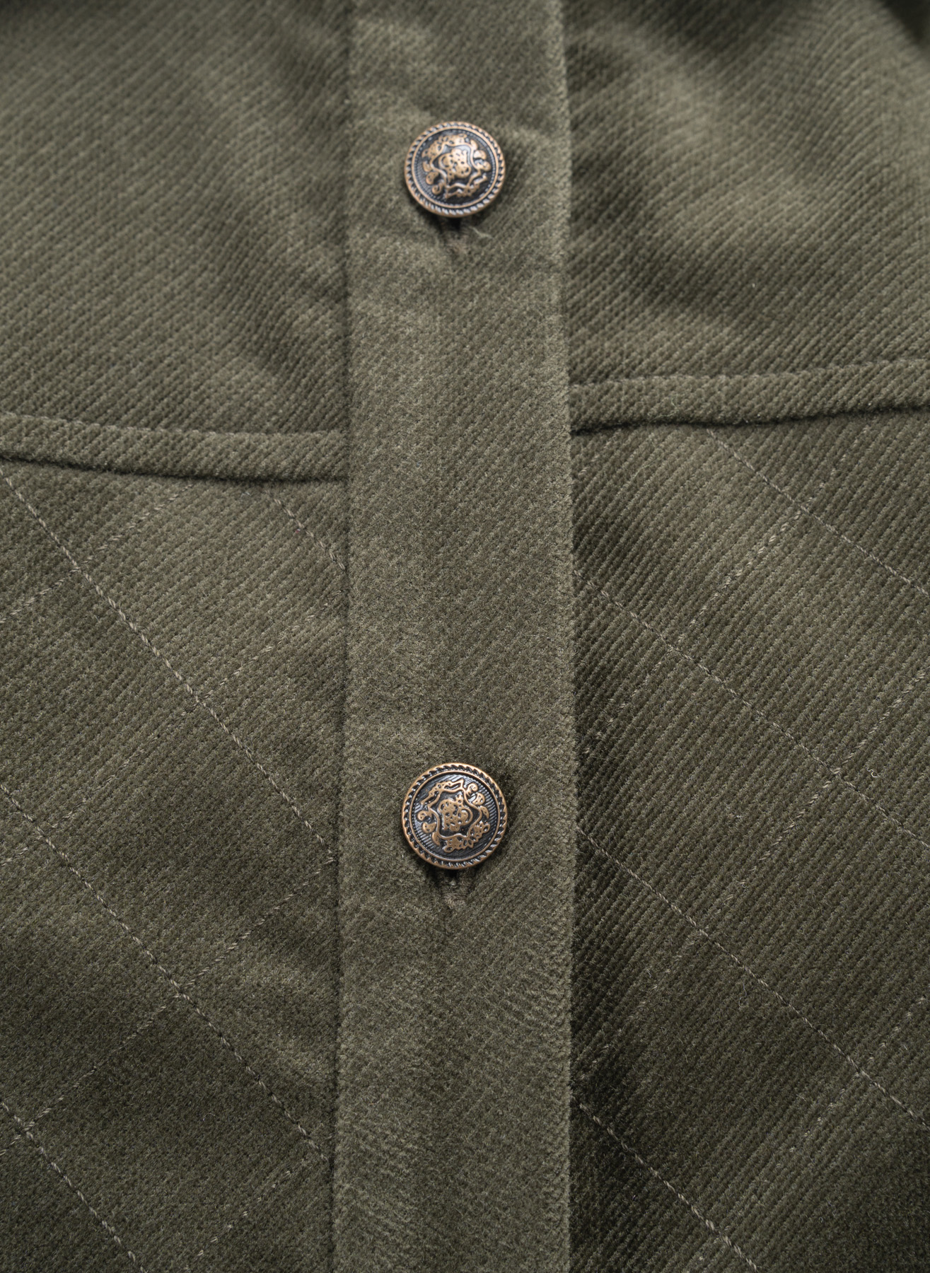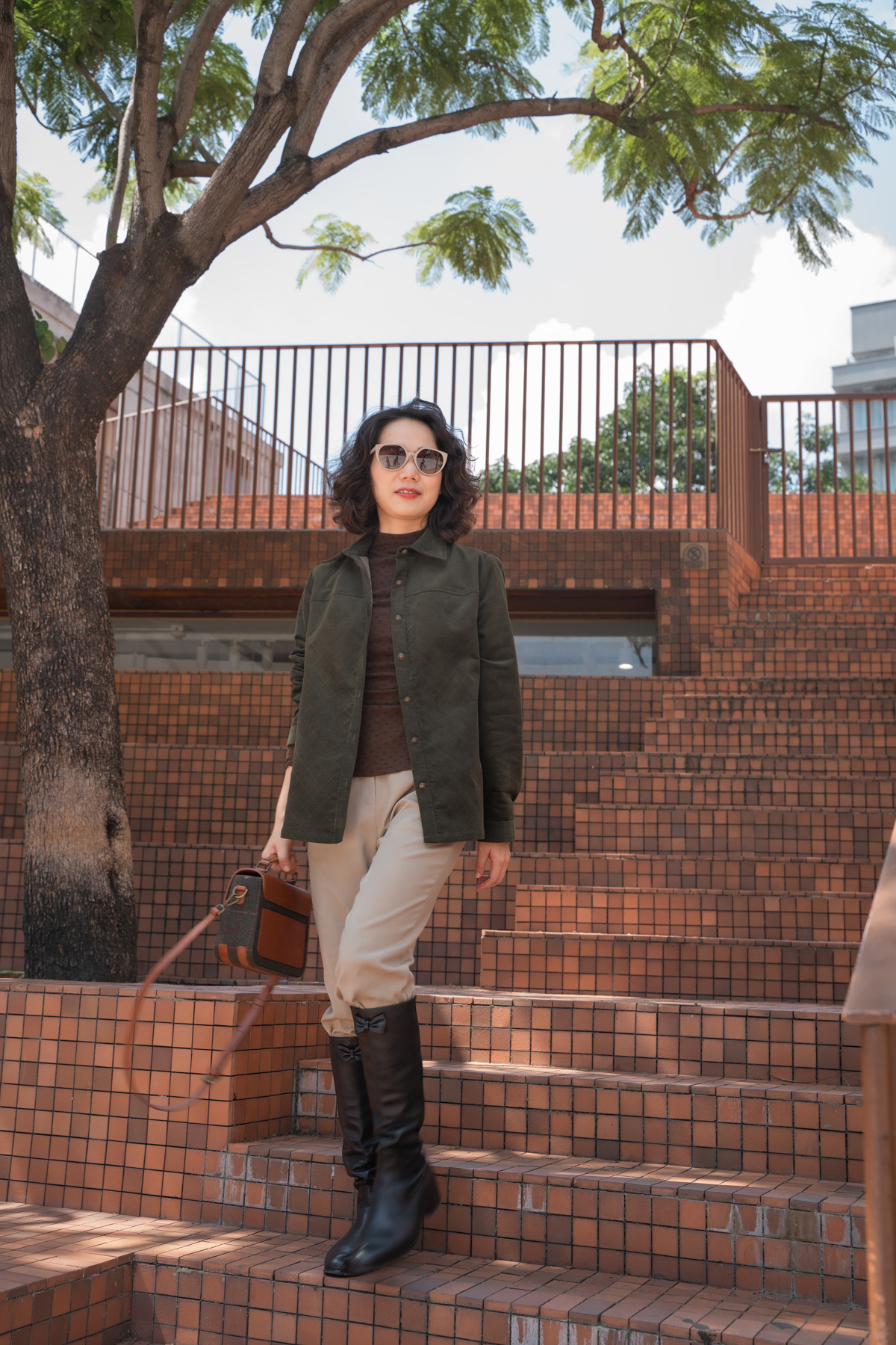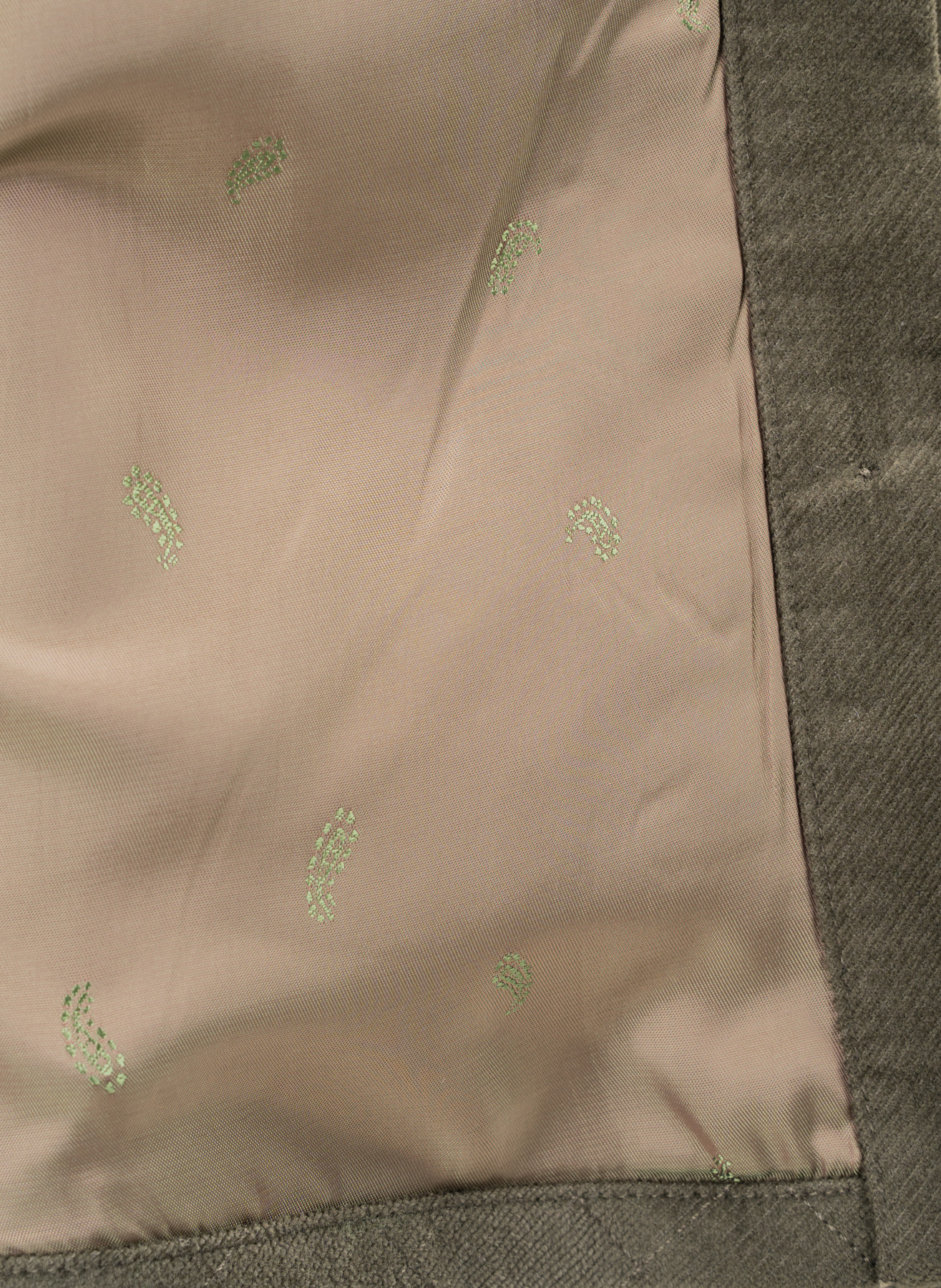 有故事的设计总是很迷人,“故事”也会因穿着者的生命历程而变得生动、隽永、丰富、精彩……“故事”的开头,是来自对永恒生命的向往,那一抹深沉的橄榄绿不畏时光的磨砺,总以谦和平稳积极的笔触书写,给人永不磨灭的希望。“故事”在进口平绒细腻的质感里书写温暖,精湛的车缝技术勾勒出若隐若现的菱形格纹,仿佛在复古纸页上描画书写的格式,规整精致,又赋予层次。再以古铜色金属扣做“标点”,充满怀旧的情感,是对美好时光的追忆与纪念……