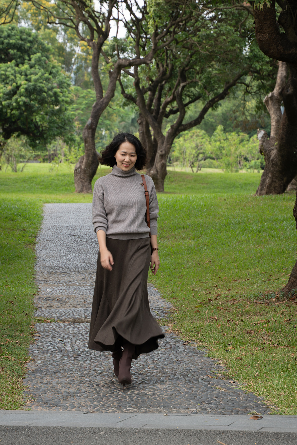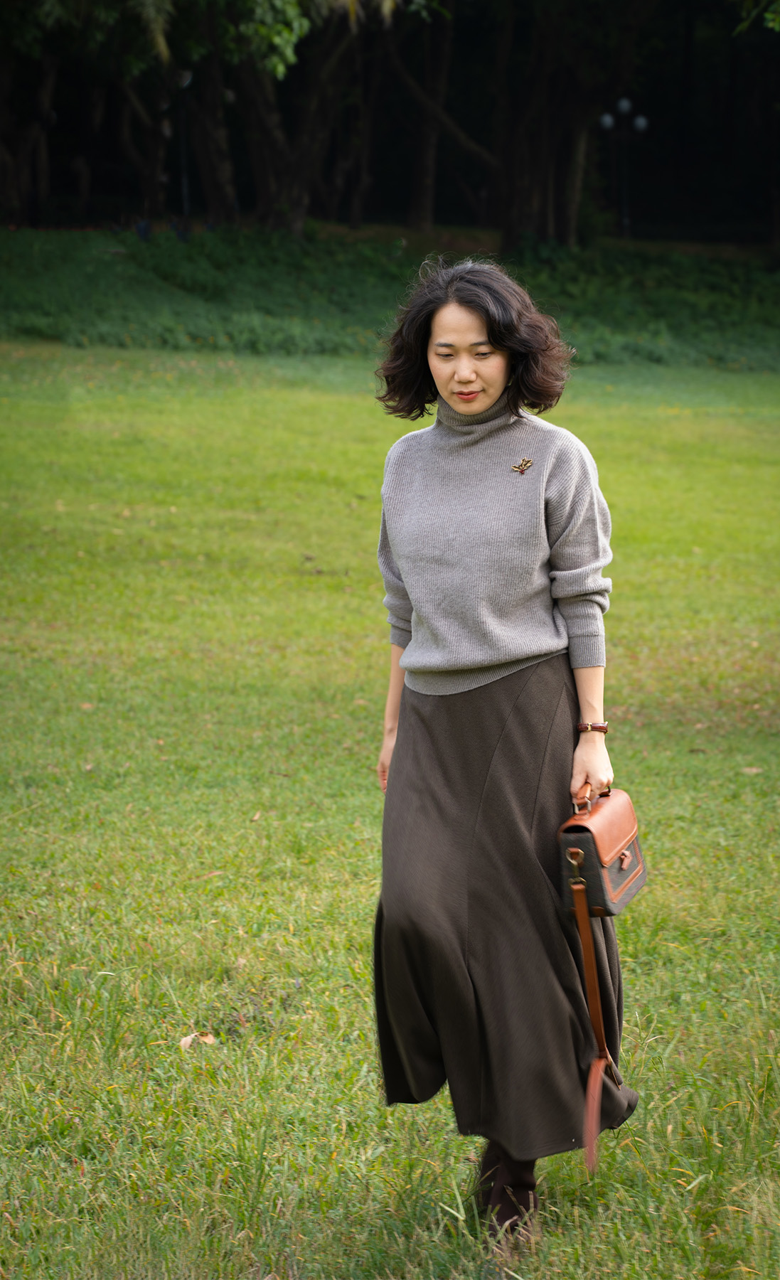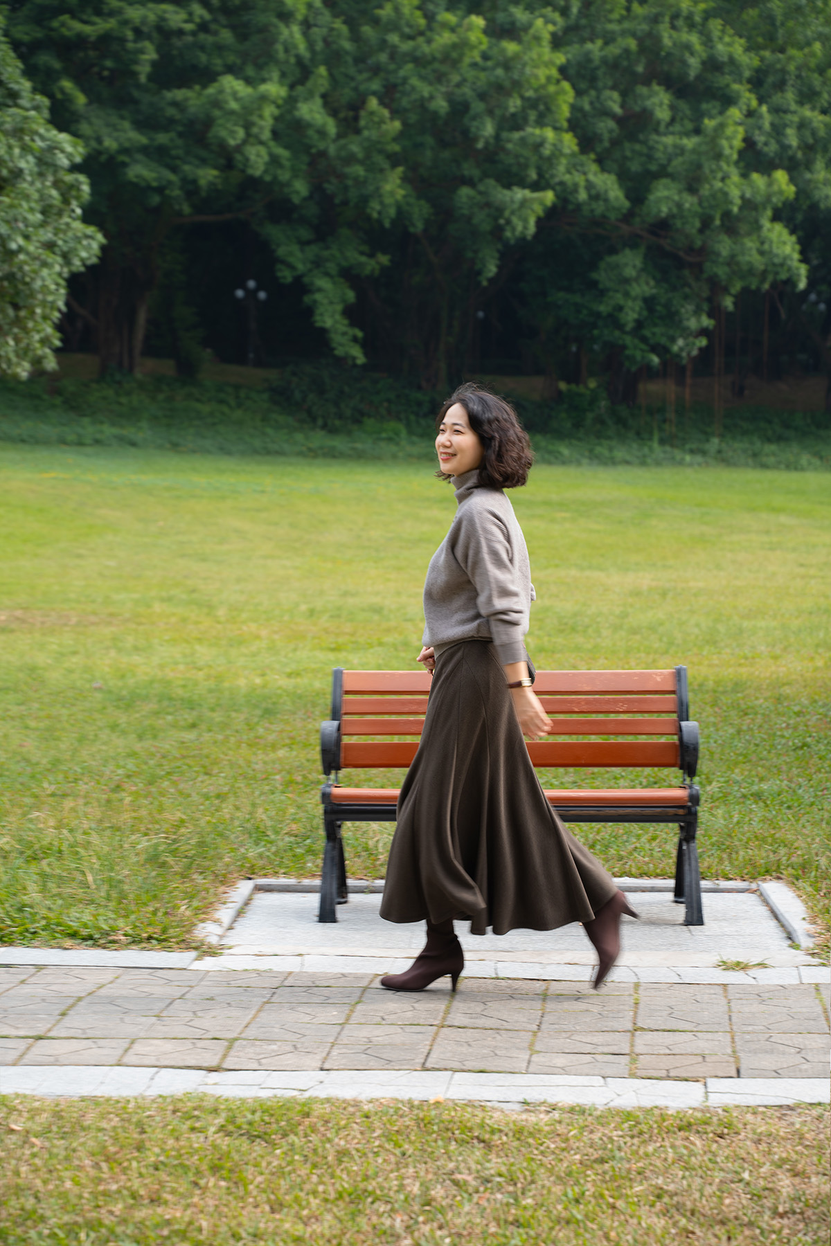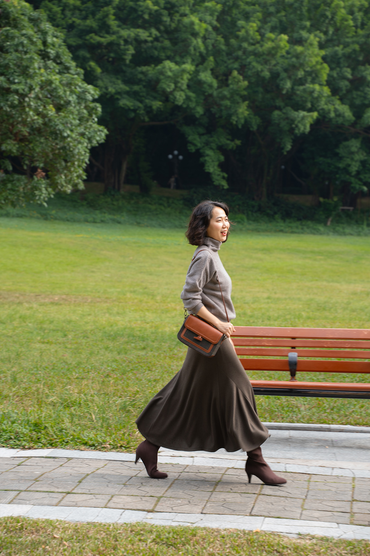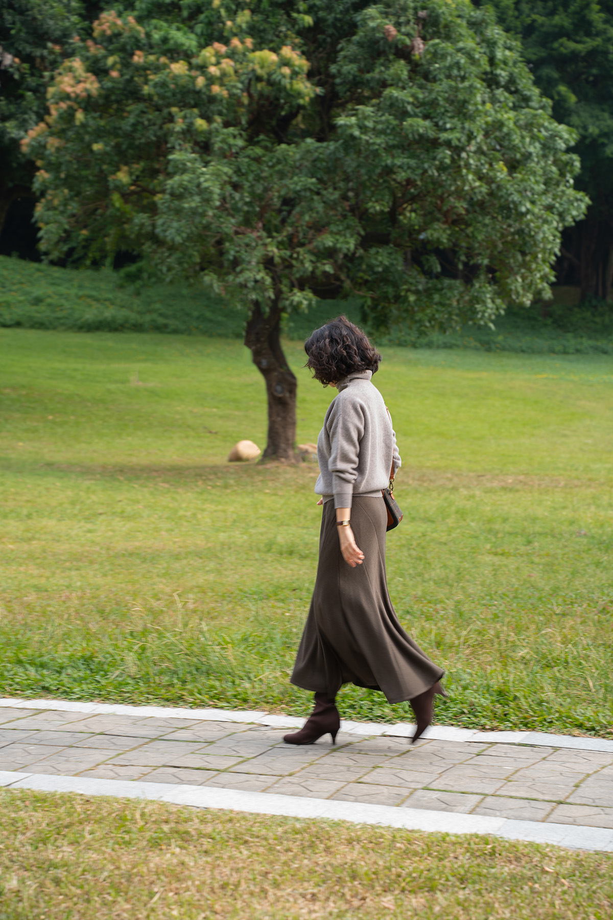 漫步者热爱老派的生活方式,走长长的路,说久久的话,不计算效率,只关乎真实,就像这款迷人半裙上的人字纹图案考究不张扬,历史悠久绵长,走入新时代却毫无慌乱,提醒忙碌者生活该回归安静与平和。漫步者的灵魂自由而独立,以行走的姿态寻找自然之光、生命之美,半裙雅致的绿色有复古文艺的气质,色泽仿佛取之于自然,浑然天成。浪漫,也是漫步者心灵的姿态,含有羊毛、棉、聚酯纤维等多种成分的面料,细腻温暖又呈现柔软的丝滑,侧边带有弧度的破缝设计流畅舒展、别具一格,小鱼尾裙的灵动让寒冷的厚重丝毫没有附着在优雅的生命中,站立时绵长,转动时轻摆,行走时飘逸,记述漫步时的抒情与悠扬……