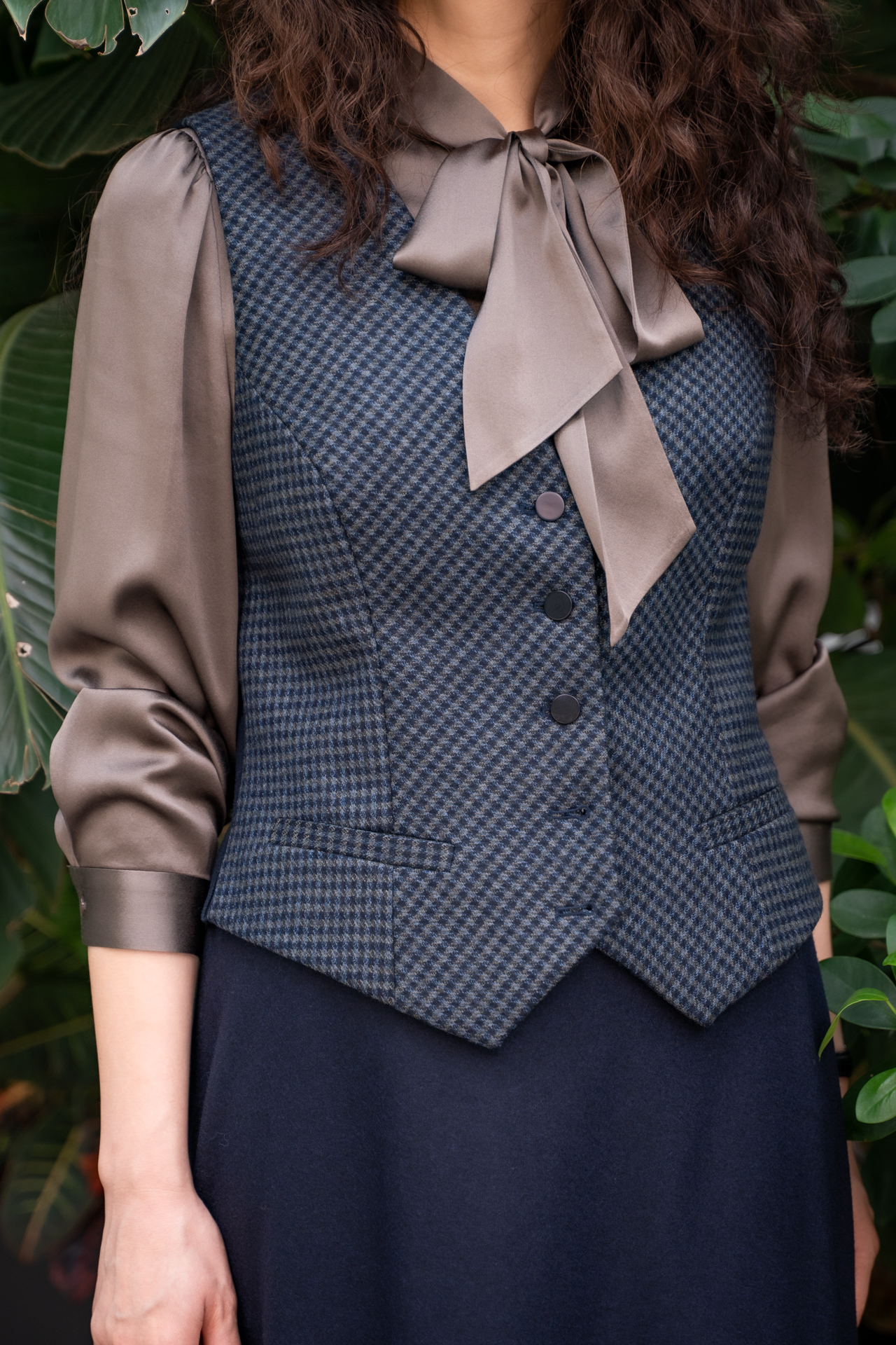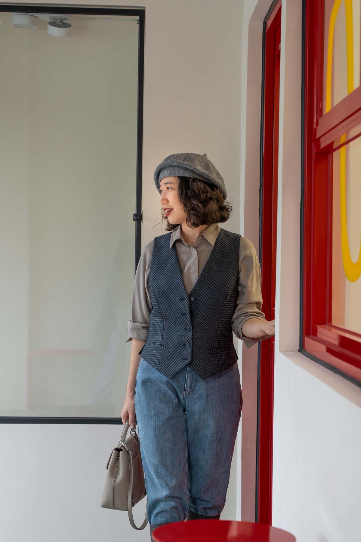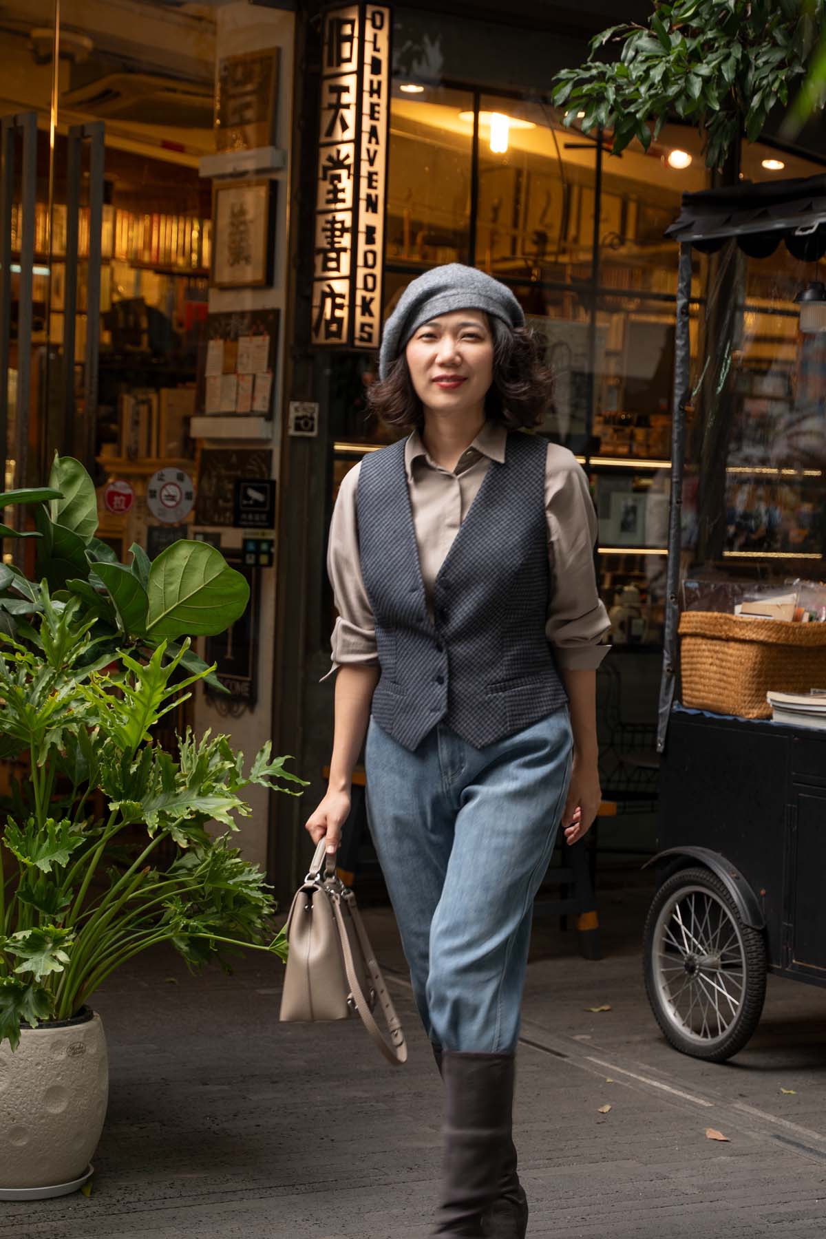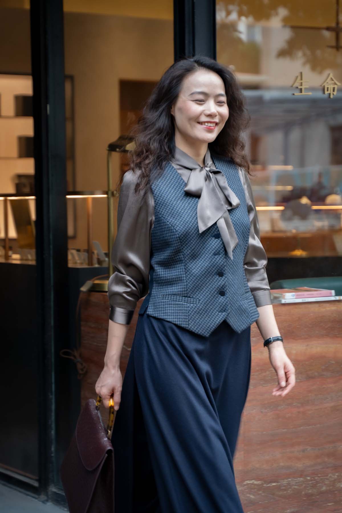 柔软的高品质羊毛与沉稳的色调,默契地达成了一种力量与柔美的平衡,藏蓝色与千鸟格前后相拼既丰富了层次感又起到视觉上的修饰,同时增强了马甲的搭配性。简洁经典的款式与版型设计,让其无论是内搭衬衫、针织衫打造通勤知性风,还是搭配毛衣、大衣营造冬日的智慧穿搭典范,都能凭借纯羊毛的优质质感、格纹与净色的拼色巧思,以及经典耐品的款式,成为衣橱中兼具实用性与时髦感的百搭单品,轻松提升整体造型的精致度。