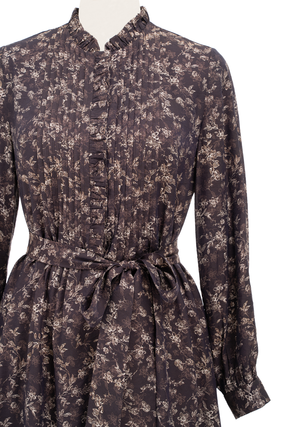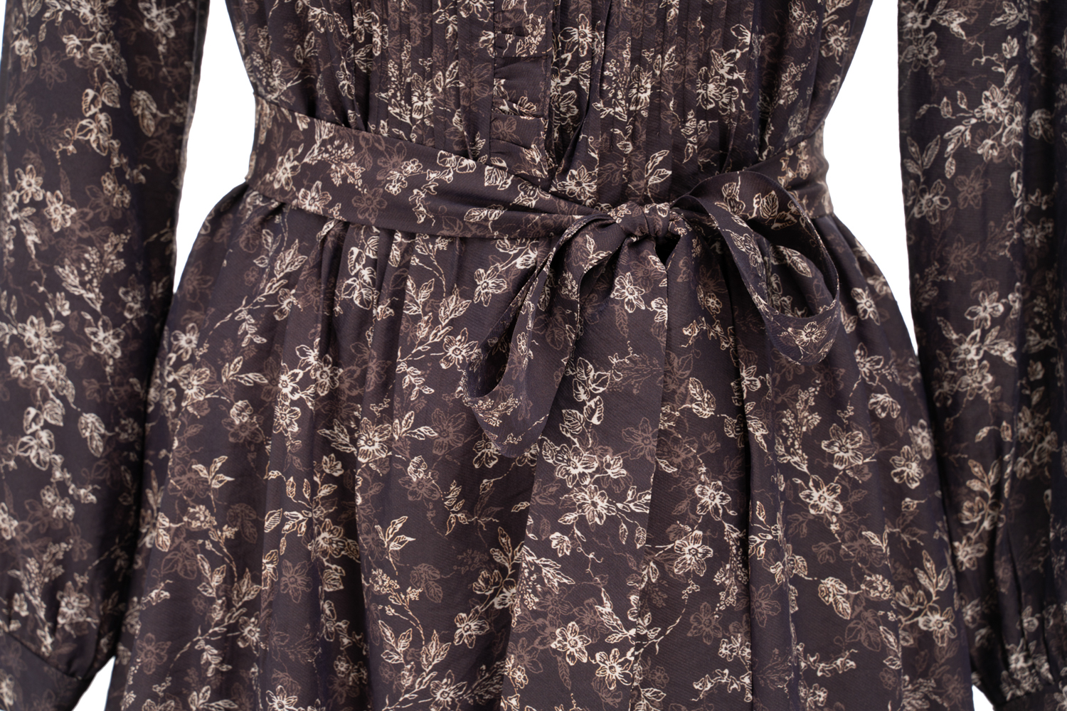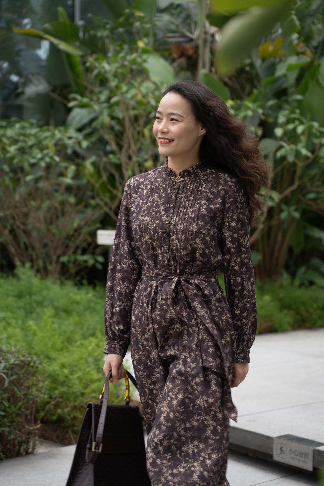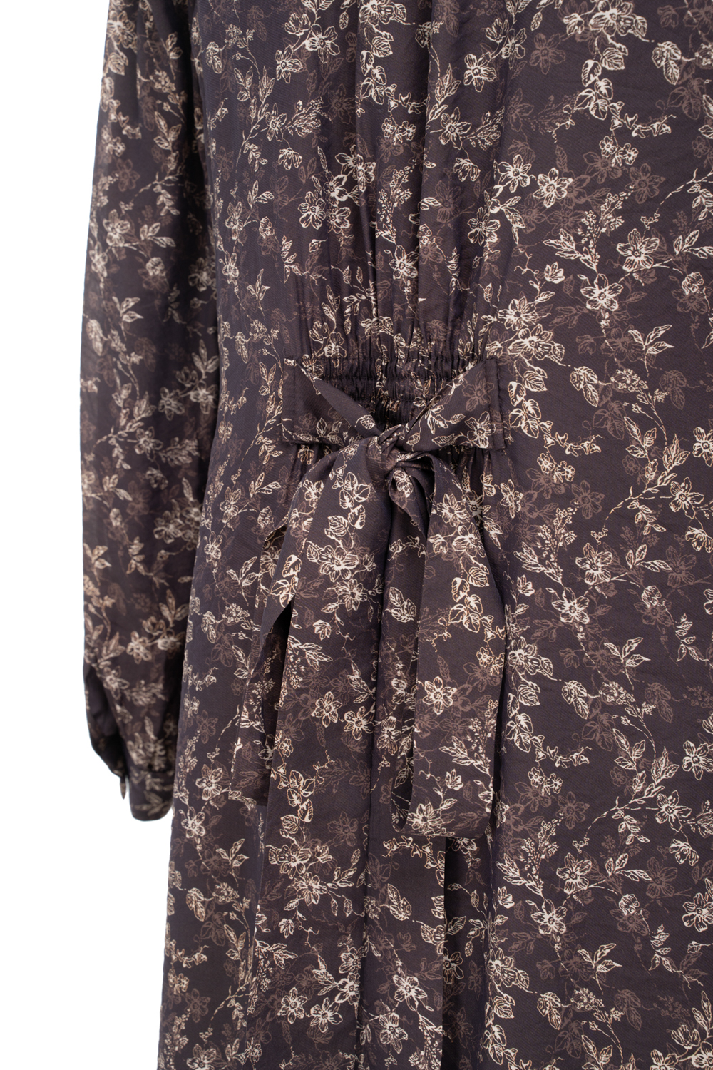 香醇浓郁的咖啡色上铺陈绽放卡其色的花朵,这一色彩图案以及精美的领口、门襟和风琴褶都在一一诉说着古典的精致与浪漫情怀,宽松的版型带来纯真的气息同时为保暖奠定妥帖而优雅的基调,巧妙的腰带设计为穿着带来不同的精彩展现。