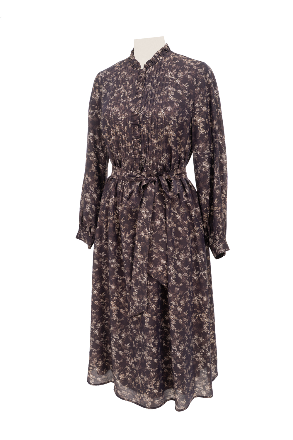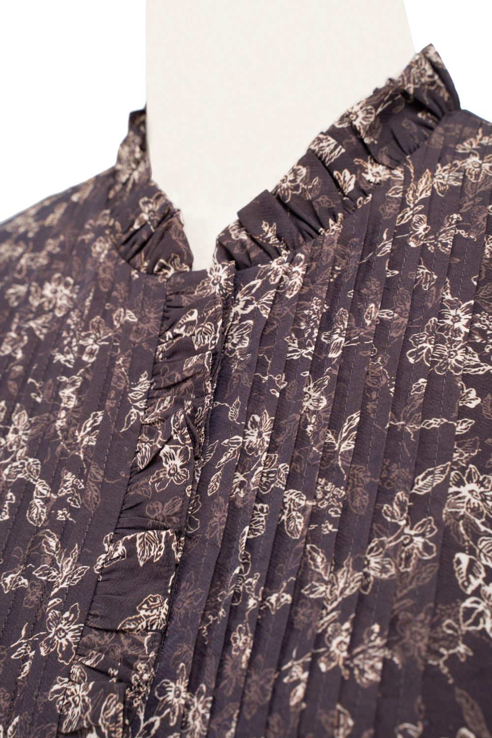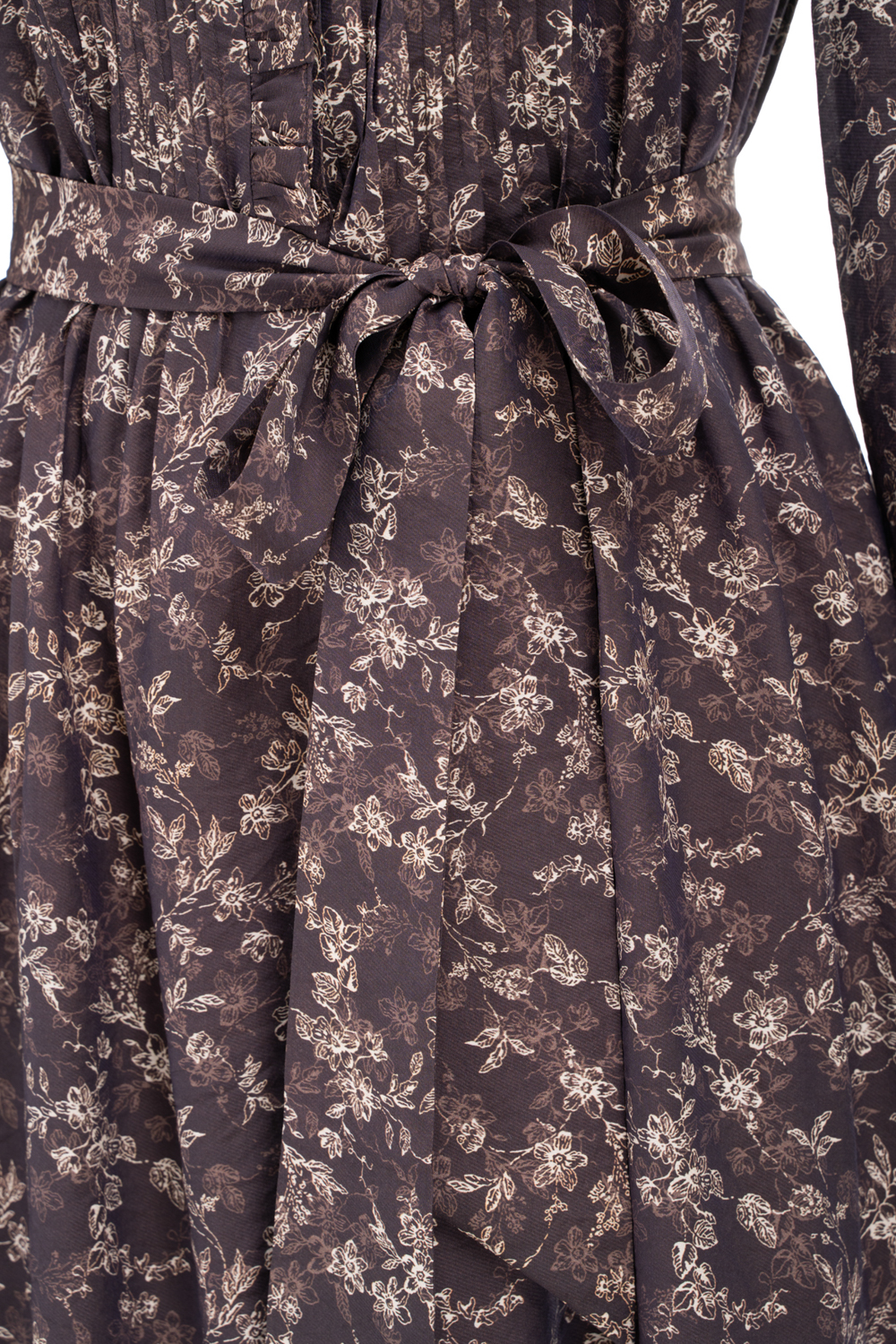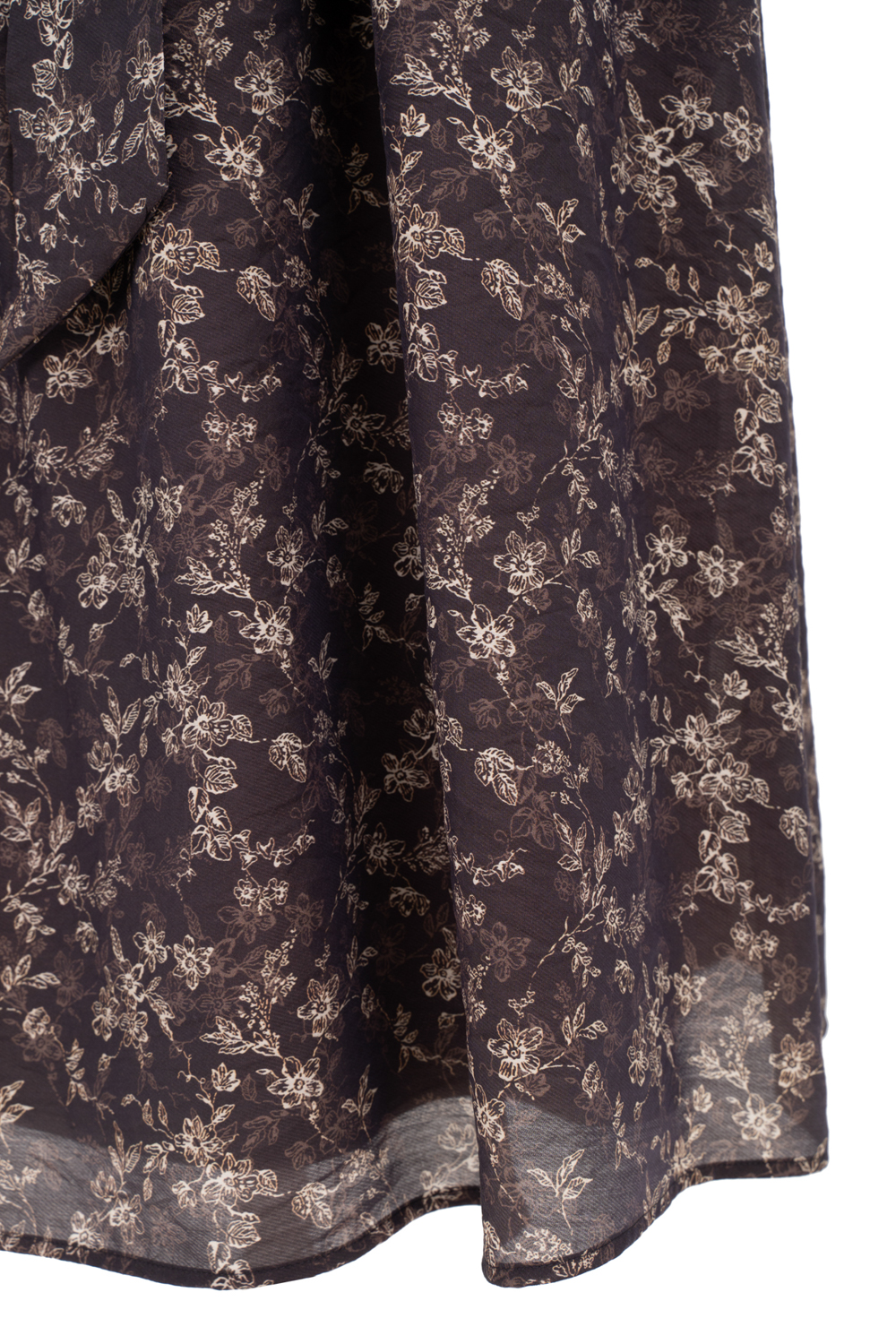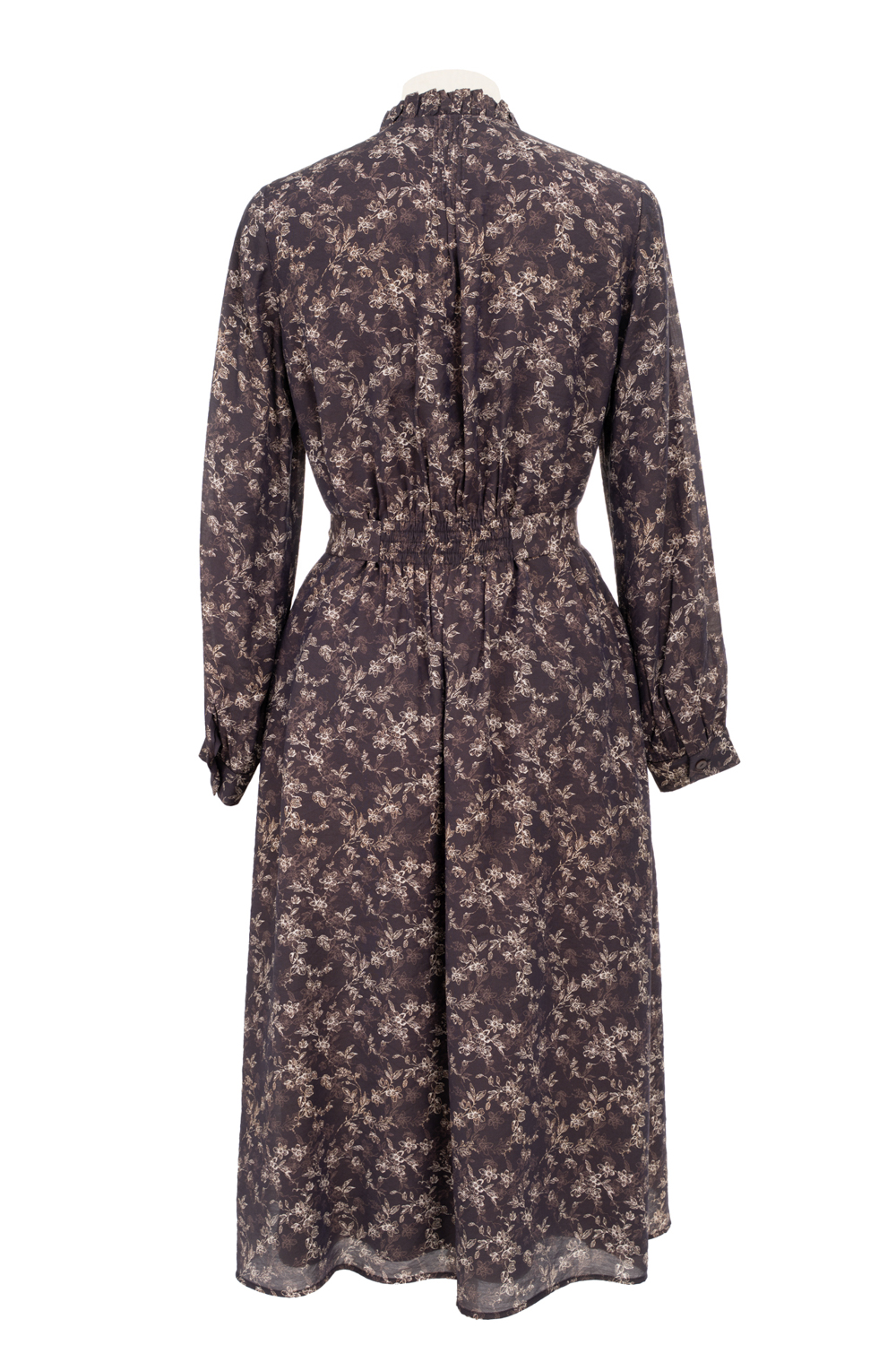 香醇浓郁的咖啡色上铺陈绽放卡其色的花朵,这一色彩图案以及精美的领口、门襟和风琴褶都在一一诉说着古典的精致与浪漫情怀,宽松的版型带来纯真的气息同时为保暖奠定妥帖而优雅的基调,巧妙的腰带设计为穿着带来不同的精彩展现。