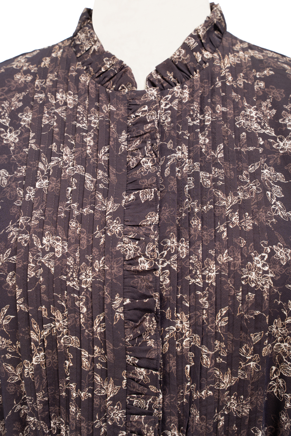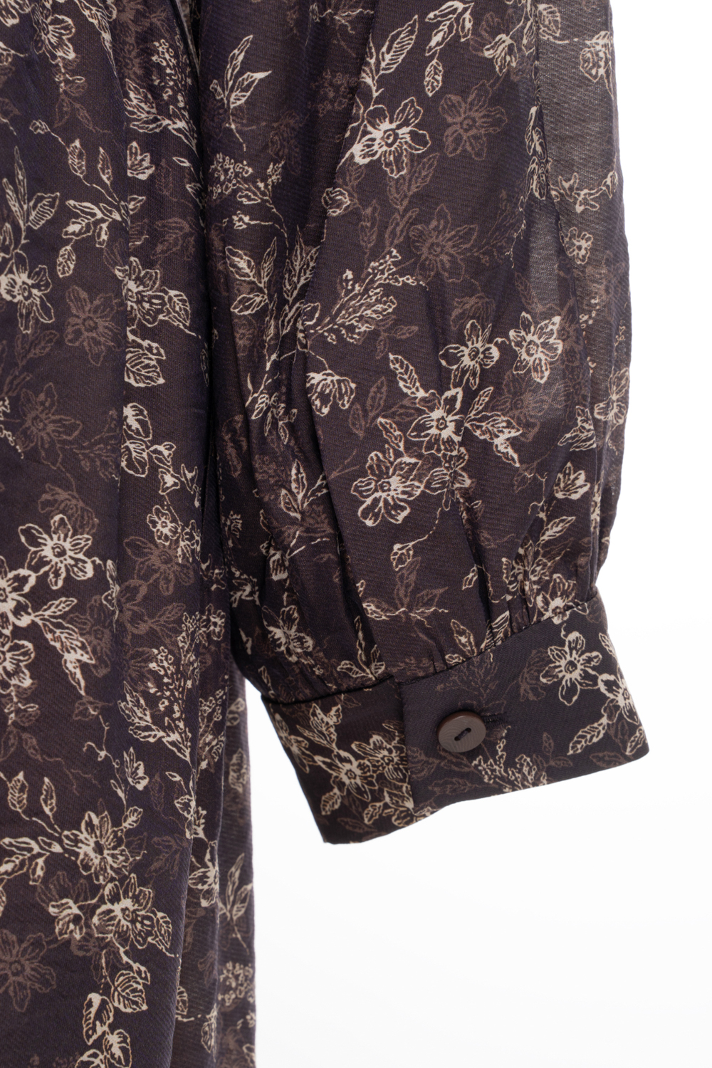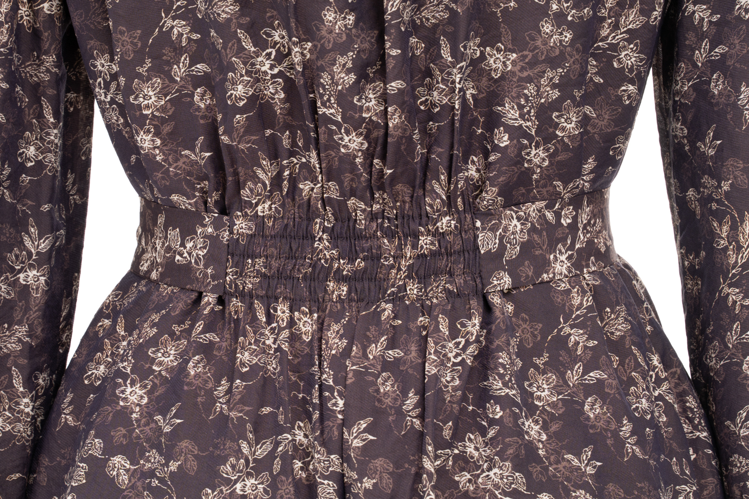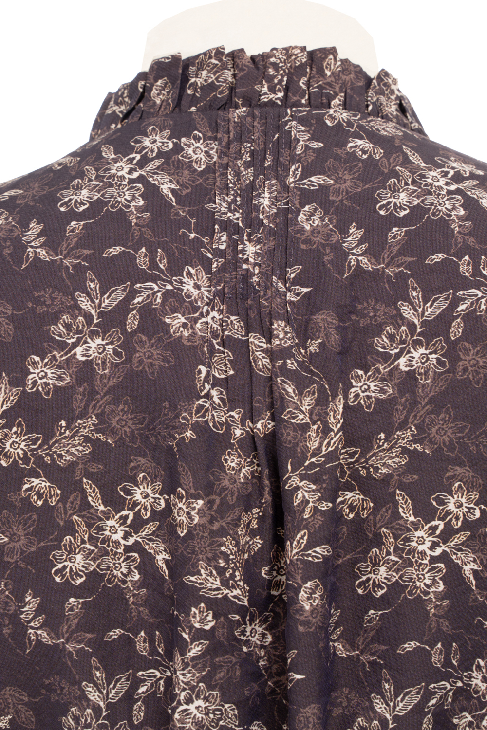 香醇浓郁的咖啡色上铺陈绽放卡其色的花朵,这一色彩图案以及精美的领口、门襟和风琴褶都在一一诉说着古典的精致与浪漫情怀,宽松的版型带来纯真的气息同时为保暖奠定妥帖而优雅的基调,巧妙的腰带设计为穿着带来不同的精彩展现。