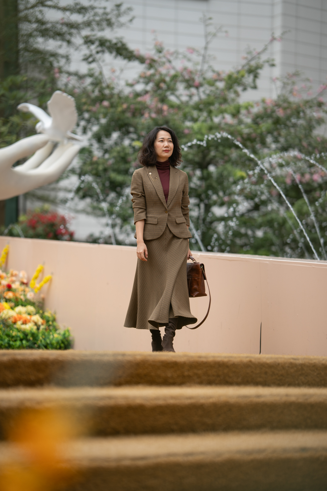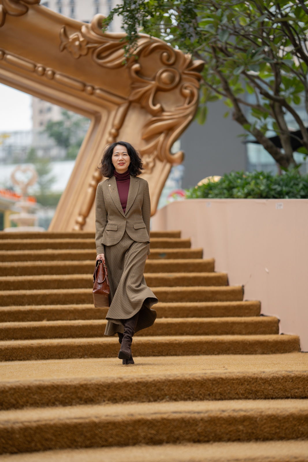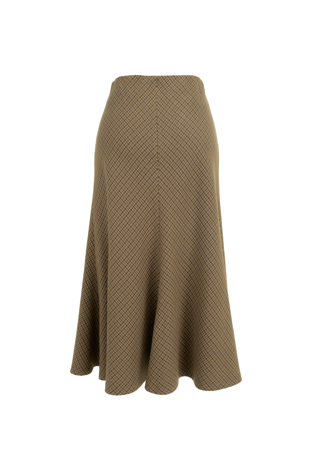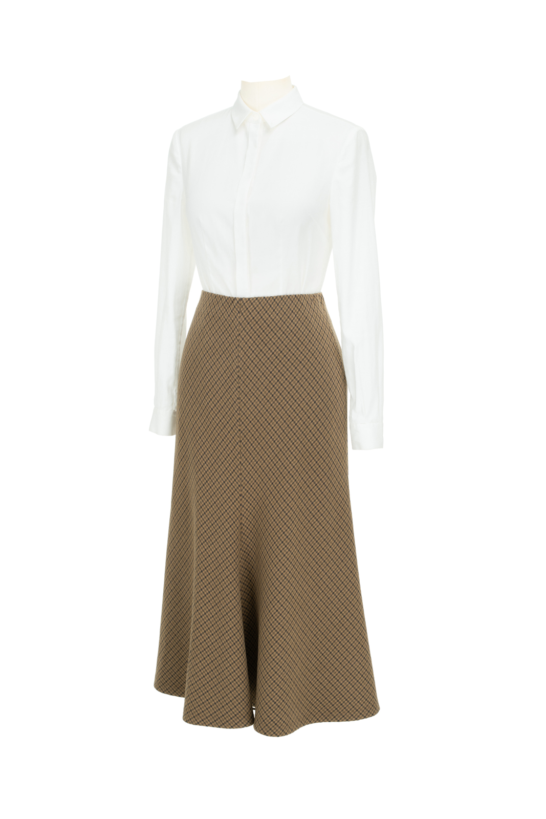 “我的坚持”会在时间的检验中脱颖而出,不突兀的表达正是它被铭记的关键。谦逊的灰与诚恳的褐交织,再现千鸟格的隽永与经典。进口聚酯纤维面料良好的悬垂性和挺括的特点,使斜裁设计的优势更为突出,令半裙修长流畅、有款有型,优美的鱼尾富有灵动韵律。可与“我的坚持”Jacket搭配穿着,呈现套装式穿着的整体性,亦可搭配不同类型的上衣,穿出冬日长裙的柔美,以及持守经典的格调。