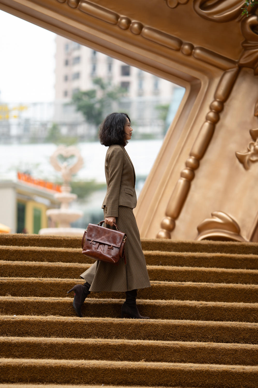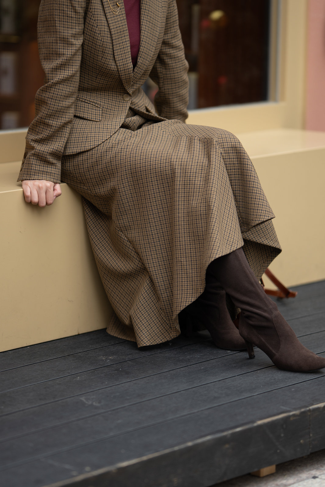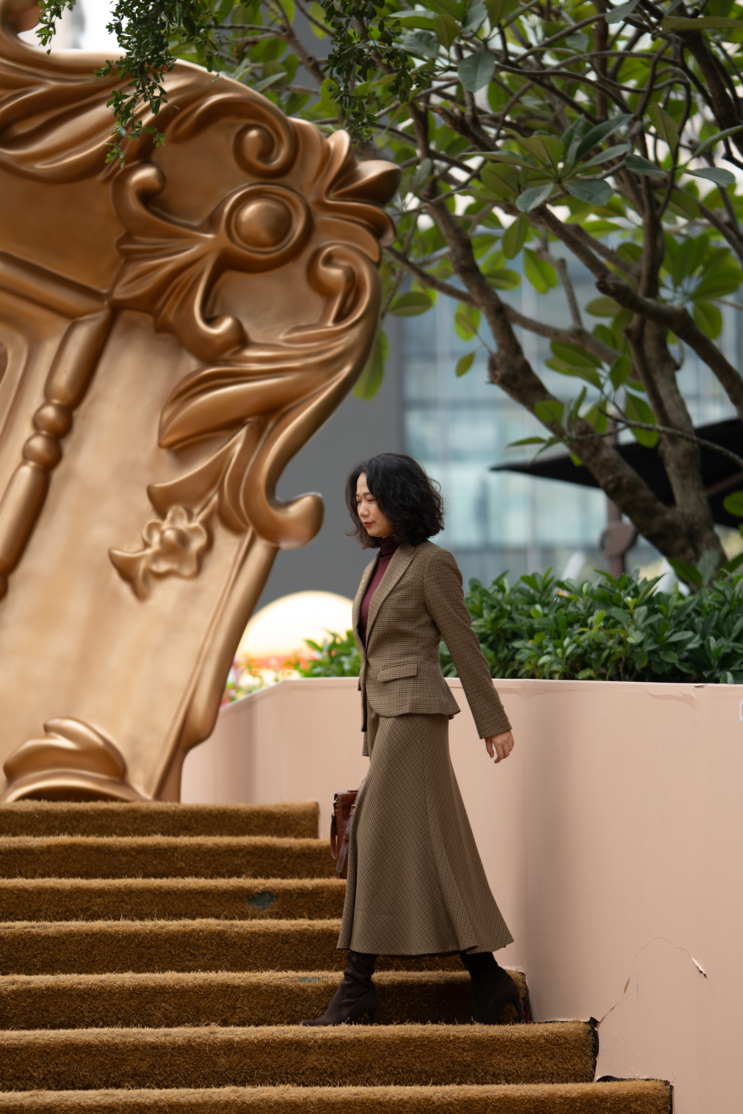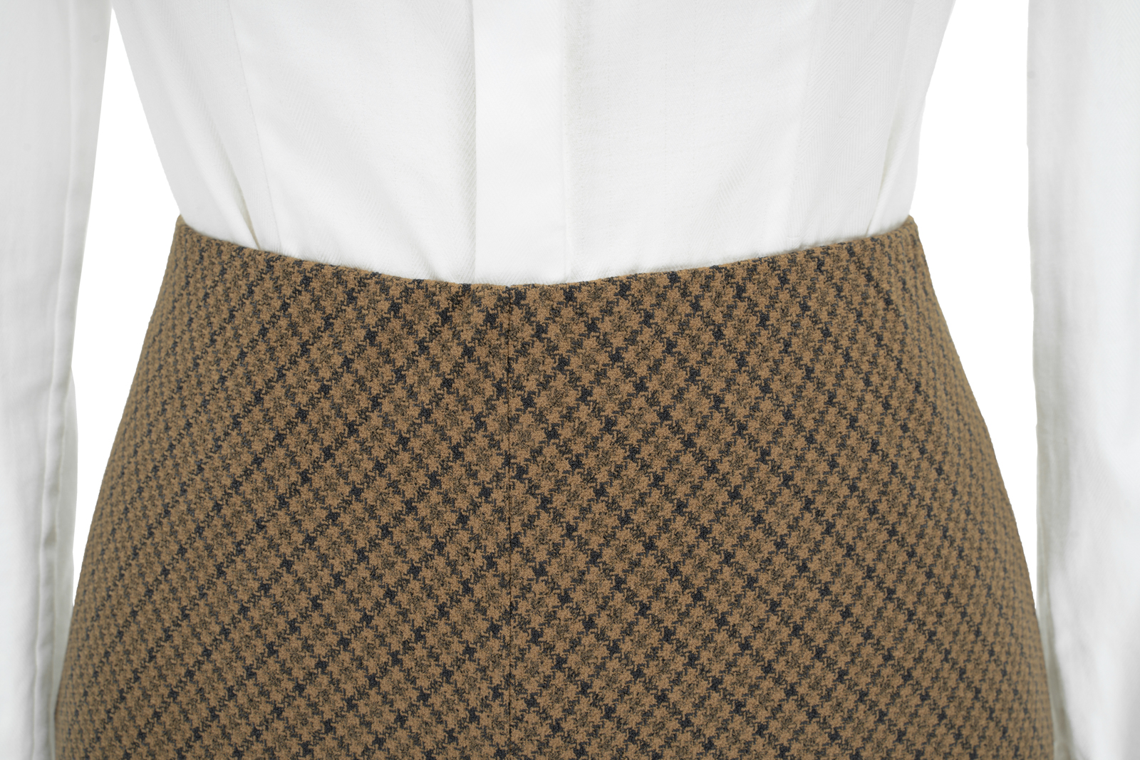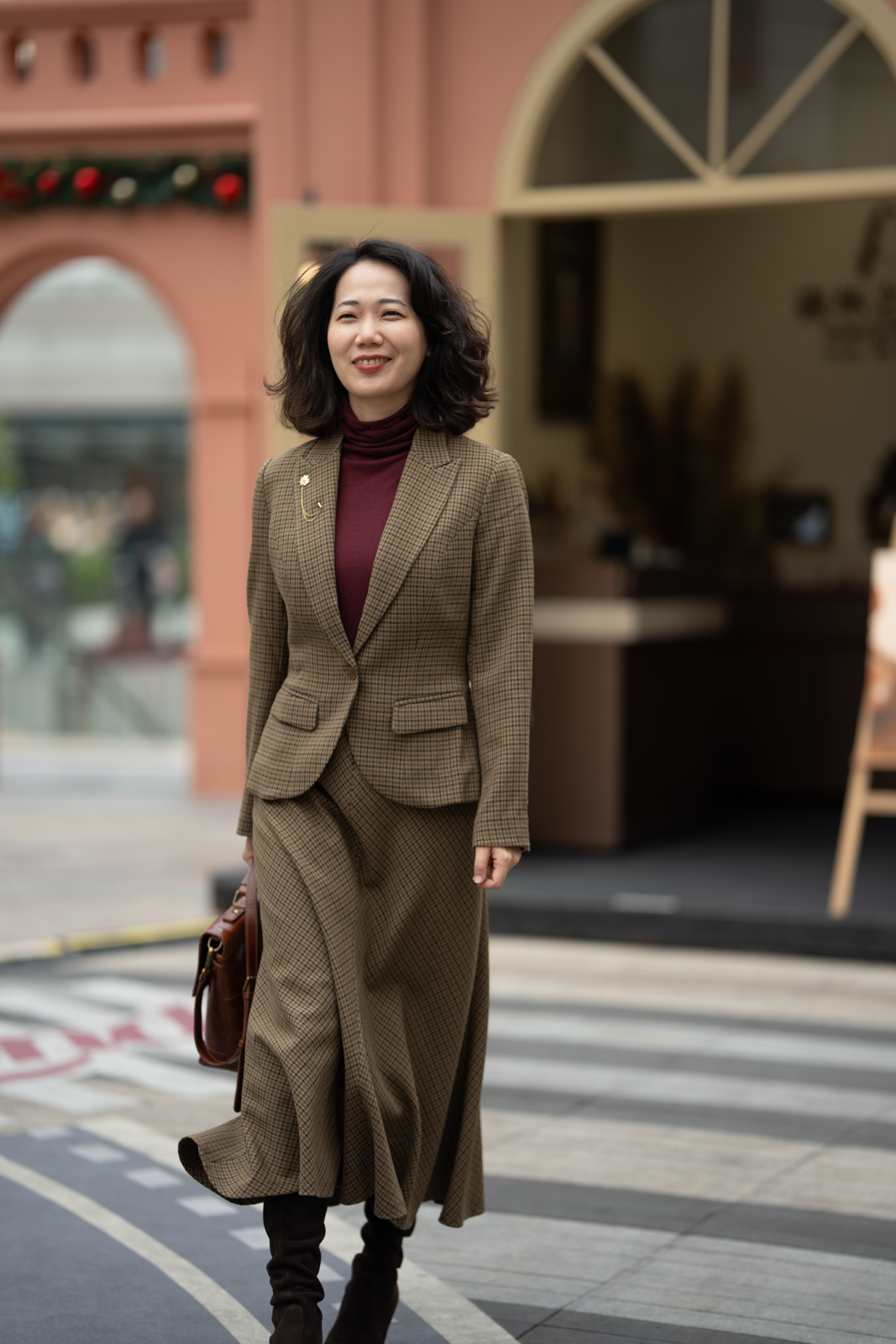 “我的坚持”会在时间的检验中脱颖而出,不突兀的表达正是它被铭记的关键。谦逊的灰与诚恳的褐交织,再现千鸟格的隽永与经典。进口聚酯纤维面料良好的悬垂性和挺括的特点,使斜裁设计的优势更为突出,令半裙修长流畅、有款有型,优美的鱼尾富有灵动韵律。可与“我的坚持”Jacket搭配穿着,呈现套装式穿着的整体性,亦可搭配不同类型的上衣,穿出冬日长裙的柔美,以及持守经典的格调。