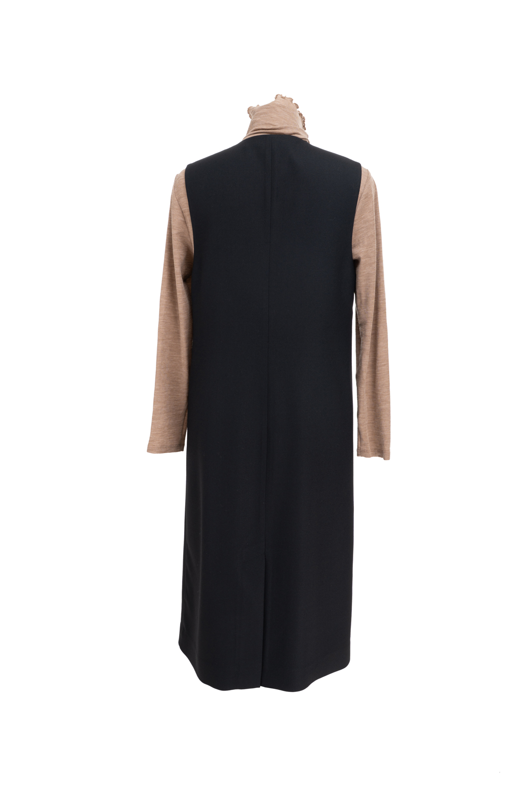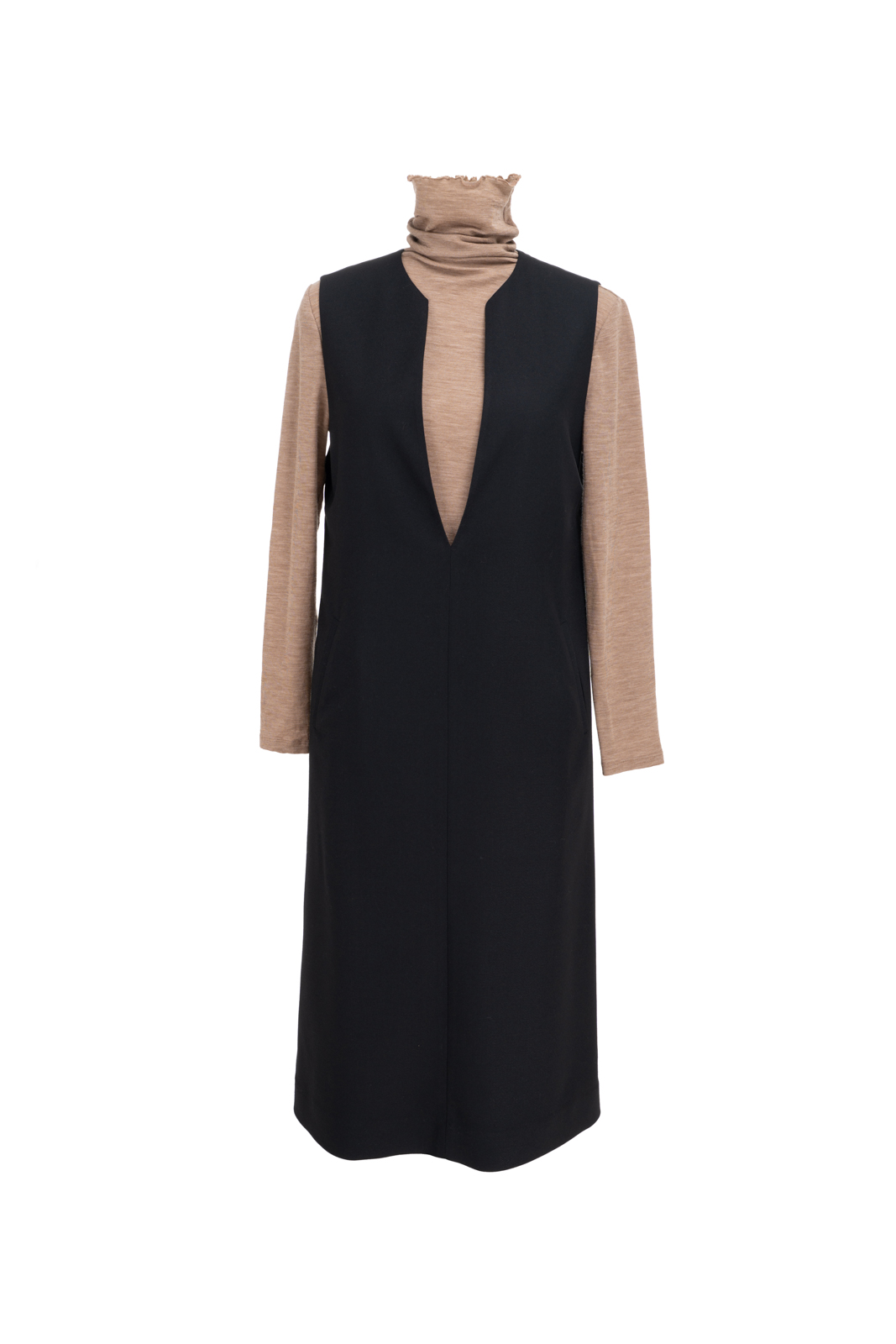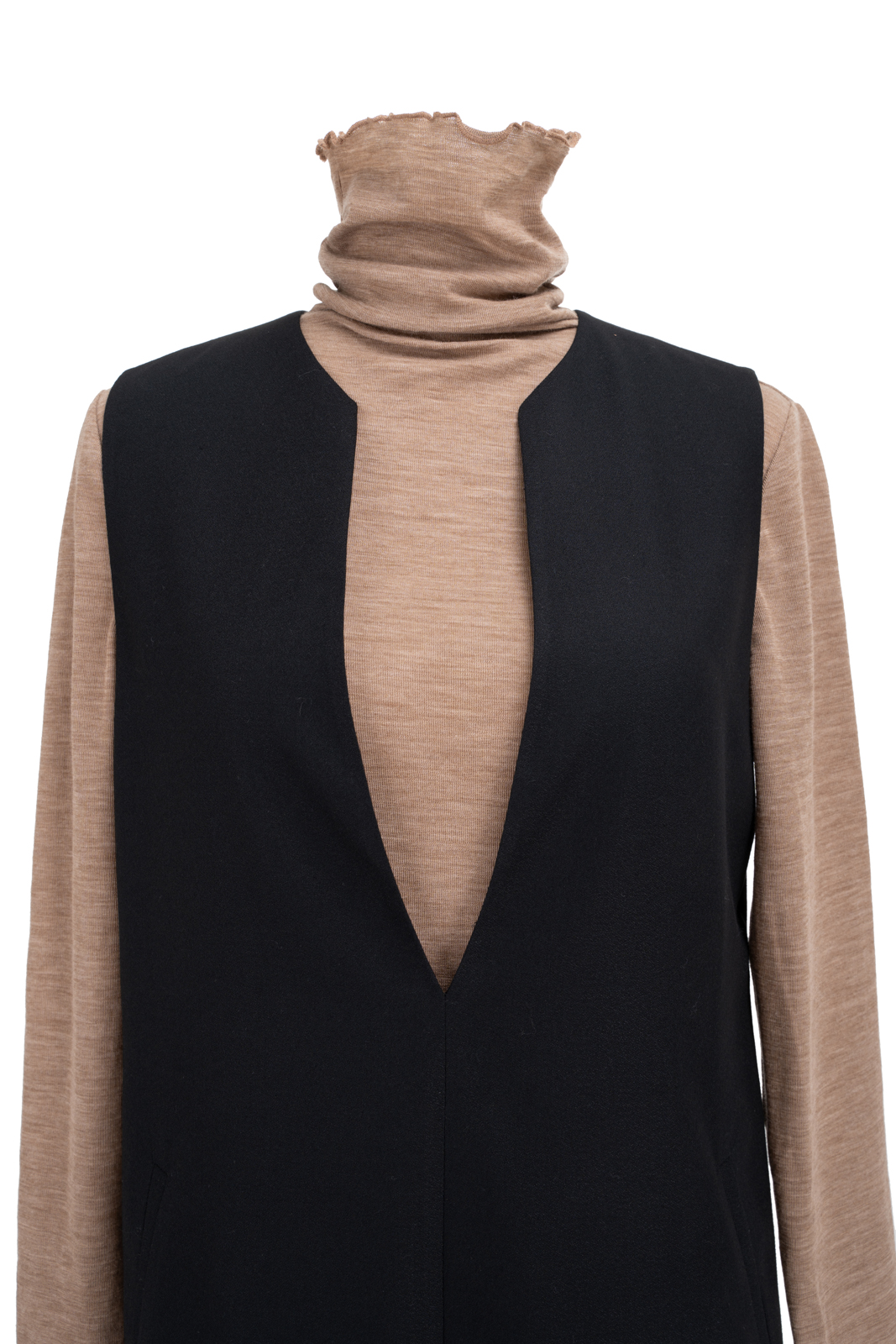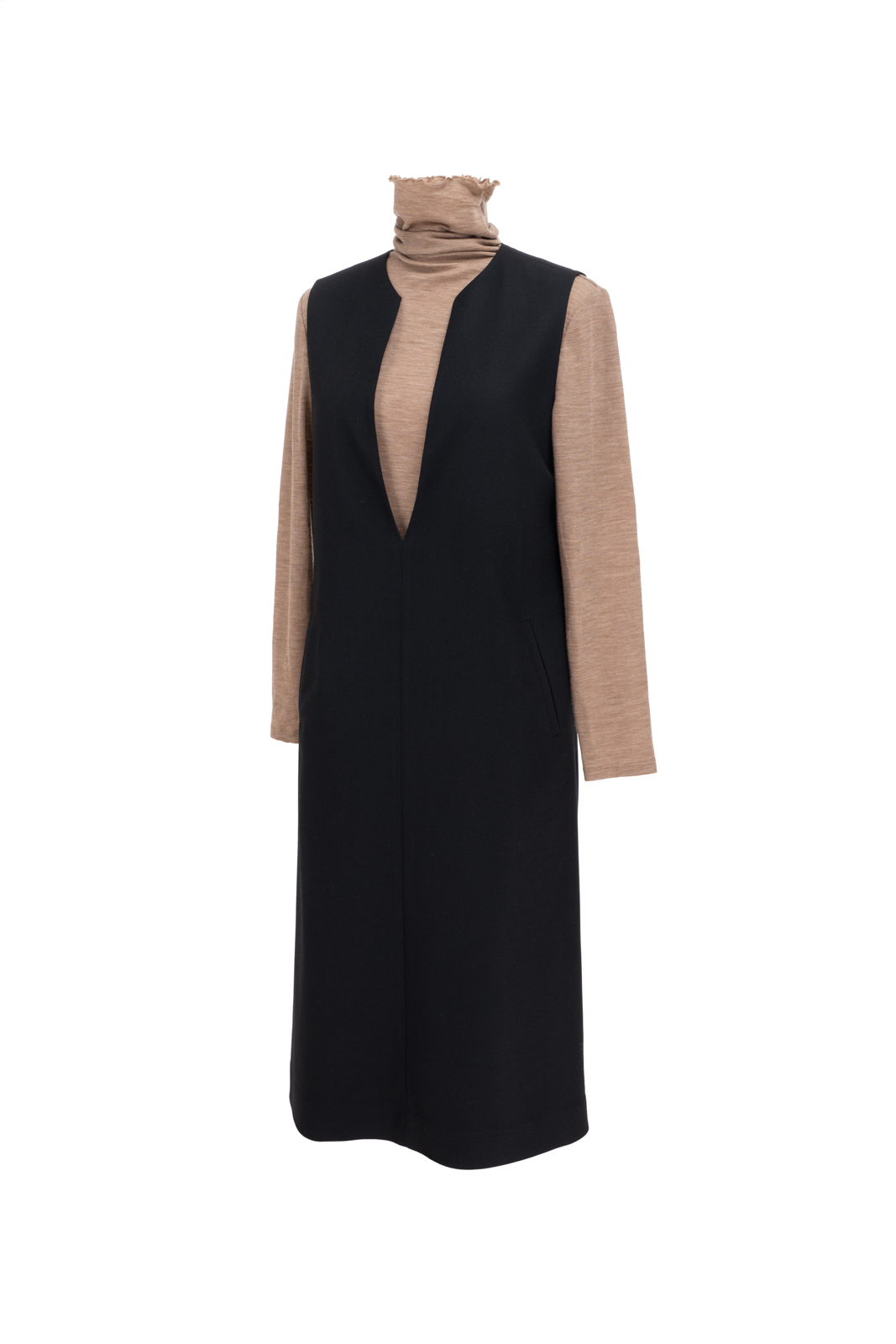 无袖V领罩衫就像衣橱中一位亲切的心照不宣的老朋友,用它智慧的搭配性为淑女带下经典而永恒的形象。高品质的黑色精纺羊毛结合简约流畅、恰到好处的H轮廓,极具修身效果,令穿着者更显高挑曼妙;巧妙且恰如其分的领型设计,为内搭服饰留下精彩表现的空间,同时更添年轻活泼的气息;贴心的插袋为双手带来可安放之处,展现随意迷人的造型。它,看似深沉内敛,却以忠诚和智慧守护着淑女隽永的优雅之态!