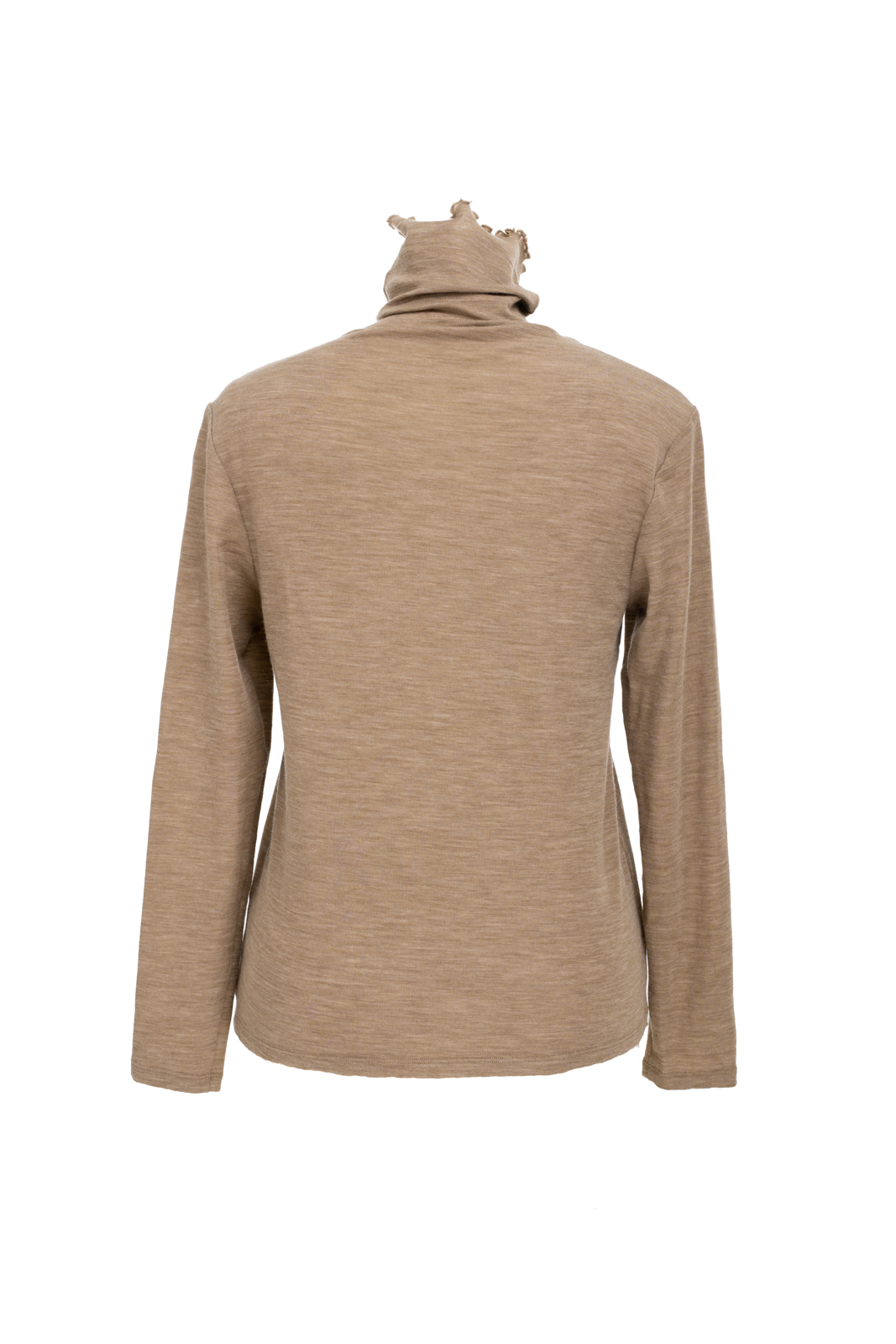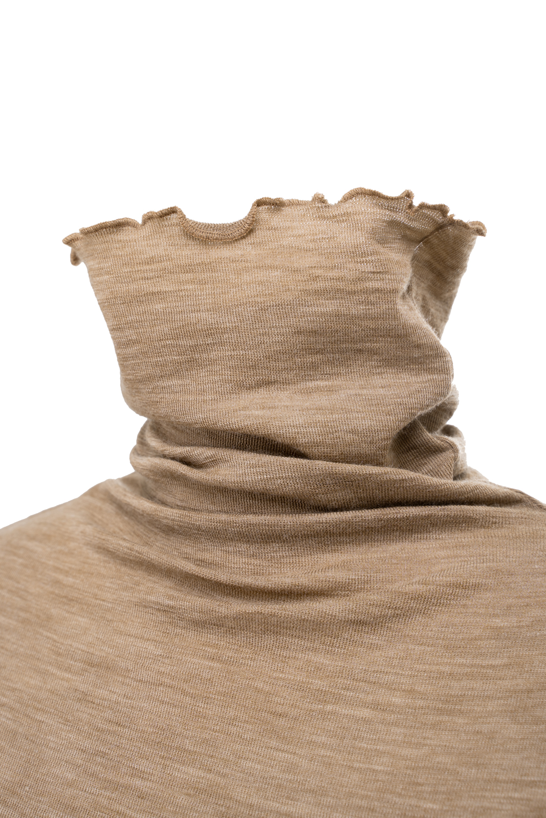羊毛、羊绒及桑蚕丝面料铸就了它高贵不凡的品质,它柔软绵薄却温暖体贴,如诗一般织就而成;松弛有度的版型令穿着大方妥帖,作为内搭细腻紧致,作为外穿能够包容内里的加添,无论在内在外都能让淑女温暖得体。一贯而上的高领设计尽显优雅随意的气质,可为脖颈带来温暖而美丽的呵护,也可变换造型丰富形象表达。驼色的雅致在于它以温和的色彩语言为冬日的沉闷带来了轻盈、清新和淡金色的明媚,为经典衣橱注入温暖柔和的力量!