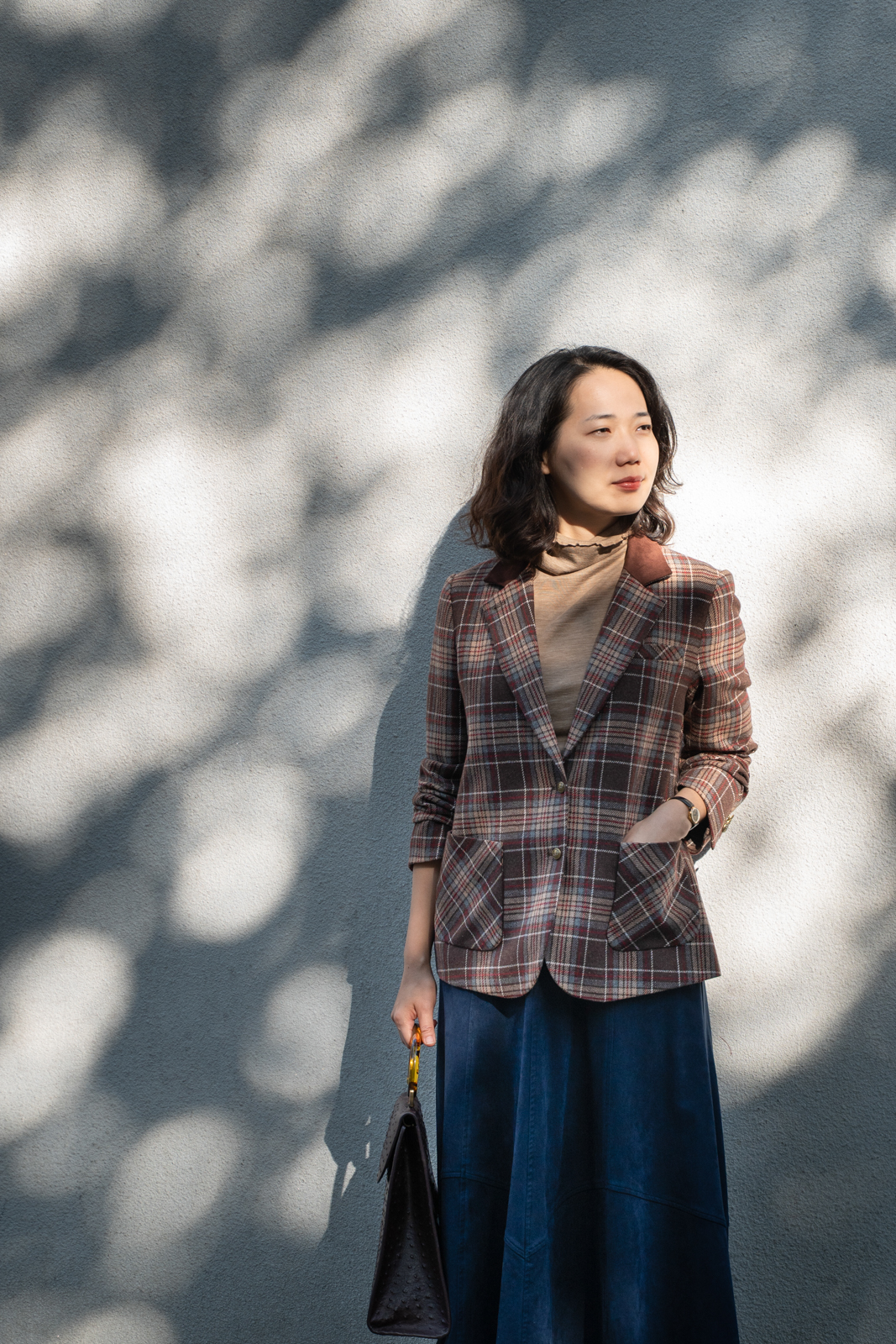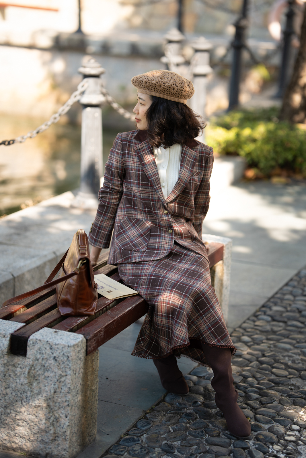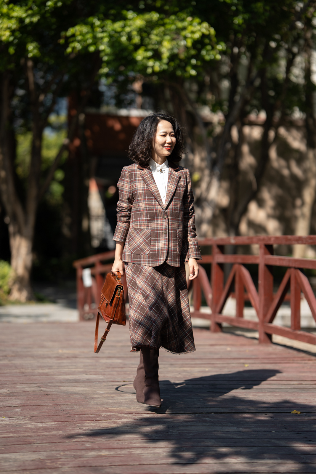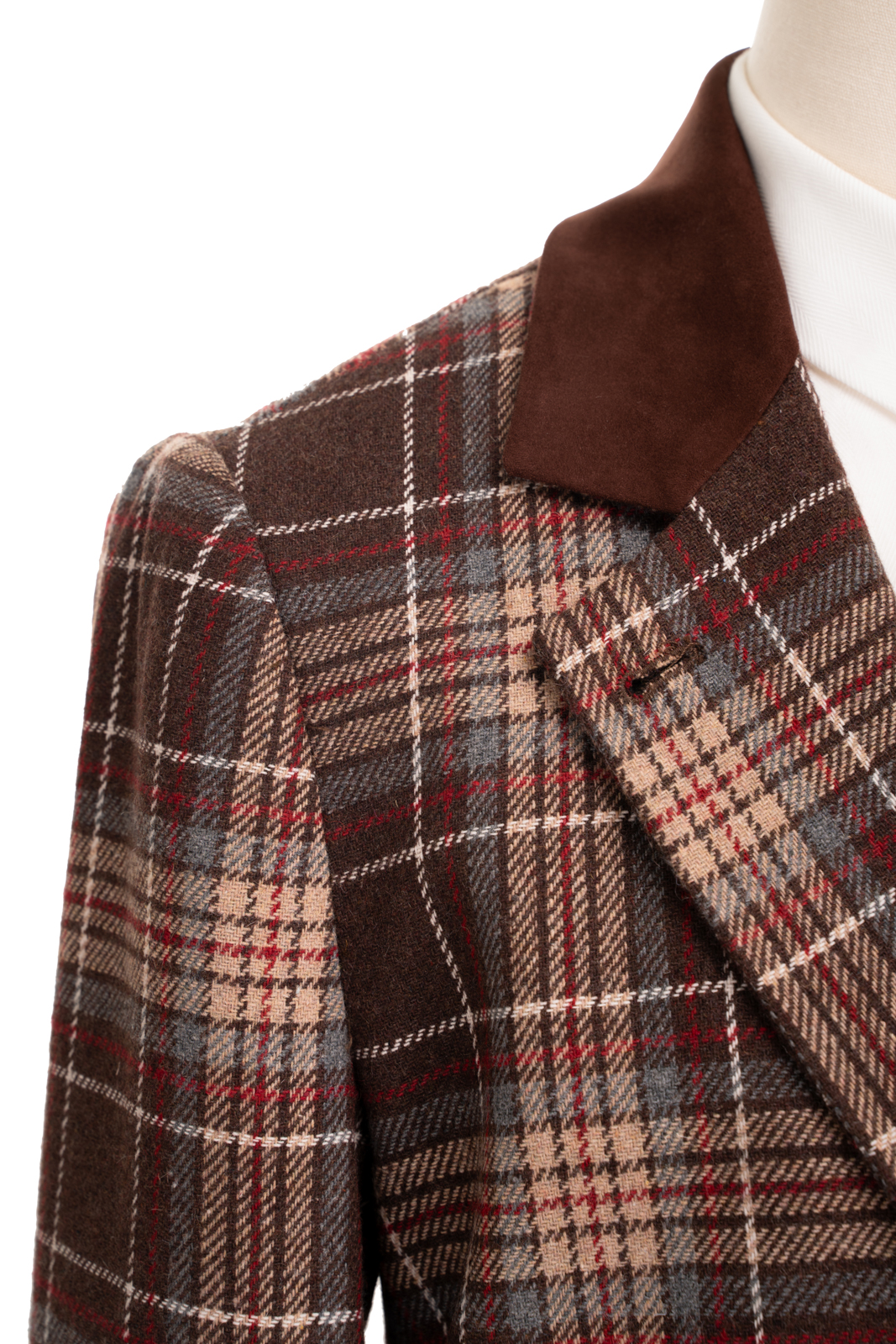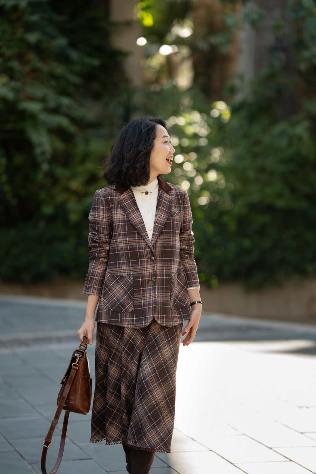 古老的苏格兰格纹,用经纬线编织的史诗与文化的传承,不断在时尚里重现。交织的格纹仿佛吟诵不尽的英伦诗行,在光影流转间被反复品读传诵……格纹jacket与生俱来复古文艺的学院风从古至今都备受智识淑女们的青睐,亦是经典穿着的典范。宽松有度的版型带来穿着上的从容舒适,经典的平驳领上领拼入咖色麂皮,既能让脖颈处有更舒适的体感,同时也渲染了迷人的英伦风尚。衣身两侧的贴袋设计堪称点睛之笔,采用巧妙的斜纹剪裁工艺,丰富了视觉层次感,也让双手拥有了可安放之处……