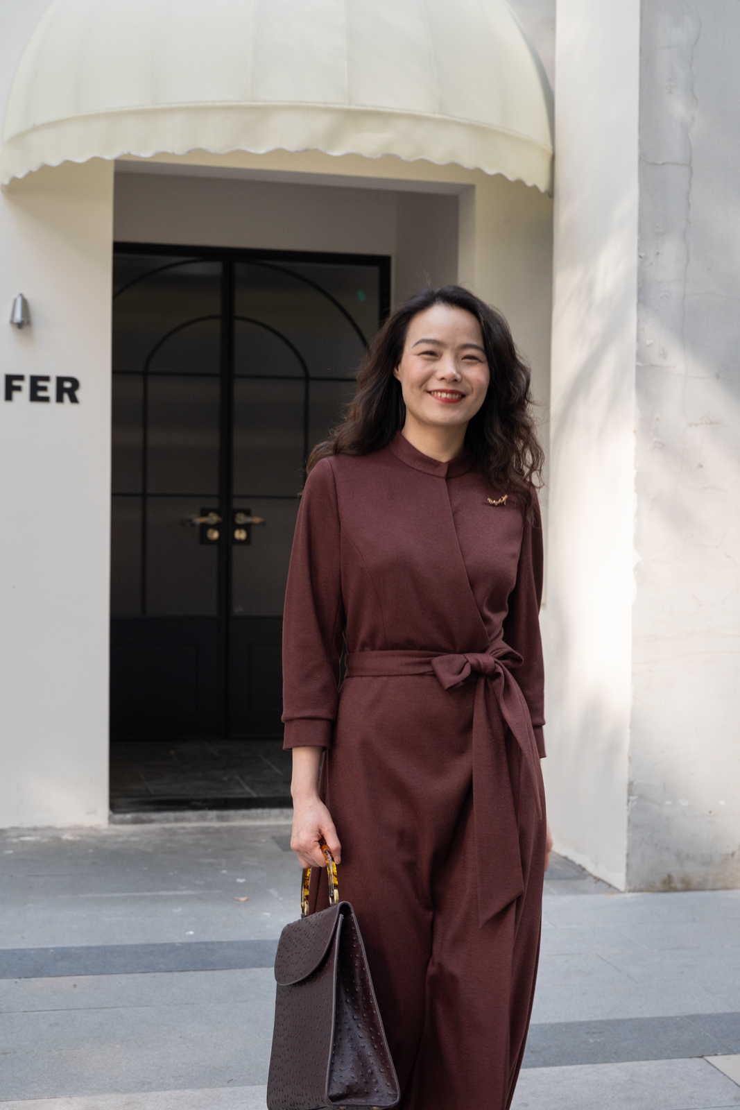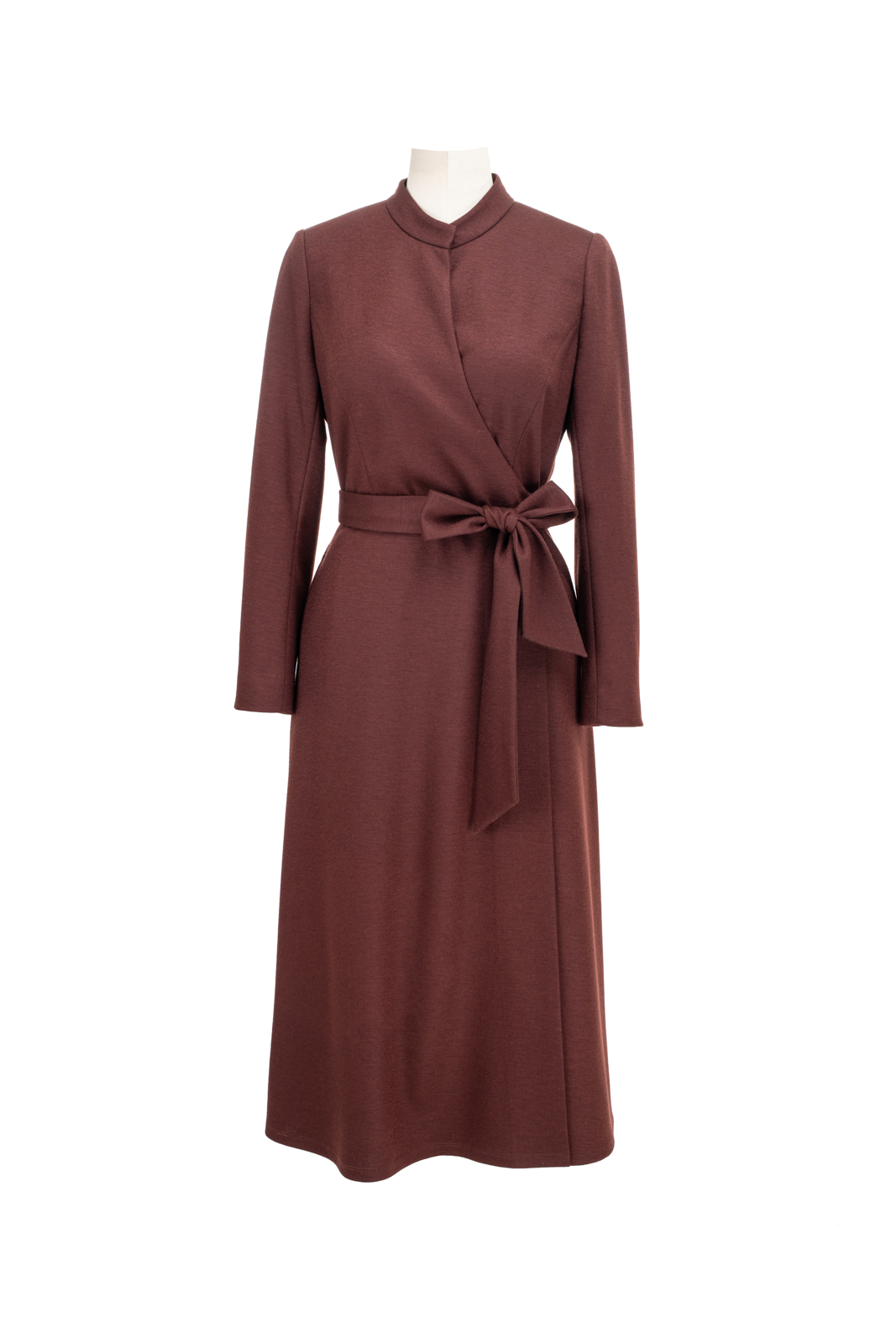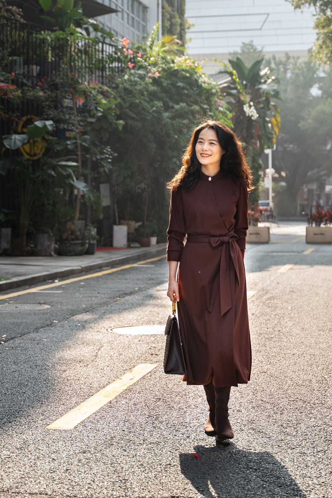 优雅就像个秘密,只有优雅者能识别……就像《刺猬的优雅》里的勒妮,安静地独处在满是书籍的世界里,内敛而沉静,腹有诗书气自华,如何隐藏也难掩丰盈世界溢出的细腻与高贵……亦如这件红褐色围裹式连身裙,质感软糯温厚,从脖颈至裙尾将周身围裹,令身心放松,保守着内心世界的沉静与不俗,始终与混乱聒噪隔离。保守的设计却并不沉闷,亦如勒妮充满高雅情趣的生活,两侧的公主线修饰身型,为松弛加入必要的端丽。脖颈处交叠有艺术感,一粒暗扣固定,隐藏所有繁复,外显简洁的优美。