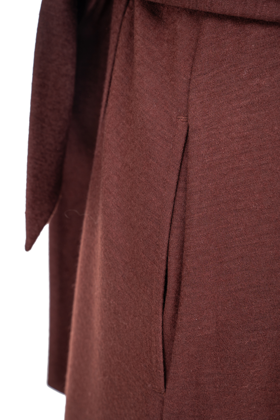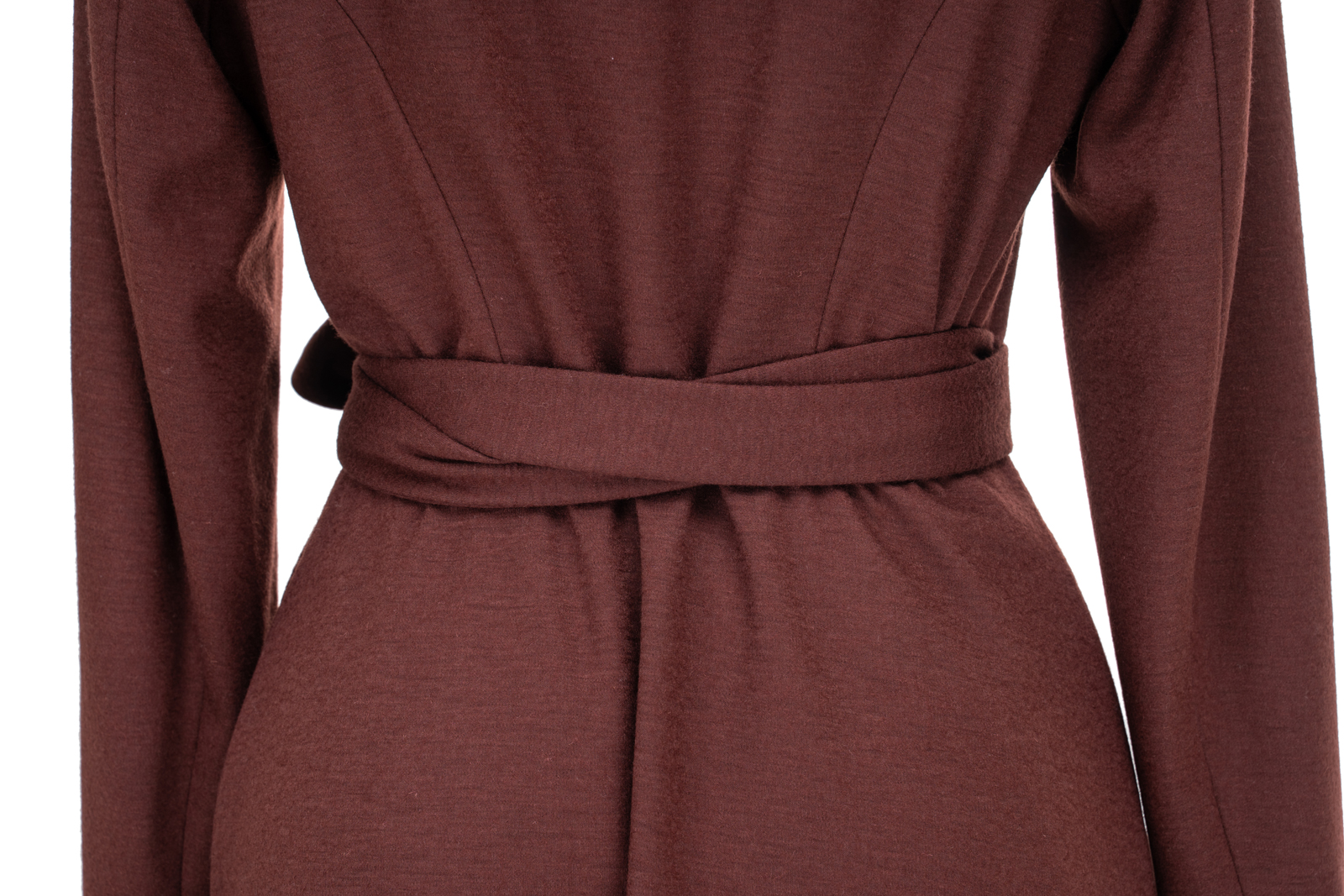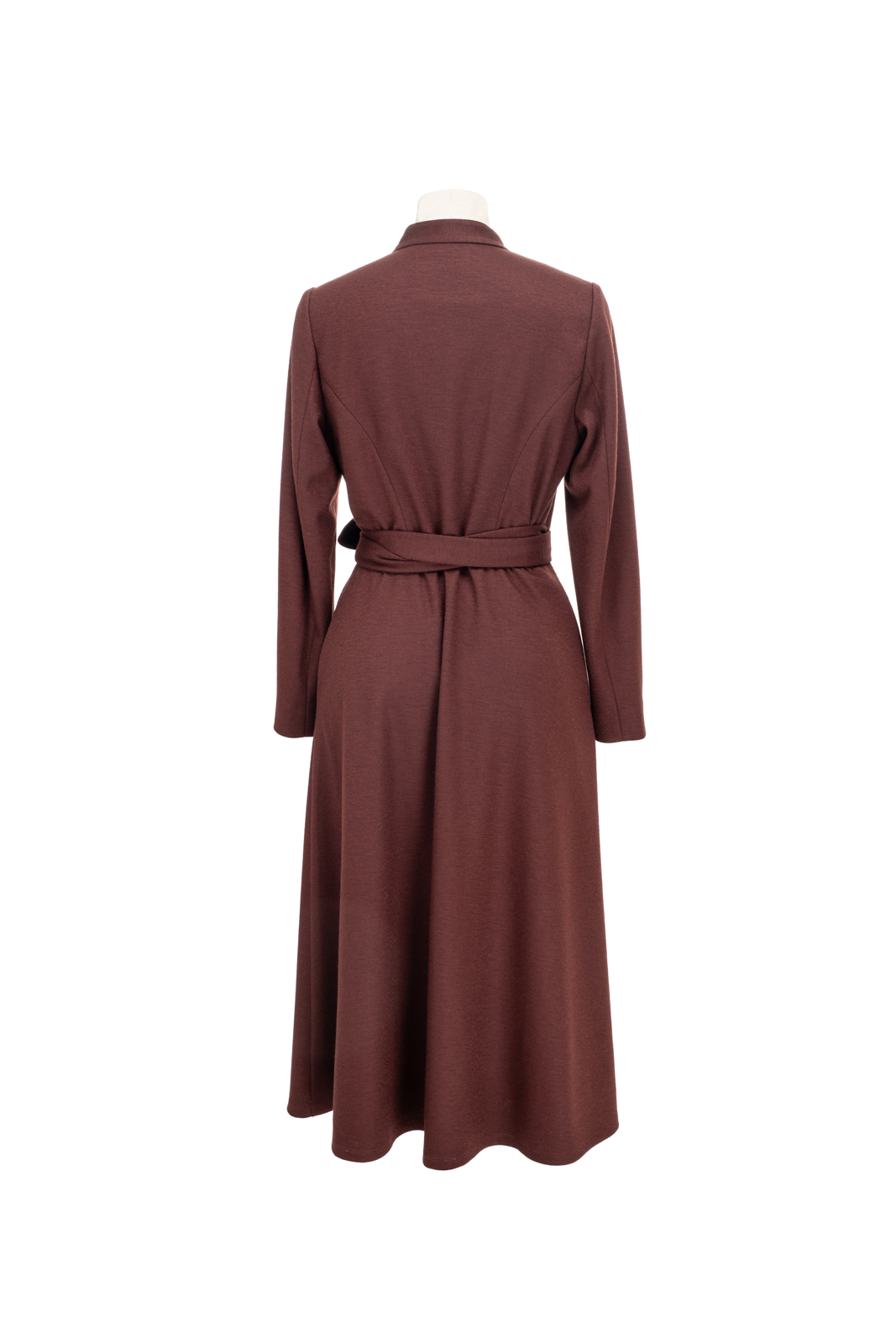 优雅就像个秘密,只有优雅者能识别……就像《刺猬的优雅》里的勒妮,安静地独处在满是书籍的世界里,内敛而沉静,腹有诗书气自华,如何隐藏也难掩丰盈世界溢出的细腻与高贵……亦如这件红褐色围裹式连身裙,质感软糯温厚,从脖颈至裙尾将周身围裹,令身心放松,保守着内心世界的沉静与不俗,始终与混乱聒噪隔离。保守的设计却并不沉闷,亦如勒妮充满高雅情趣的生活,两侧的公主线修饰身型,为松弛加入必要的端丽。脖颈处交叠有艺术感,一粒暗扣固定,隐藏所有繁复,外显简洁的优美。