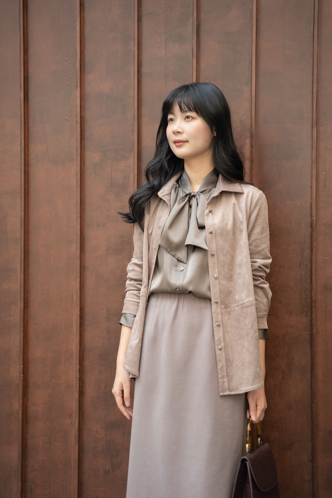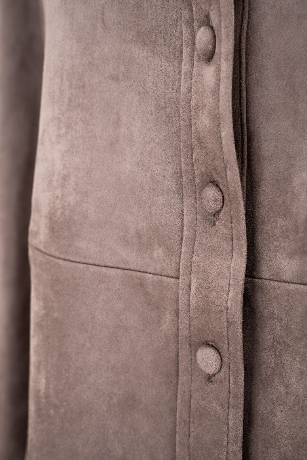 “玛尔塔的柔板”衬衫由人造麂皮制作,有柔韧的气质,细密的质地轻软耐用,不易皱不易变形,密实的质感却带着如云朵般的柔和,反差感令人印象深刻。麂皮自带一丝复古韵味,有怀旧之美,是从时间沉淀而来的时尚。衬衫设计简洁,款型周正,奶茶褐有融融的温暖氛围,点缀同色包扣精致优美,腰身处的破缝设计在结构上有打破再重塑的力量感,也给这件衬衫增添了外穿性,丰富穿着的造型变化。