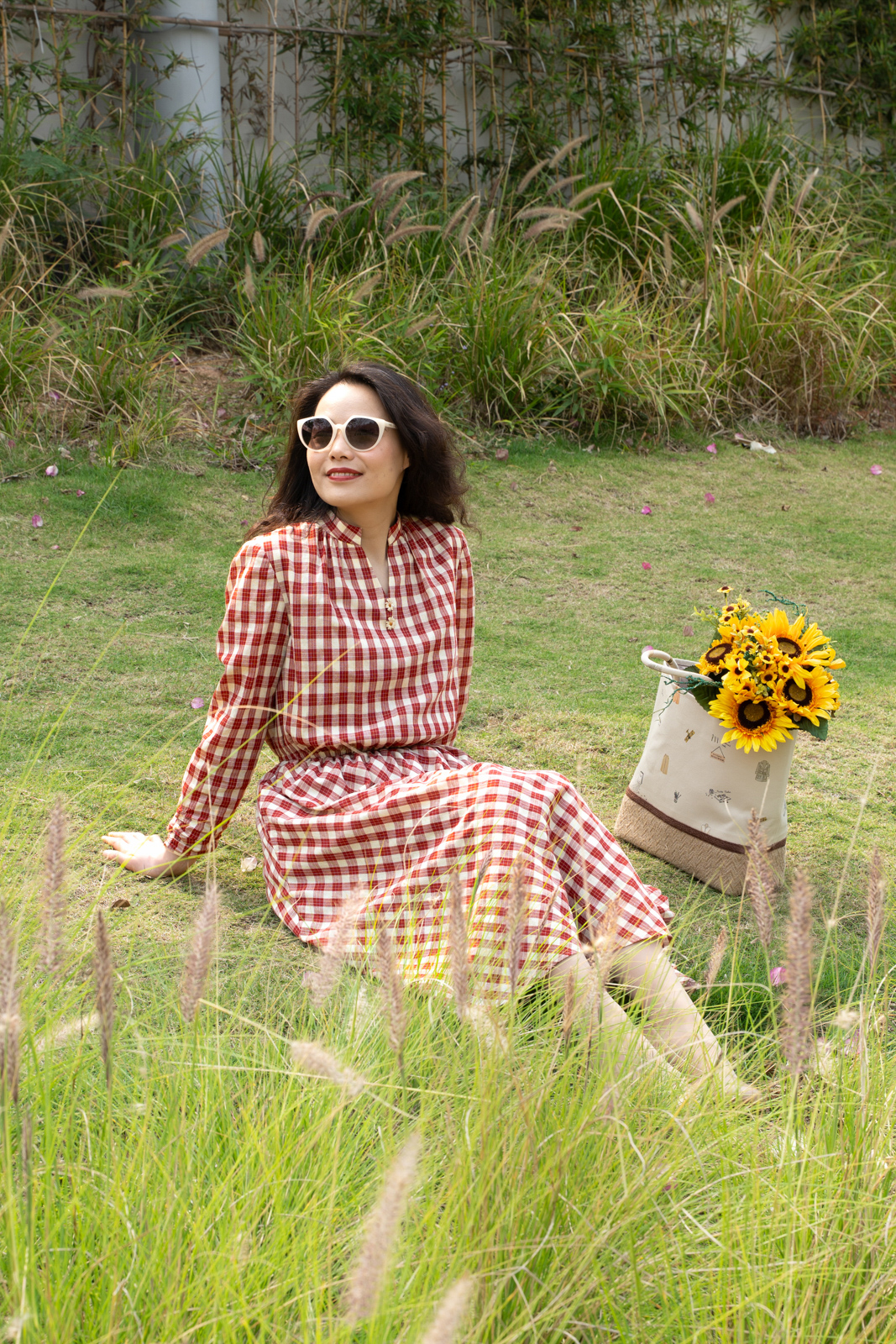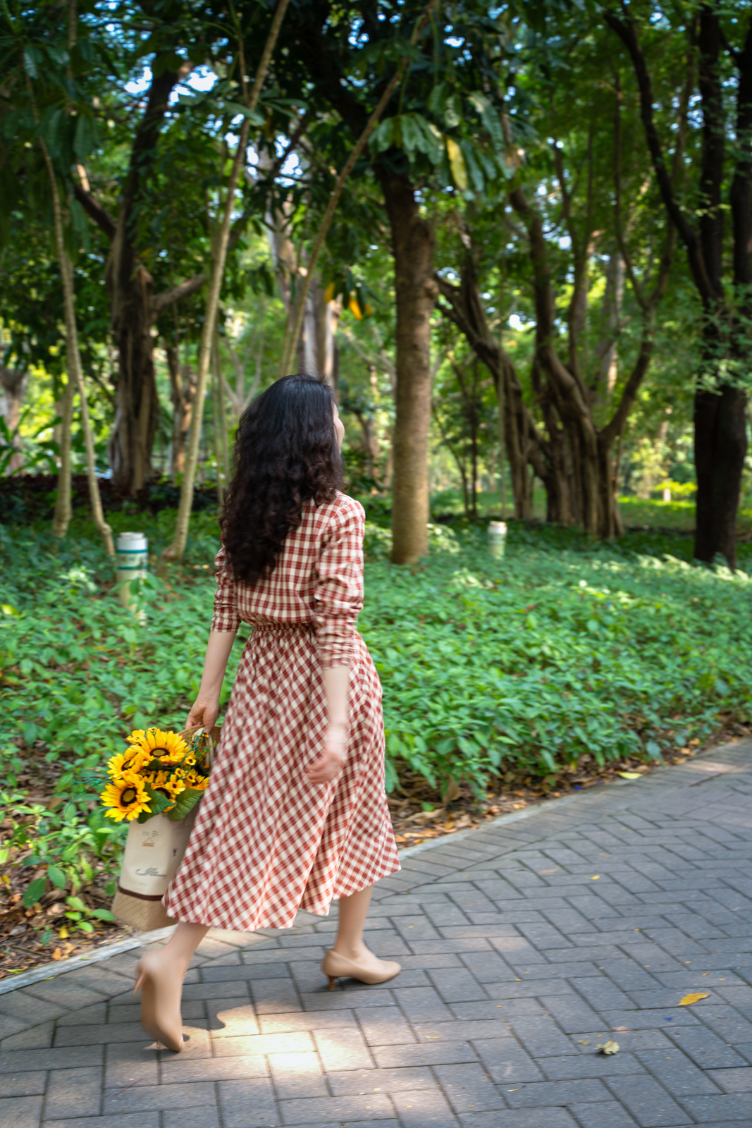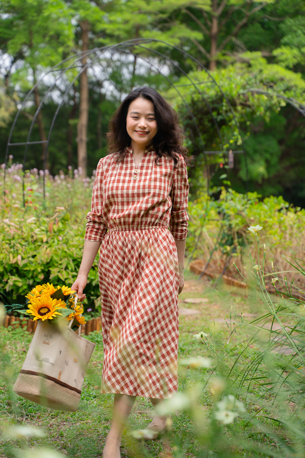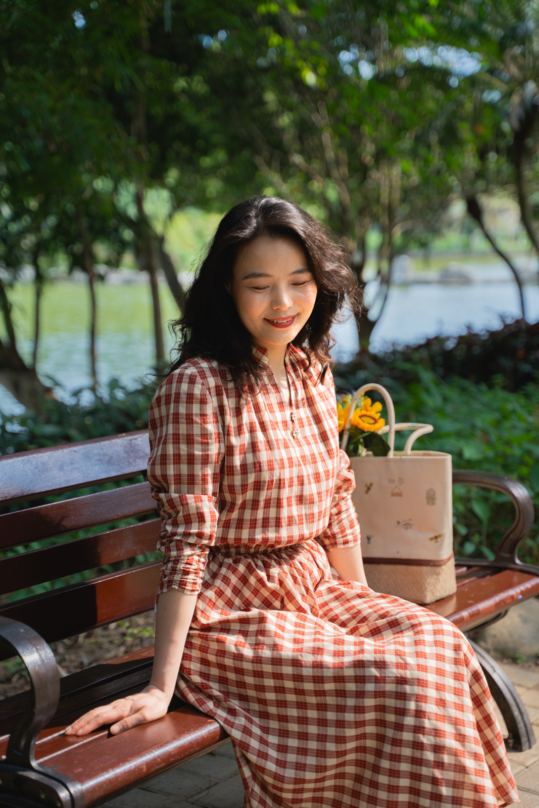 此款连身裙采用轻薄透气且飘逸的细棉格纹面料制作,橘红与米白交织出独属于春夏的欢快协奏曲,仿佛被蜜色的阳光播下热情与喜悦。简约的小V领无声修饰颈部线条,腰部的松紧设计以温柔的力度制造出纤美的支点,不仅勾勒身形还带来轻松舒适的穿着体验。无论是穿梭于都市街区还是漫步森林海滩,它都能为淑女营造出一个闲适、松弛的优雅形象,陪你一同领略人间四月天的美妙……