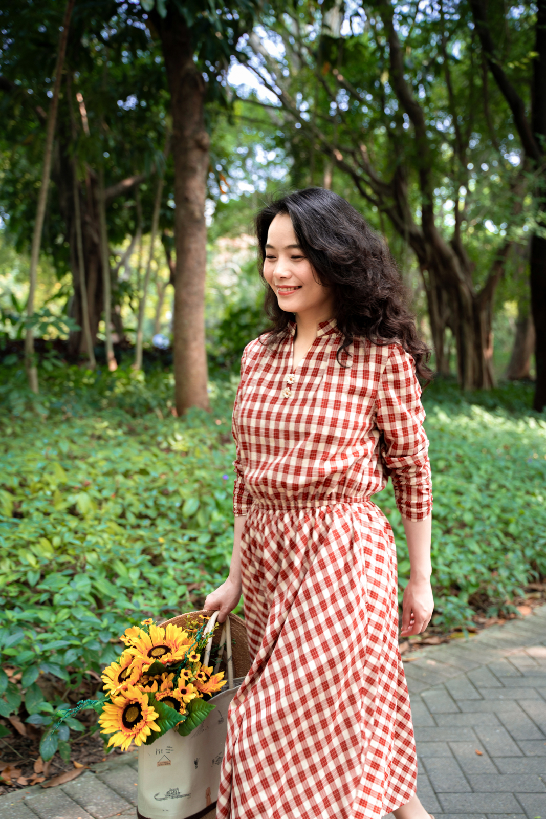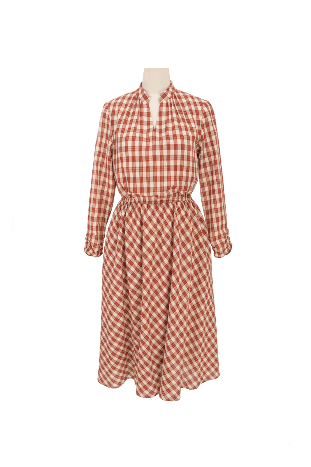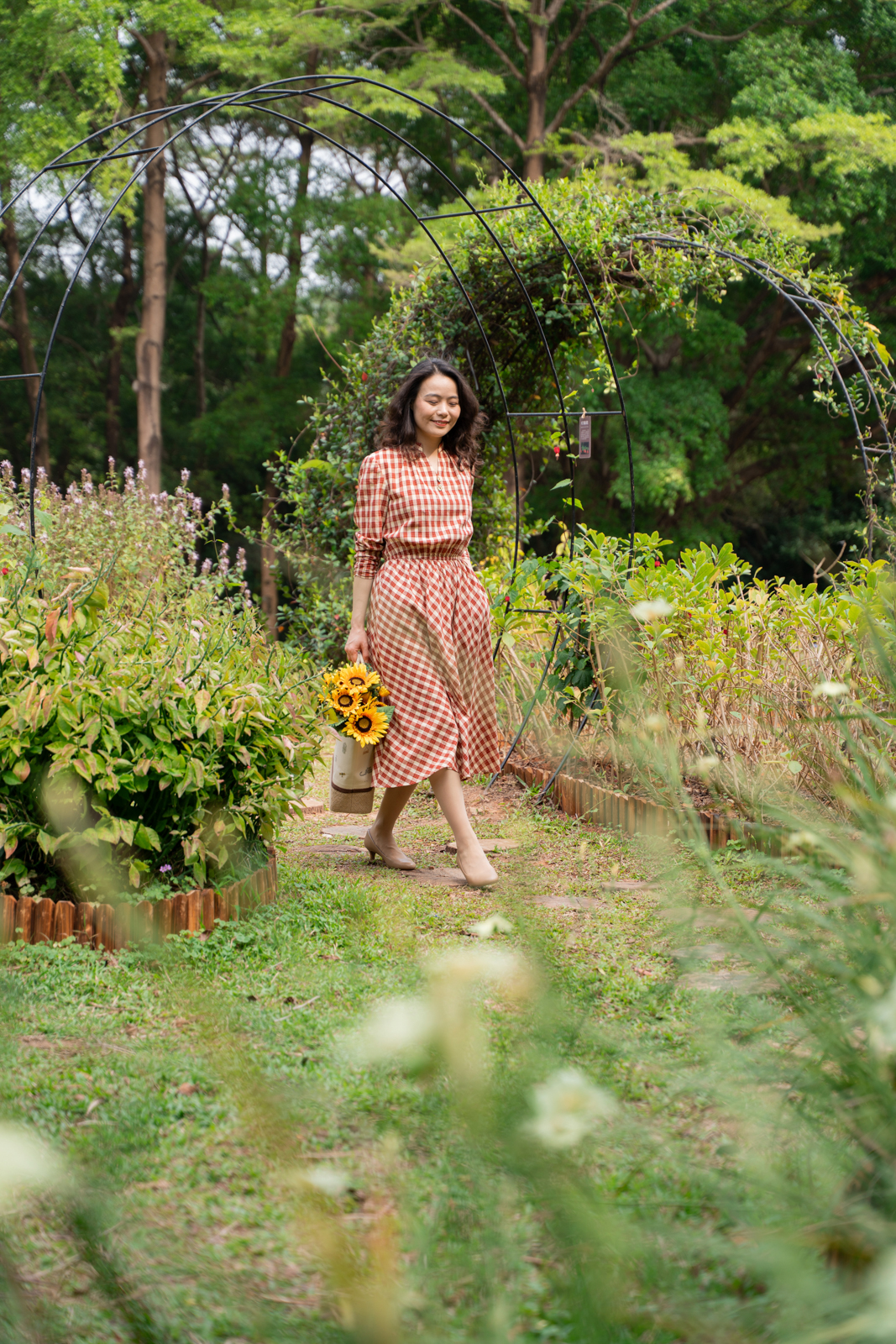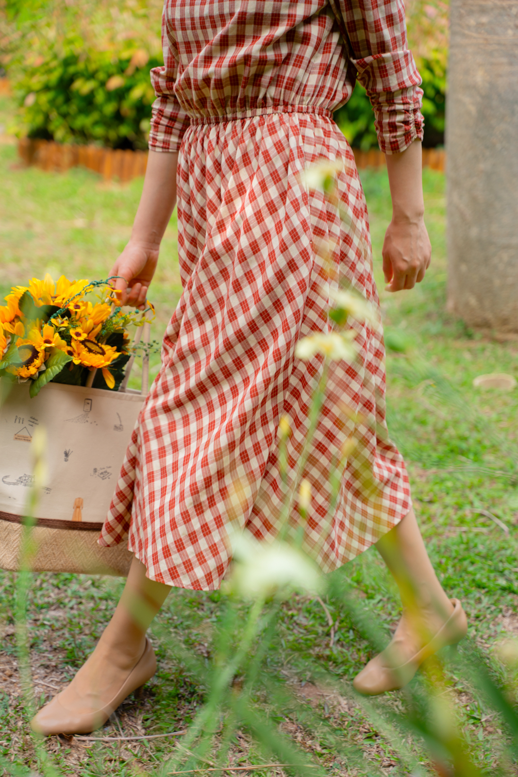 此款连身裙采用轻薄透气且飘逸的细棉格纹面料制作,橘红与米白交织出独属于春夏的欢快协奏曲,仿佛被蜜色的阳光播下热情与喜悦。简约的小V领无声修饰颈部线条,腰部的松紧设计以温柔的力度制造出纤美的支点,不仅勾勒身形还带来轻松舒适的穿着体验。无论是穿梭于都市街区还是漫步森林海滩,它都能为淑女营造出一个闲适、松弛的优雅形象,陪你一同领略人间四月天的美妙……