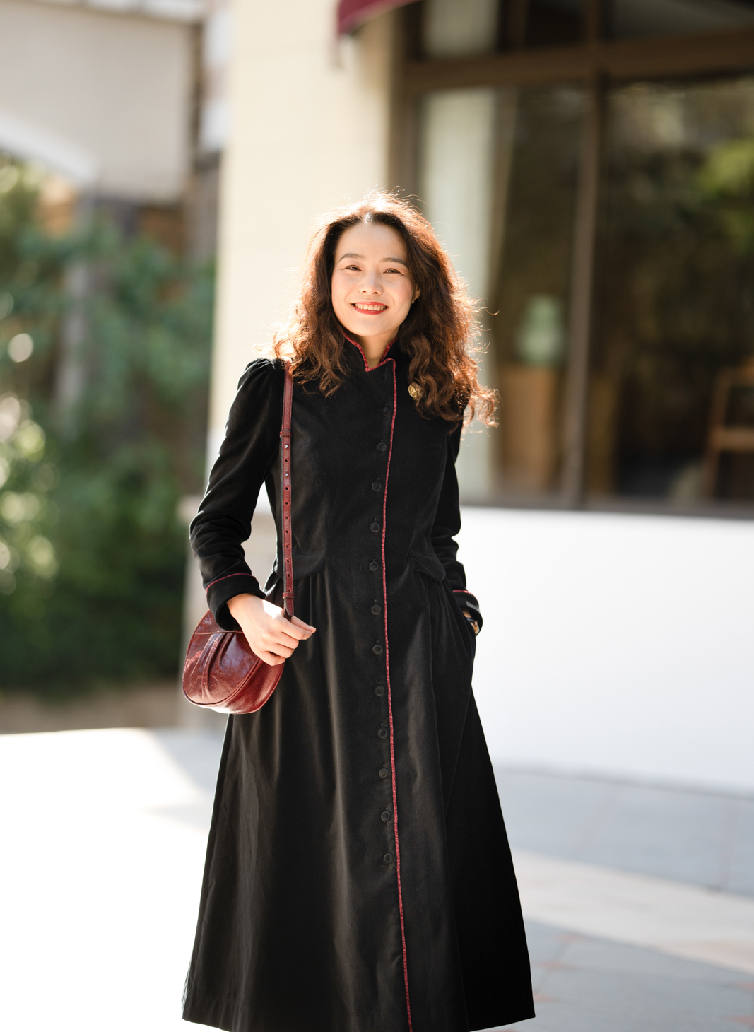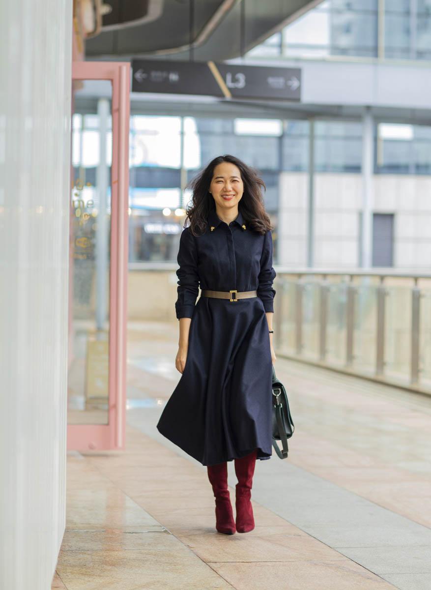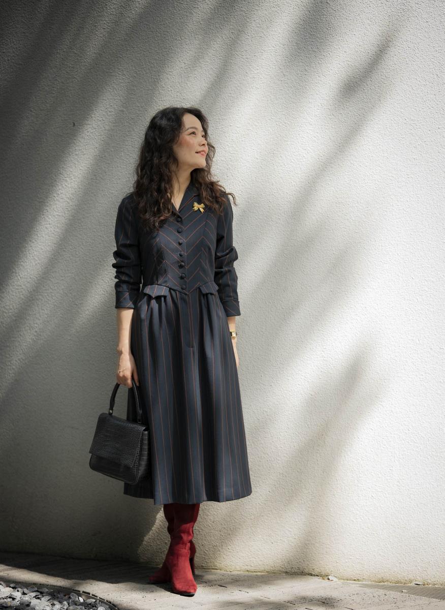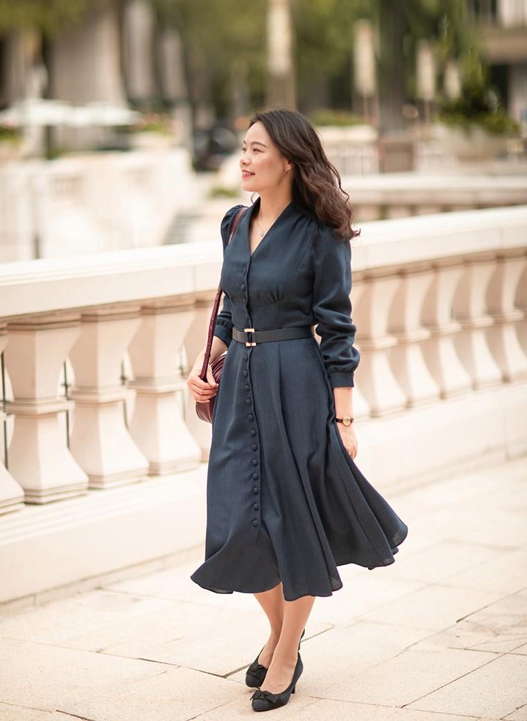 心中仰望真理的淑女,能够穿越纷繁喧嚣的凡尘,成就卓然脱俗的生命……幽幽深蓝,释放出淑女内心深沉美好的信念;智识条纹,透露着淑女一如既往的坚实哲思;精良绵羊毛,流露着淑女柔软芬芳的气韵。经典的最大魅力在于恒久美丽,细细品味,“你的不凡穿尘而过”是知性淑女越穿越精彩的裙装……复古雅致的翻领,与弧形的腰部袋盖及袖口波浪反折设计相呼应,彰显出淑女的不凡:坚定却不乏端丽的女人味,理性但趣致横生。精致的本布包扣和腰部碎褶不仅增加内敛气质与层次感,也...