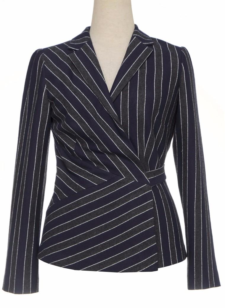 这款羊毛针织面料的裹身小外套,有着深蓝与银色相间的条纹,尽管是不同角度的走向,但都归于一个方向;如此设计带来的是一个极具感召力的深刻寓意——淑女的信念,就是这样的明确、专一、有方向感……永不迷失。 |