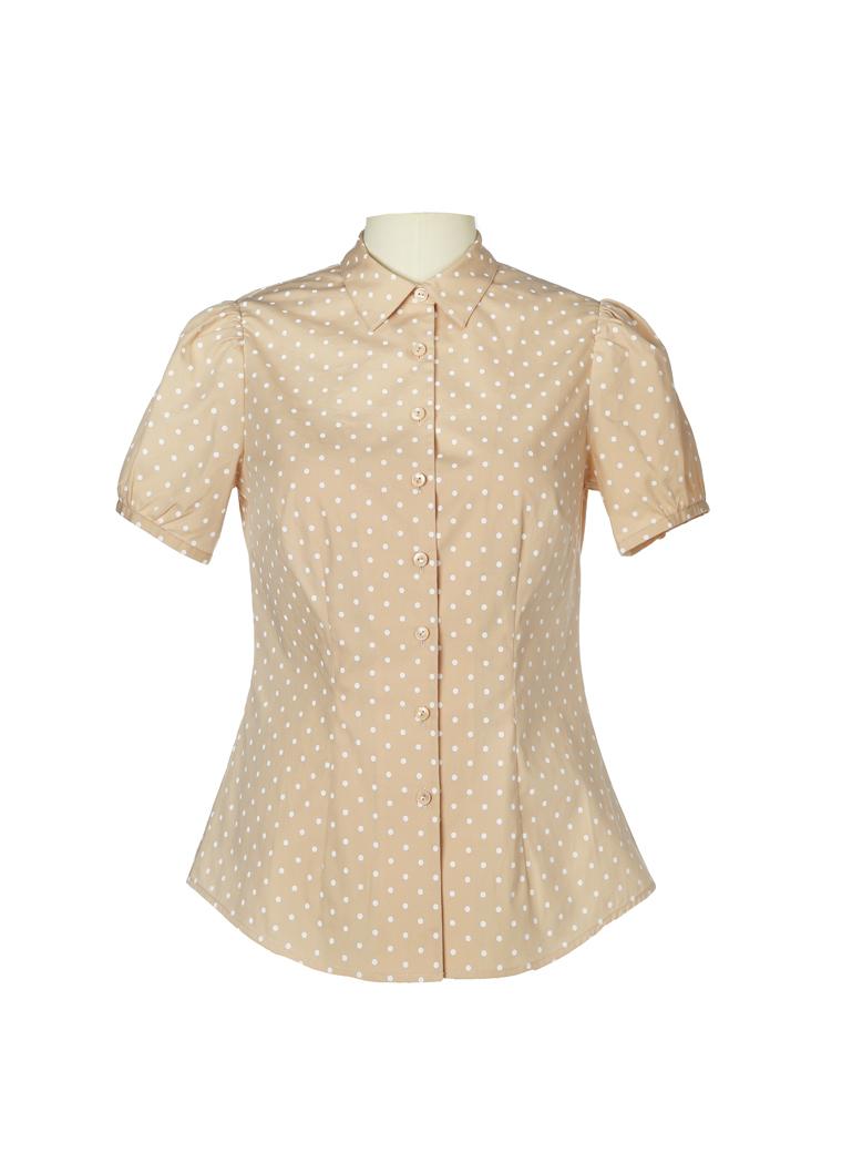在当年的同桌的记忆里,到处都是时光晕染的印迹,如朝露一般纯真,如阳光一般明媚,“那时候天总是很蓝,日子总过得太慢……” 简洁干净的白色小波点,印在清雅的卡其色底色上;恬美的细褶、精致的小领、可爱的泡泡短袖,处处充满着青春洋溢的气息……在这款气质年轻的小圆领波点衬衫上,仿佛刻下了“同桌记忆”,让淑女的一生,都充满了纯真、阳光的动人魅力……