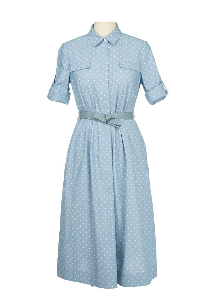 这款猎装式衬衫裙是maia's向法拉奇的致敬——利落的七分袖,以及卷袖式扣袢设计,配上帅气的假袋盖和舒朗的腰部叠褶,既有迷人的女性气息,也不减损雷厉风行的气质;无论是身处职场还是行走世界,它都是一款有魅力、有行动力的经典单品……此次推出的新款采用了蓝底白波点的印花图案,更带来了夏天般的晴朗明媚。 |