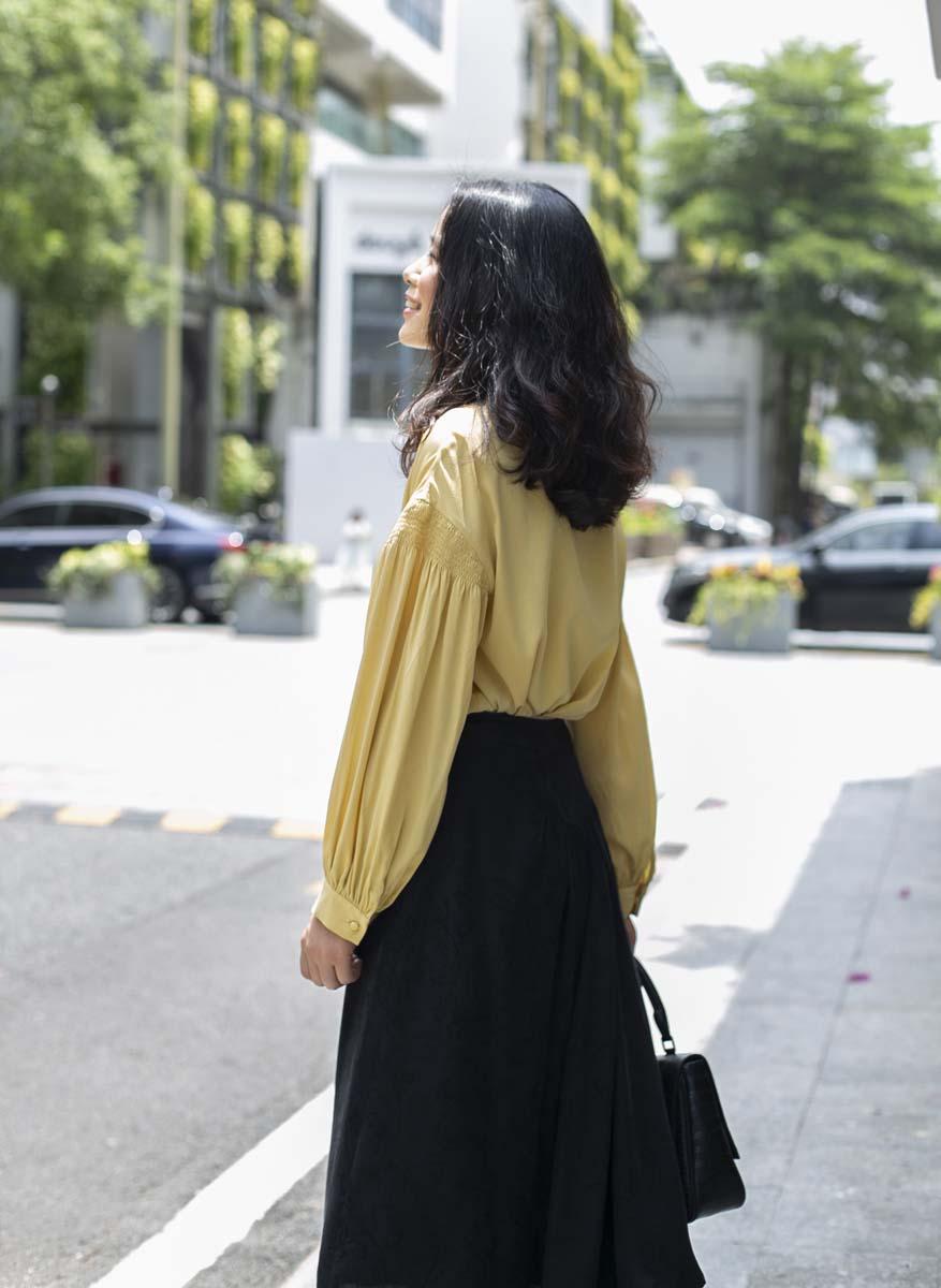 在葱笼的岁月中翩然前行,眼中的所见所闻,如阳光一样明媚;心中的所思所悟,像佳果一般甘美……幸福如诗的人生,就是梦想的确据,每一步都踏在感恩赞美的诗行当中…… 轻柔的质地、温柔的鹅黄色,仿佛带来了幸福的色彩……这款风格复古的真丝衬衫,采用了落肩式灯笼袖的设计,优渥自在;而可立可翻的小荷叶边镶边领口,呼应着本布包扣,别有情趣——这“幸福如诗”的美感,令人沉浸其中、久久回味……