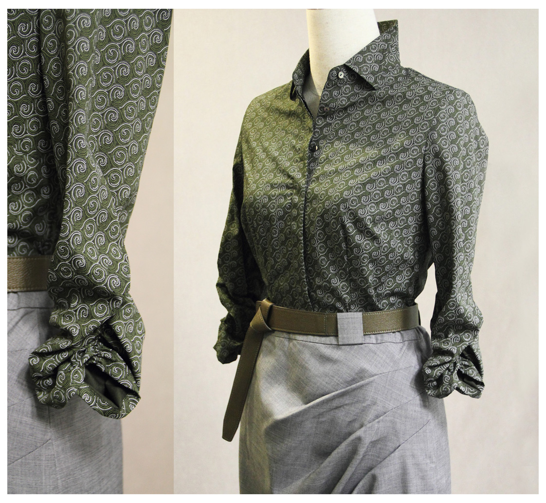 | 面料:纯棉质地。沉稳平和的墨绿色映衬无数旋转的小焰火,稳重之中不失鲜活;抽褶七分袖的设计突显都市中精英白领干练高效的一面。 |