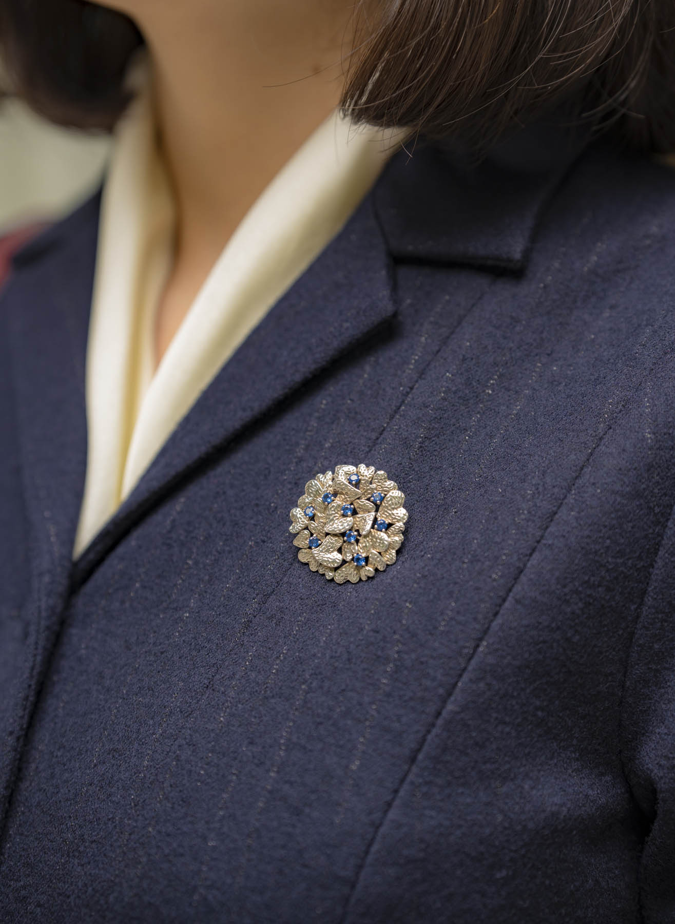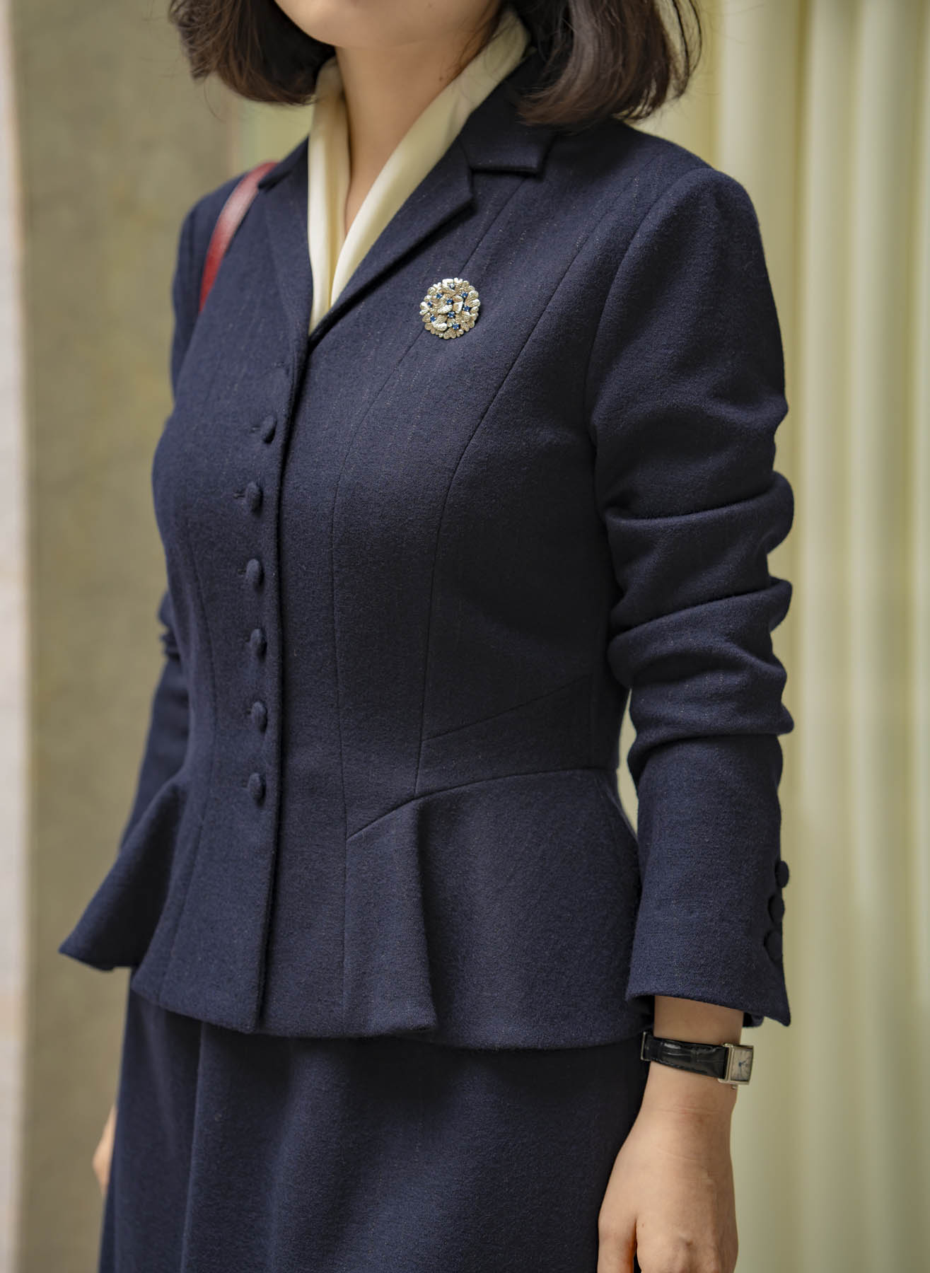 坚实、幽蓝的底色上织就出细细银线,如夜空中闪耀的星,似黑暗中萤火的光;绵羊毛的绵软与亲肤,慷慨地给予温暖与体贴,就如感恩的密钥让淑女和身边的人都处在舒适温暖之中。优雅复古、大方知性的套装式连身裙设计,以巧妙的分割线刻画出盈盈一握的蜂腰曲线;弹力成分带来舒适宜人的穿着感受;微A的裙摆在后衩加入精美的内褶,贴心地保护了淑女秋冬季节妥帖的温度、从容的脚步。
