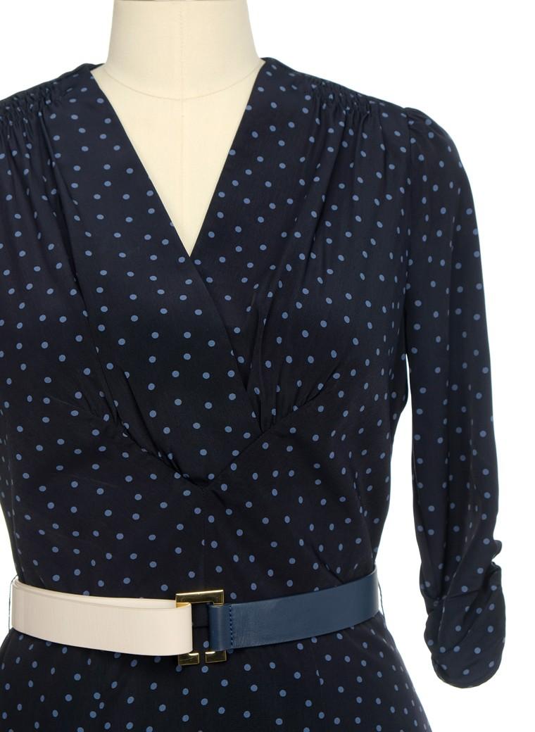 睿智的深蓝配上海蓝的波点,就像深邃的星空一样迷人;高雅的进口面料、大气的交叠领、复古的肩褶设计,都为这款连身裙增添了高贵的份量感与价值感——每一位涌出美词的淑女,都会彰显着优雅的份量与力量,传颂着真理的祝福…… |