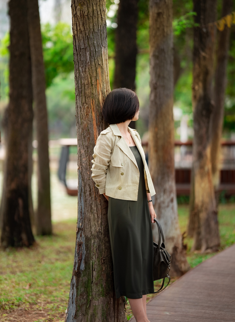 此款吊带裙采用弹力纤维混纺面料裁制而成,气质优雅且可将身形衬得分外迷人。极具美感的领口和后中的开衩设计让步态从容优美,纤细的可调节肩带能勾勒出双肩的动人线条。不妨外搭同期发布的“柔风细雨II”,打造摩登淑女造型。