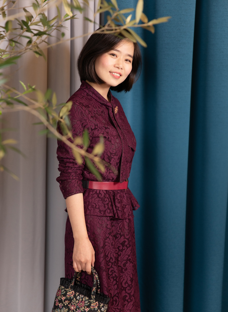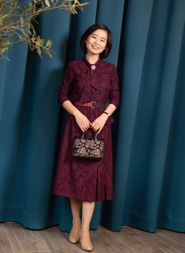 此款连身裙所带来的套装效果使得造型拥有了不同一般的分量,呈现优雅的隆重感。弹力蕾丝带来修身却无束缚的穿着体验,醉人的酒红色是礼服中的经典色彩之一,有分寸的飘带设计,展示出有礼有节的气度,配以不同胸针固定将成为每穿每新的亮点……细节处的配色滚边和包扣以精致复古的用心带来价值感,起伏的波浪衣摆,更能烘托出曼妙的腰部,裙摆的内褶使得淑女们行走端庄自在。
