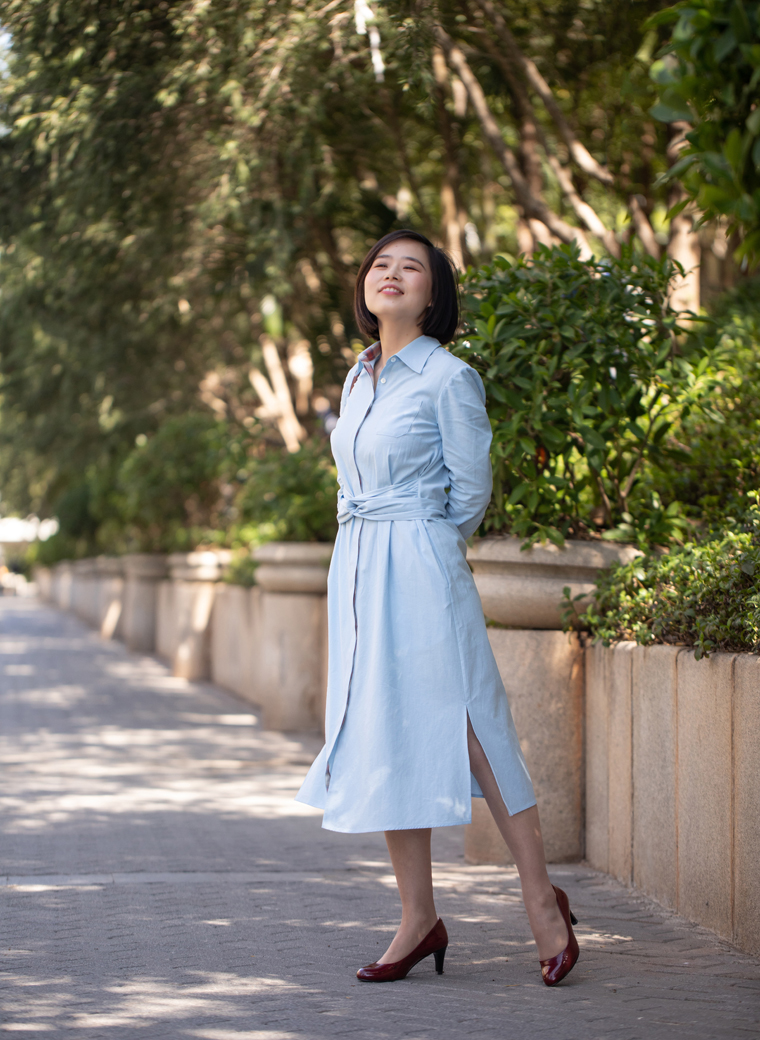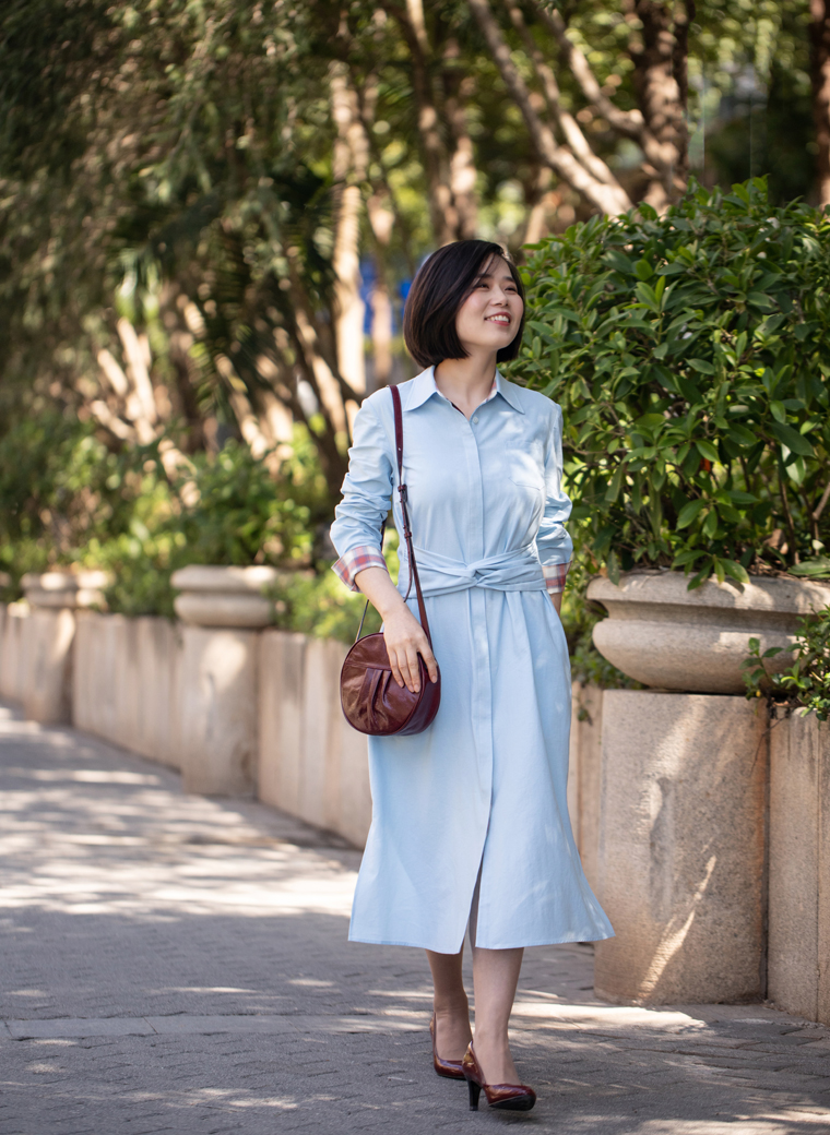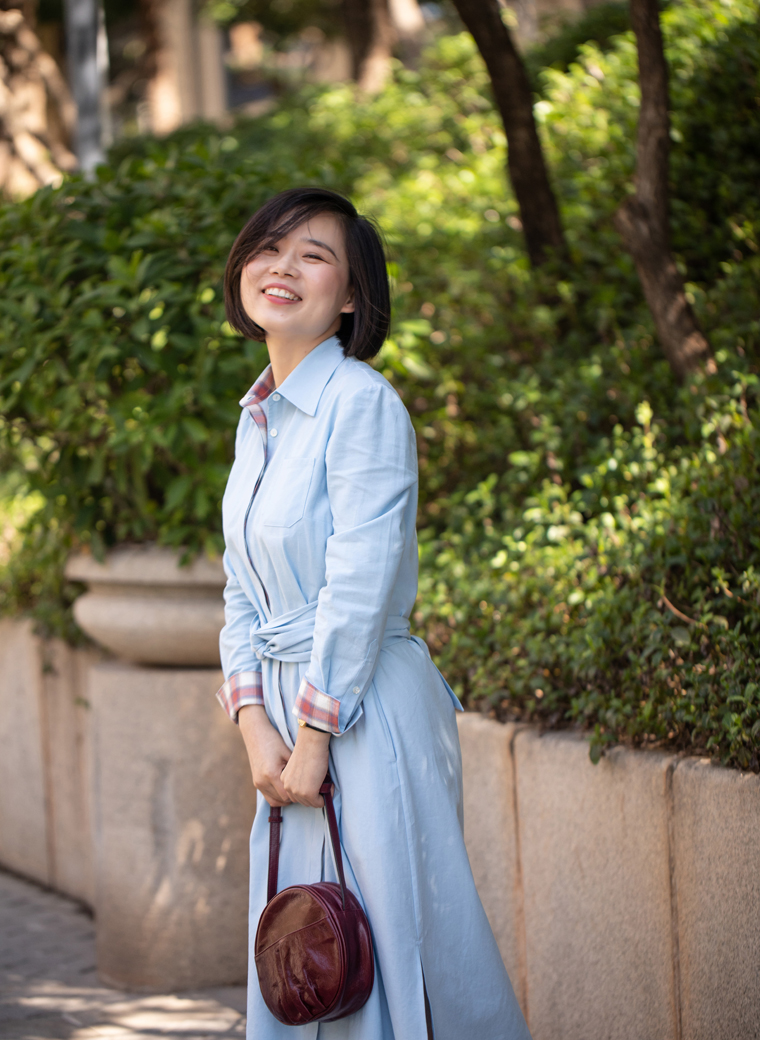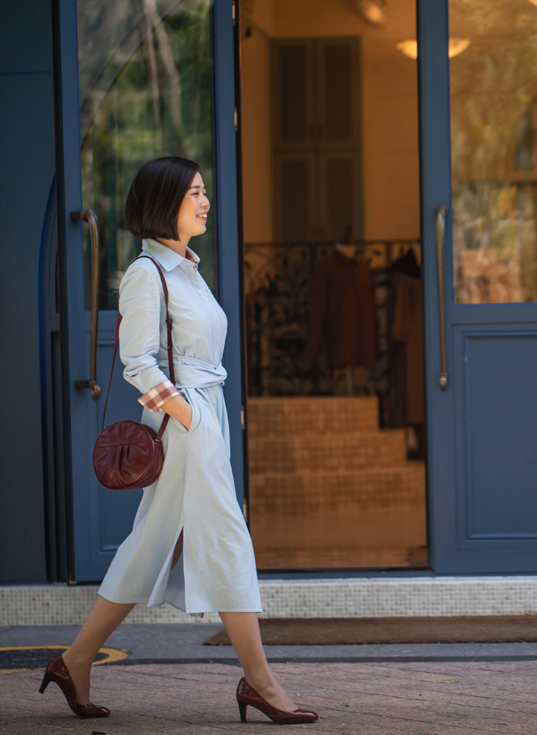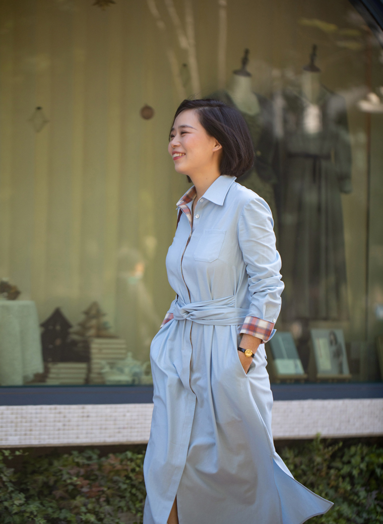 无论是面对突然的骤变、受限的环境还是不定的未来,真正的淑女有着不被限制的宽广的心!明净的天空蓝,象征着淑女的纯一清洁,腰带的扭结仿佛点题似的表达着淑女坚强的持守,也使经典的衬衫裙,营造出盈盈一握的柔软和纤细;暗门襟带来含蓄沉静的细节;袖口与门襟的格纹拼接增加了丰富与深沉……淑女们的海阔天空是在内心,是阴晴圆缺都可翱翔的所在,那是一片无法剥夺的感人天地……