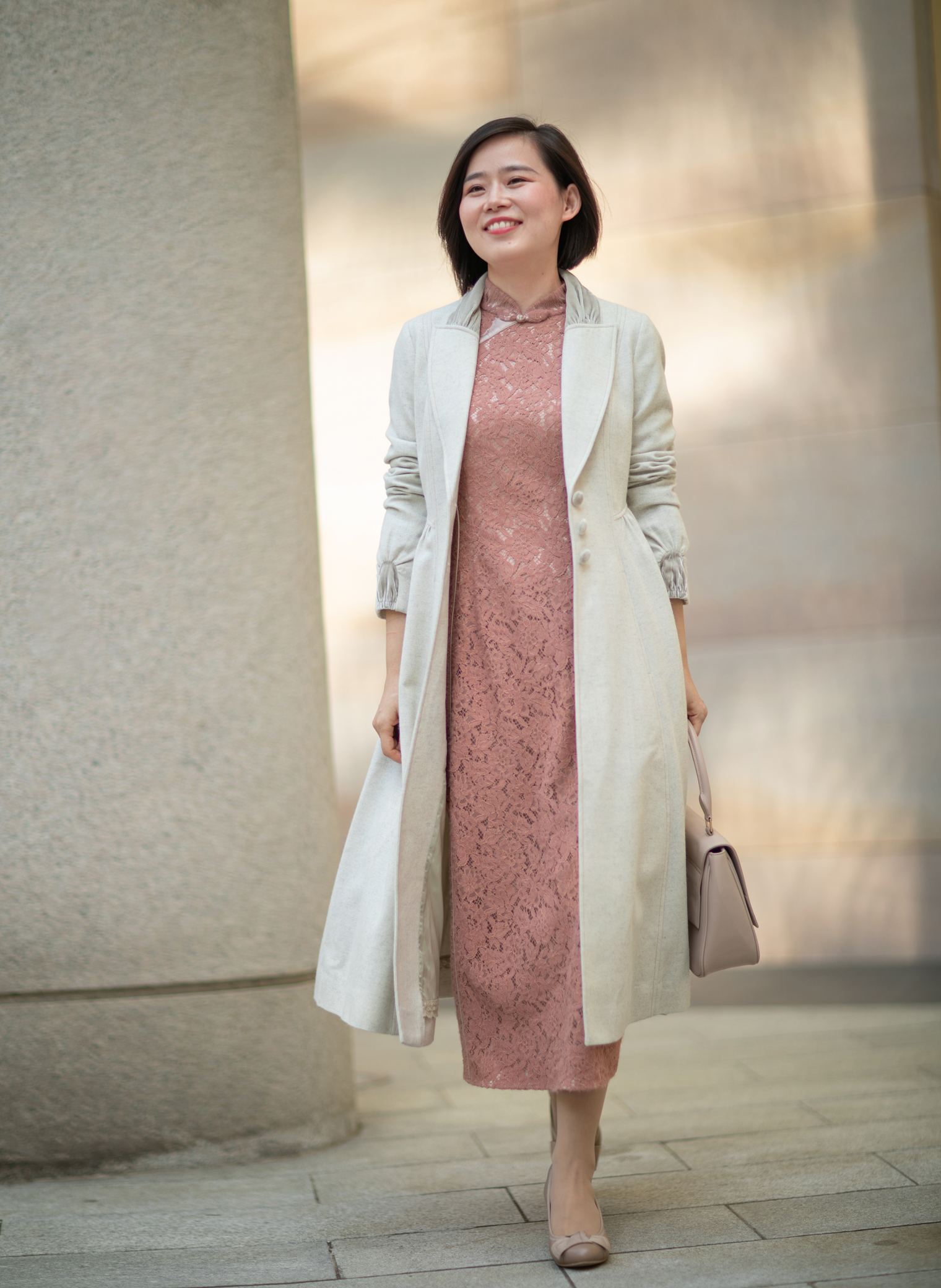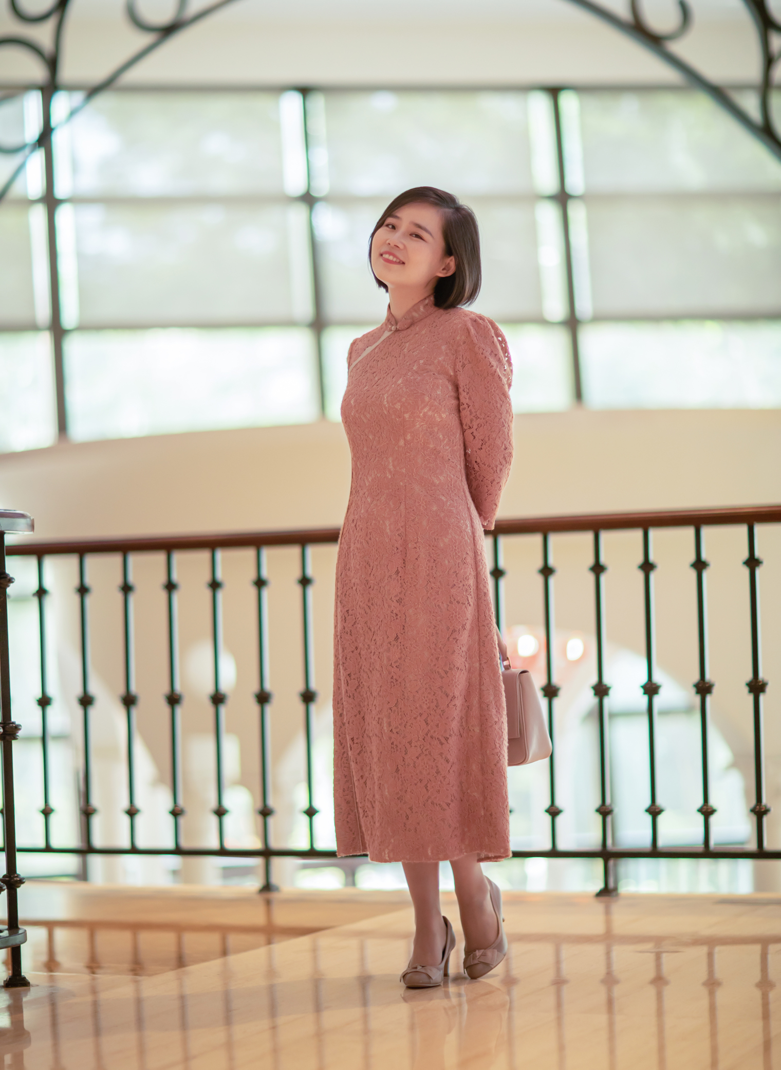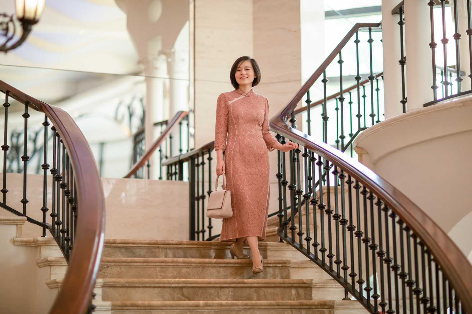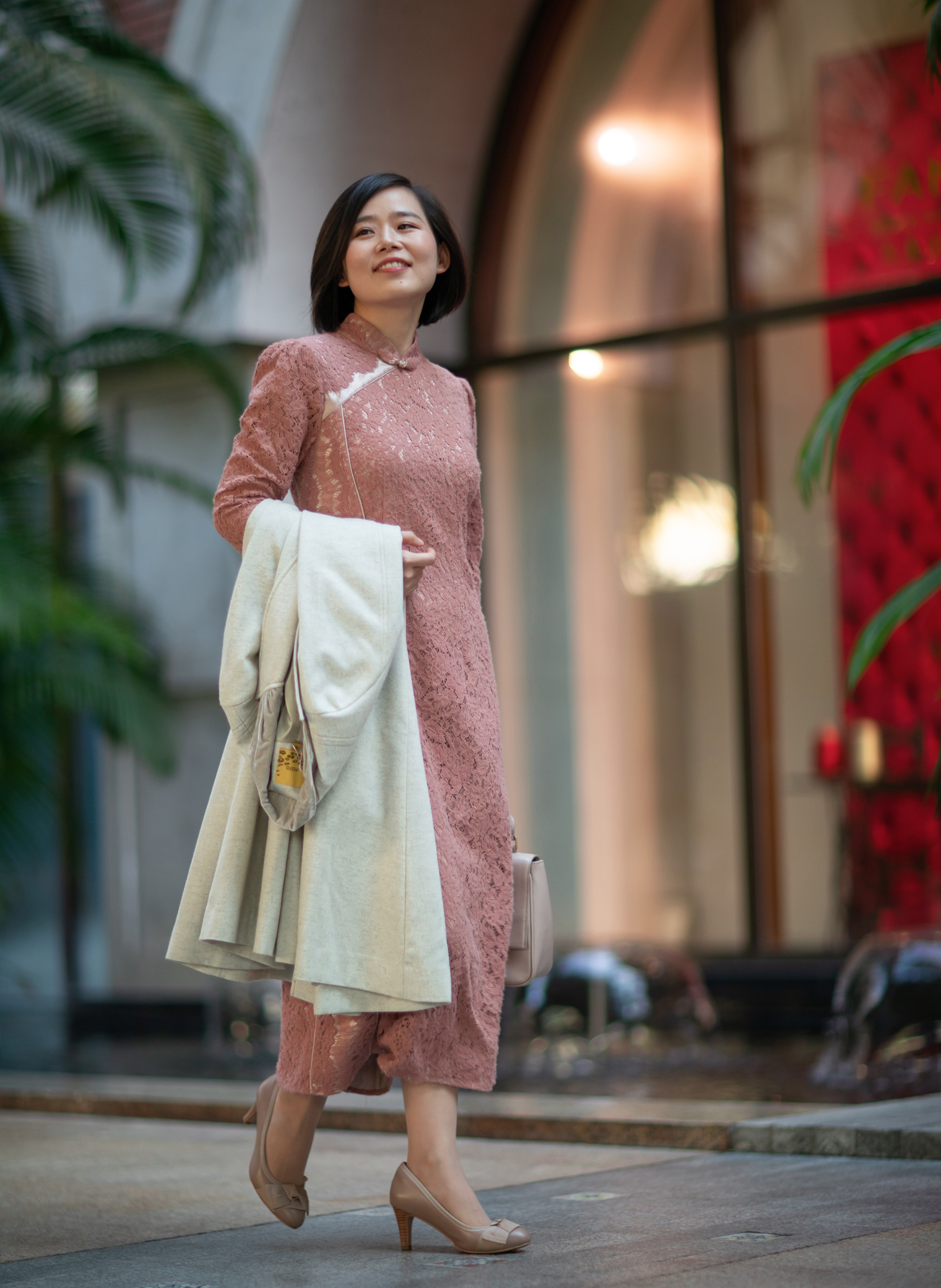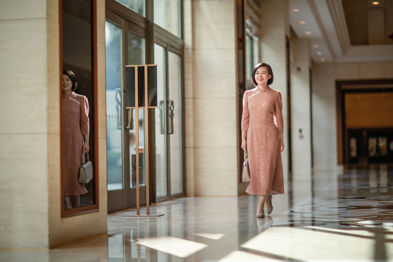 “美福”意味着在庆典时刻献上最美的祝福和最美的福分。华美浪漫的蕾丝与温婉、清雅的粉调,交融出甜蜜的幸福感,独特的绒感面料令花型图案更为立体生动,更释放出绵长馨香……斜襟的真丝波浪花边散发着淡淡光泽,右侧精美滚边工艺刻画出优美曲线,节制地点缀出庄重感,也衬托出淑女身材曲线美;立体手工盘扣、袖口精美定位花边、扇形的鱼尾后衩……细节中尽显尊贵格调。