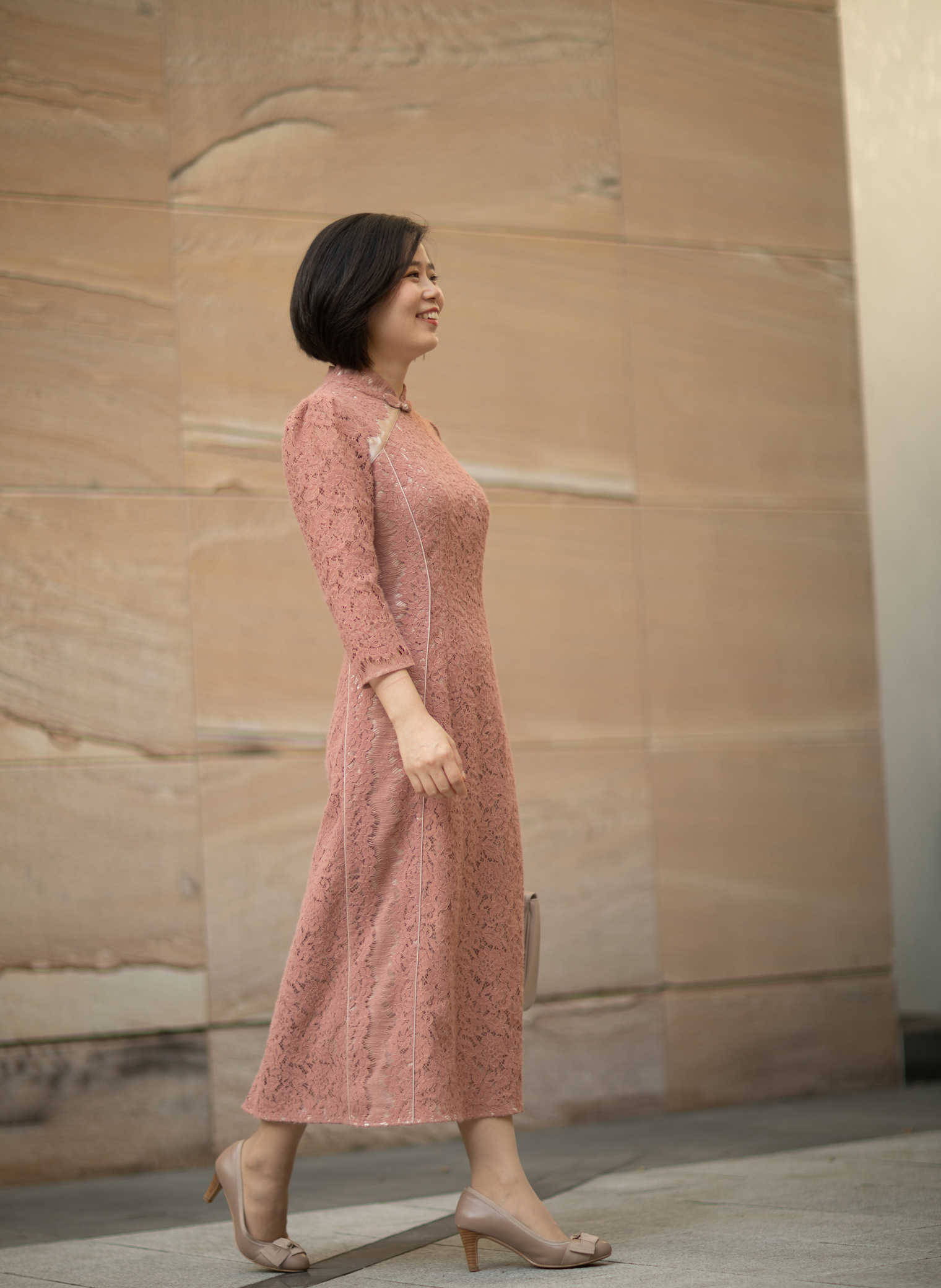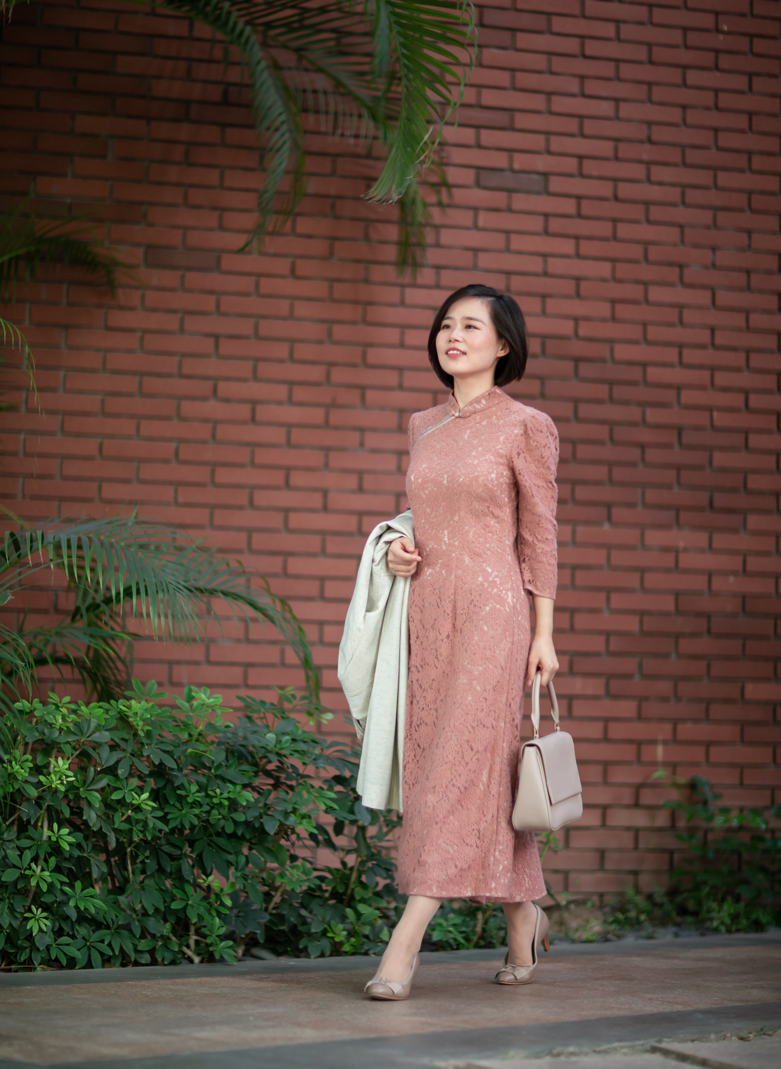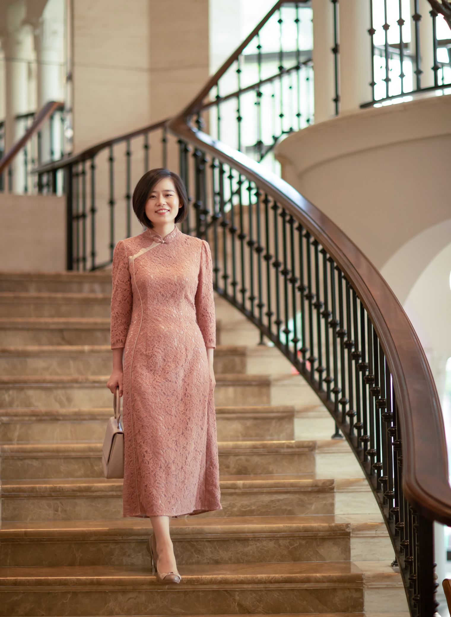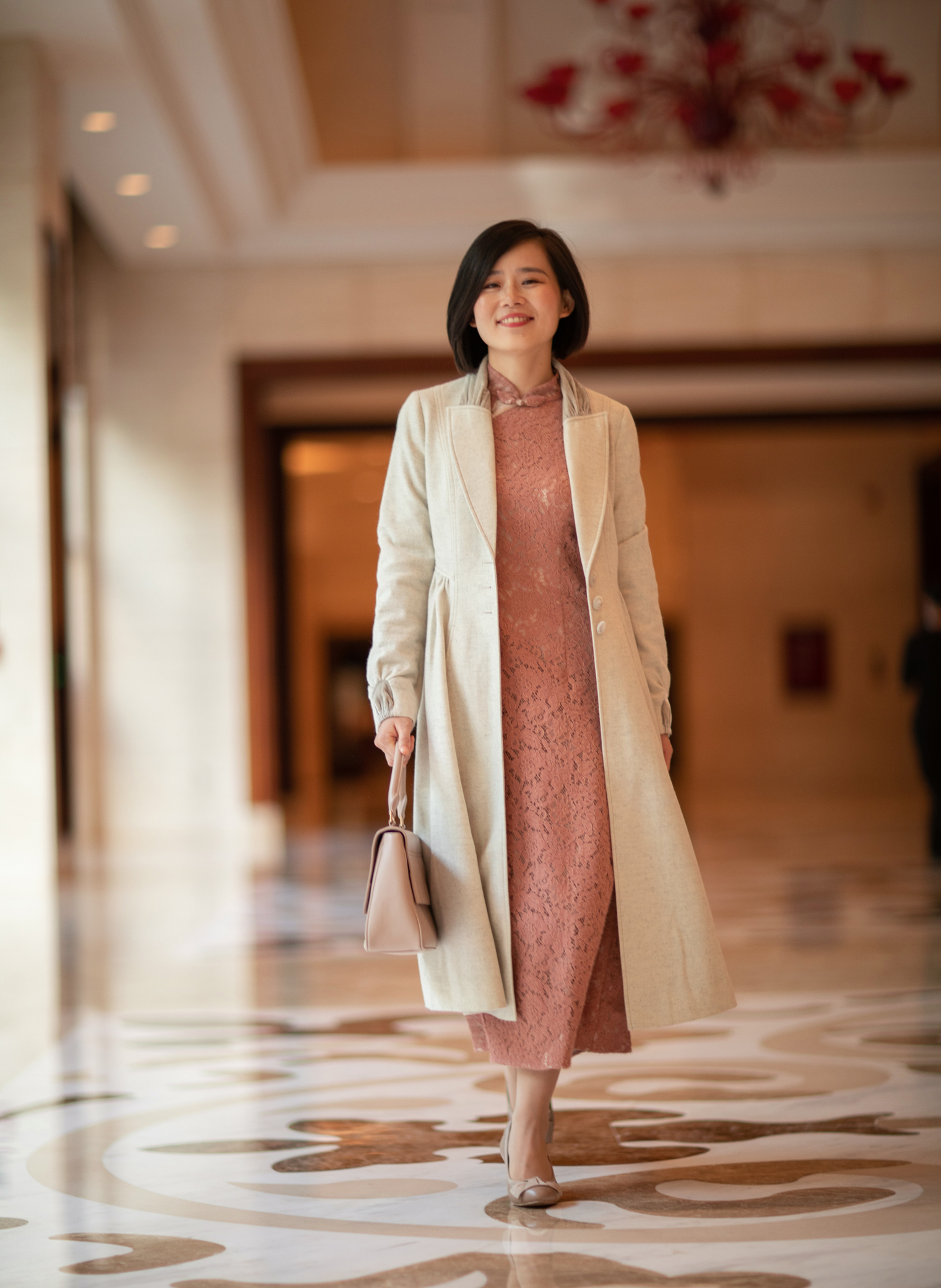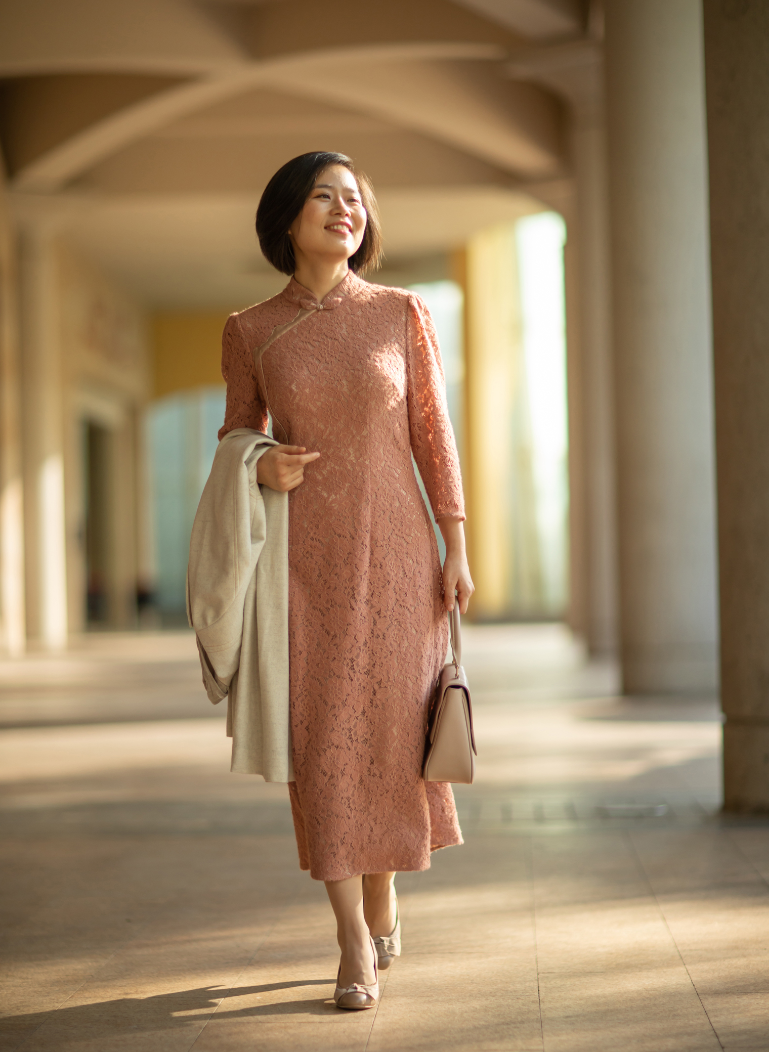 “美福”意味着在庆典时刻献上最美的祝福和最美的福分。华美浪漫的蕾丝与温婉、清雅的粉调,交融出甜蜜的幸福感,独特的绒感面料令花型图案更为立体生动,更释放出绵长馨香……斜襟的真丝波浪花边散发着淡淡光泽,右侧精美滚边工艺刻画出优美曲线,节制地点缀出庄重感,也衬托出淑女身材曲线美;立体手工盘扣、袖口精美定位花边、扇形的鱼尾后衩……细节中尽显尊贵格调。