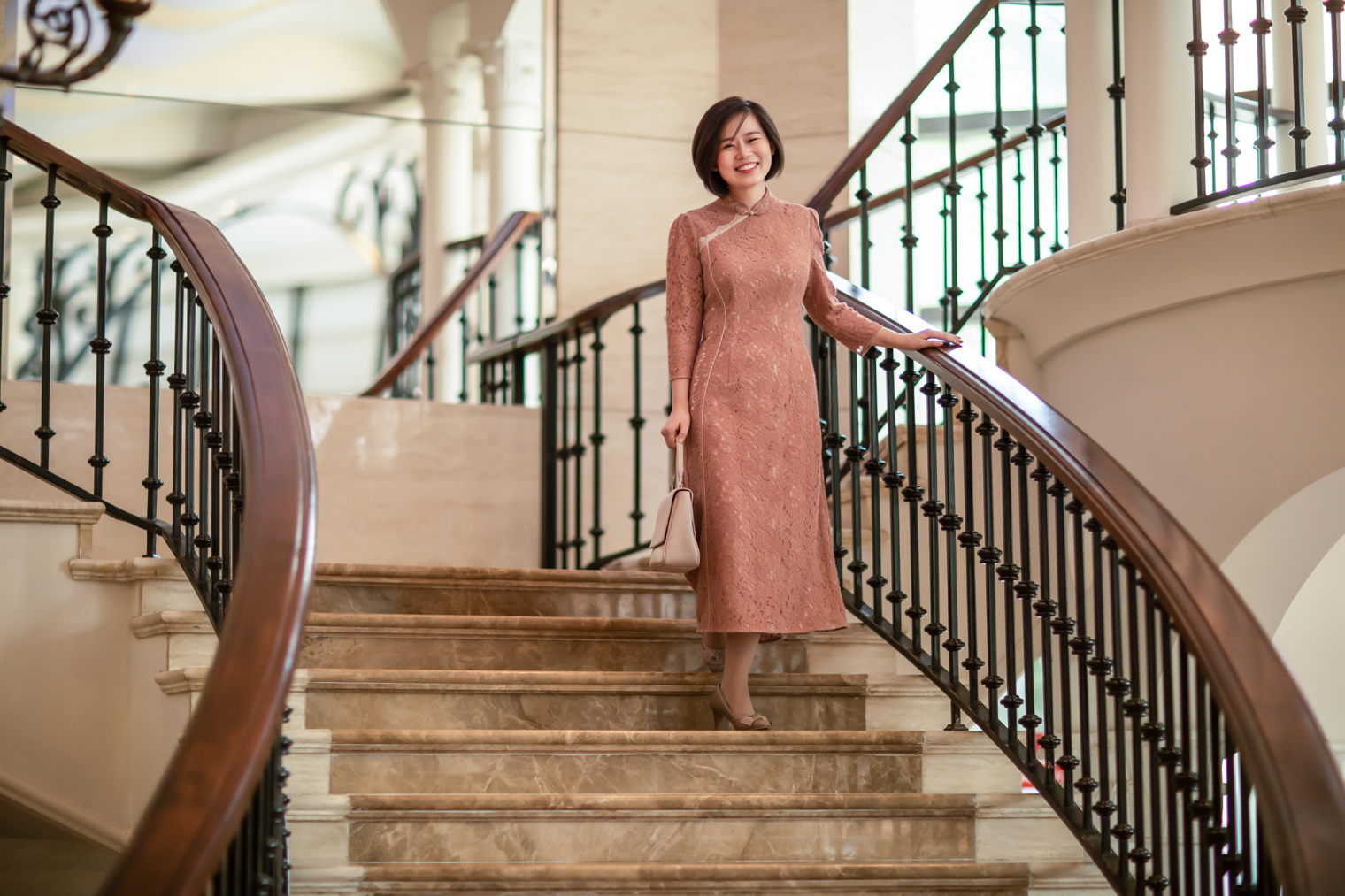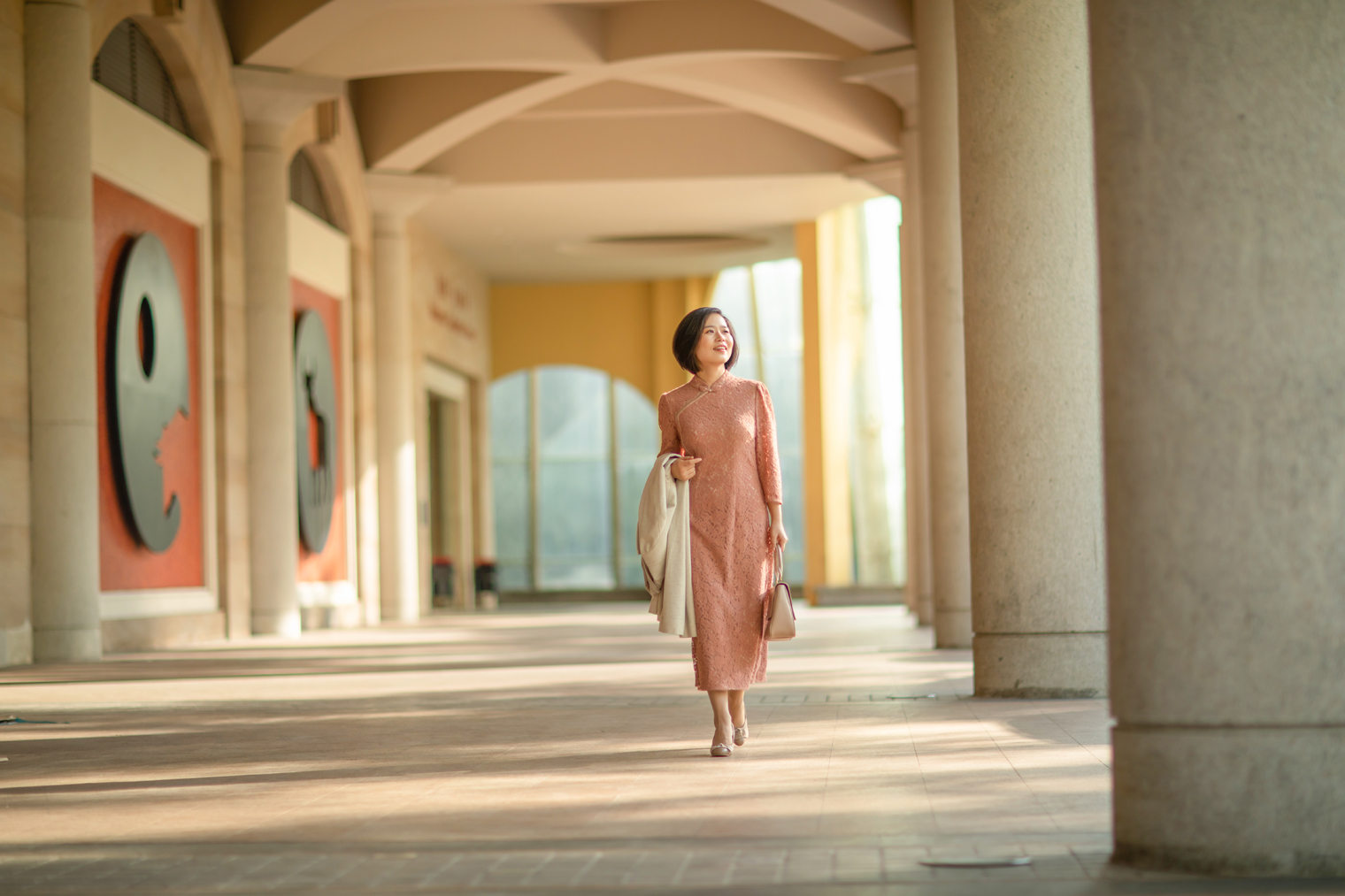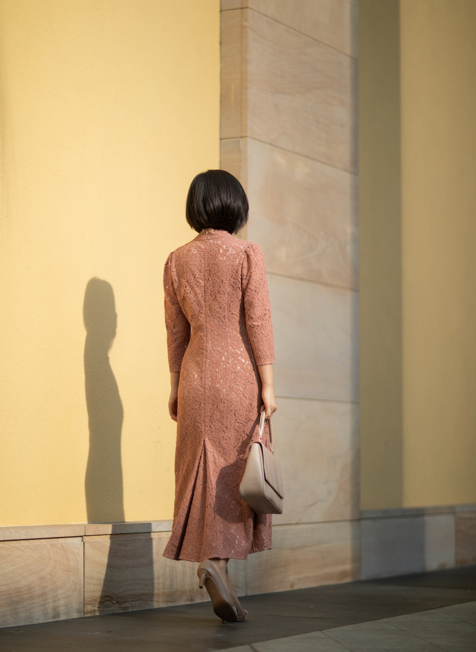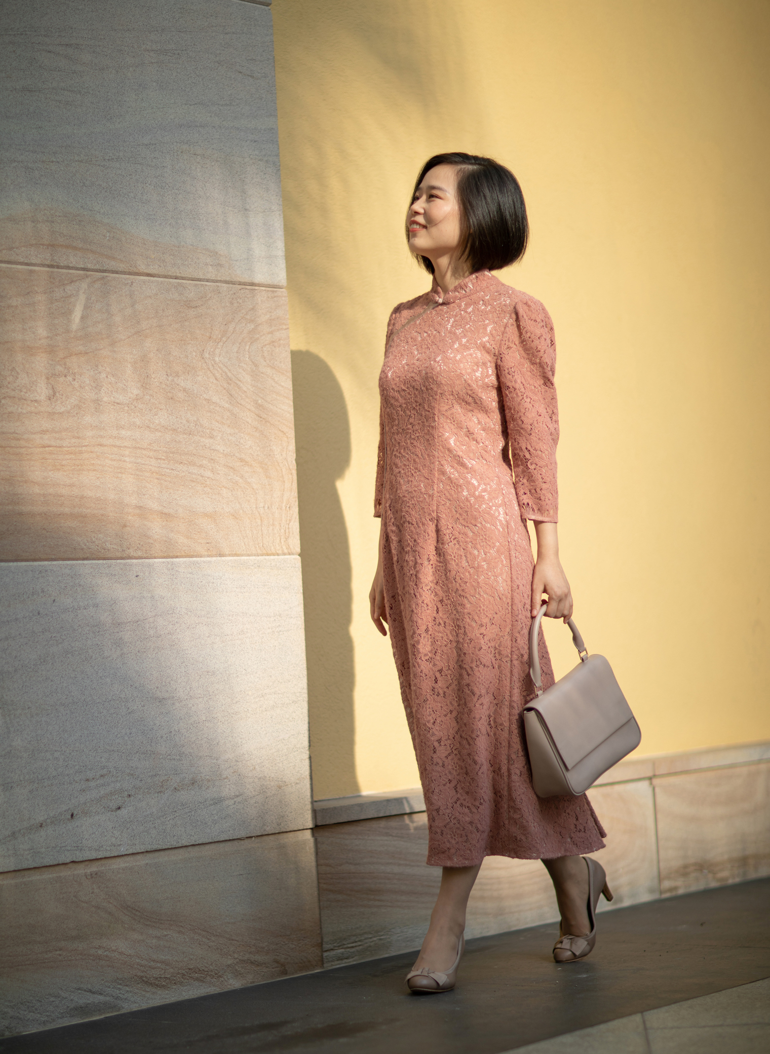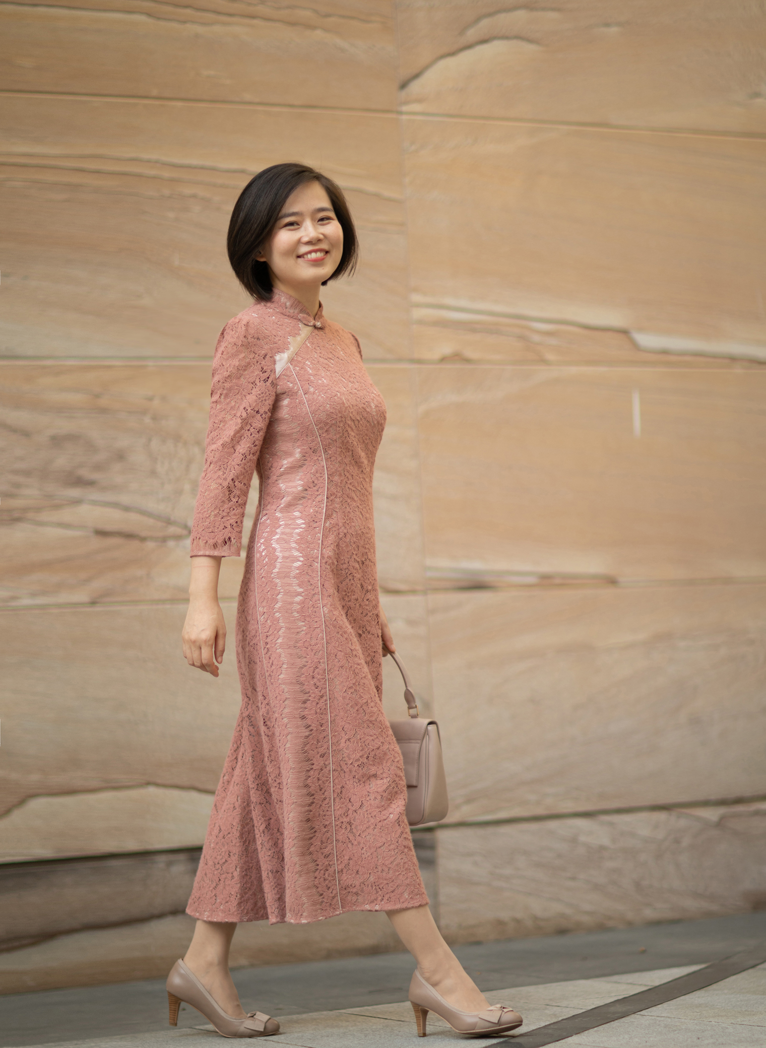 “美福”意味着在庆典时刻献上最美的祝福和最美的福分。华美浪漫的蕾丝与温婉、清雅的粉调,交融出甜蜜的幸福感,独特的绒感面料令花型图案更为立体生动,更释放出绵长馨香……斜襟的真丝波浪花边散发着淡淡光泽,右侧精美滚边工艺刻画出优美曲线,节制地点缀出庄重感,也衬托出淑女身材曲线美;立体手工盘扣、袖口精美定位花边、扇形的鱼尾后衩……细节中尽显尊贵格调。