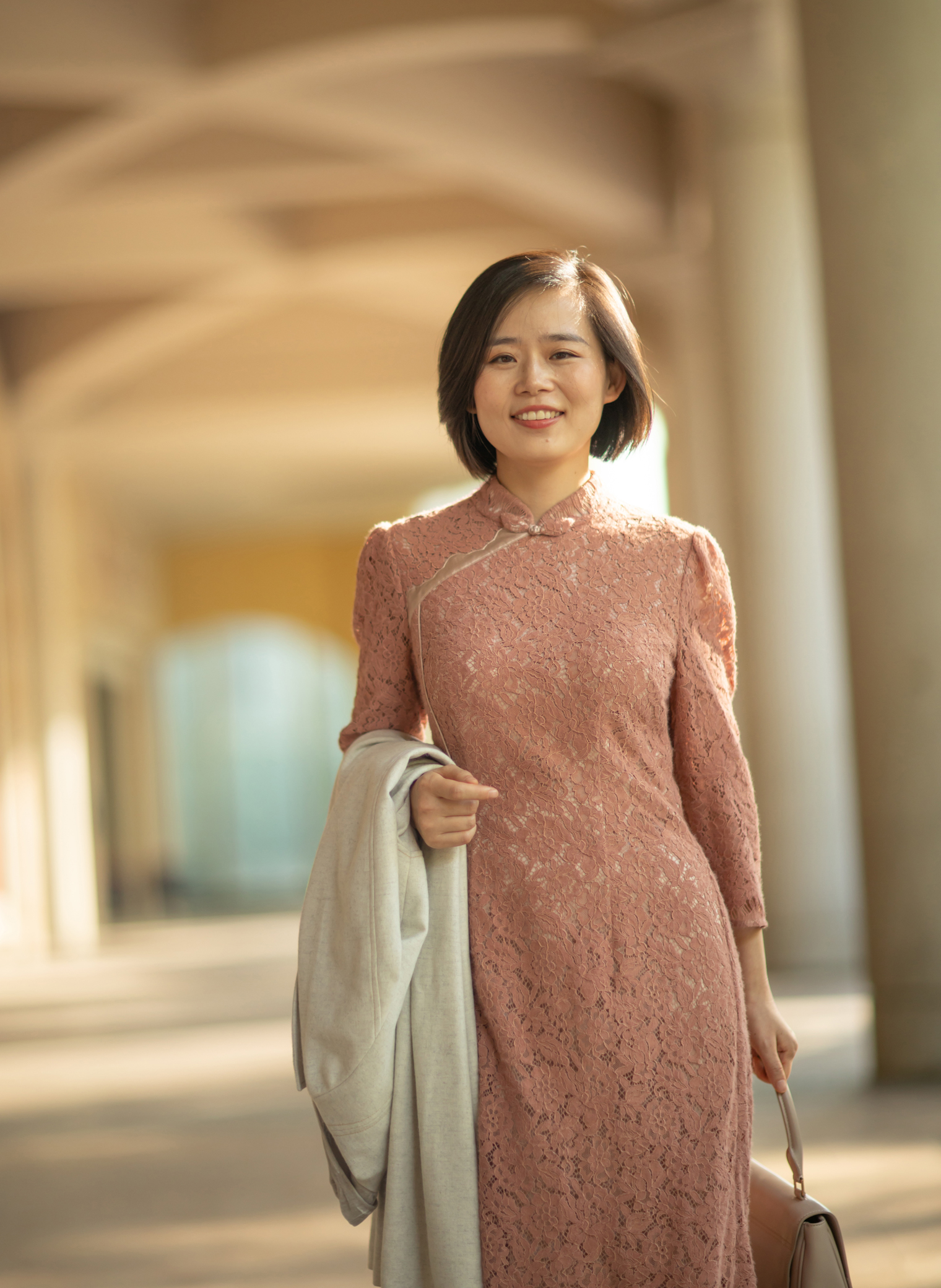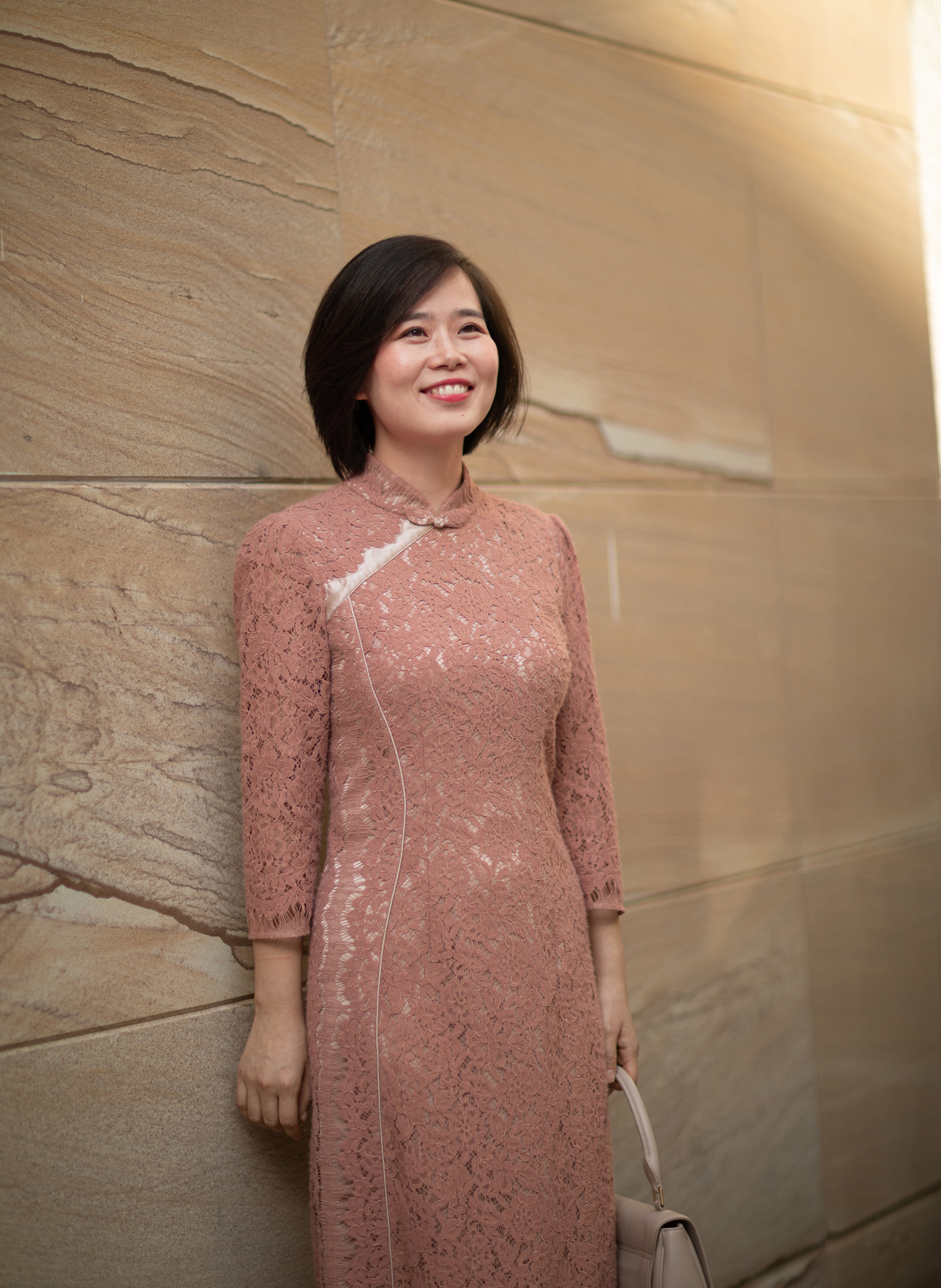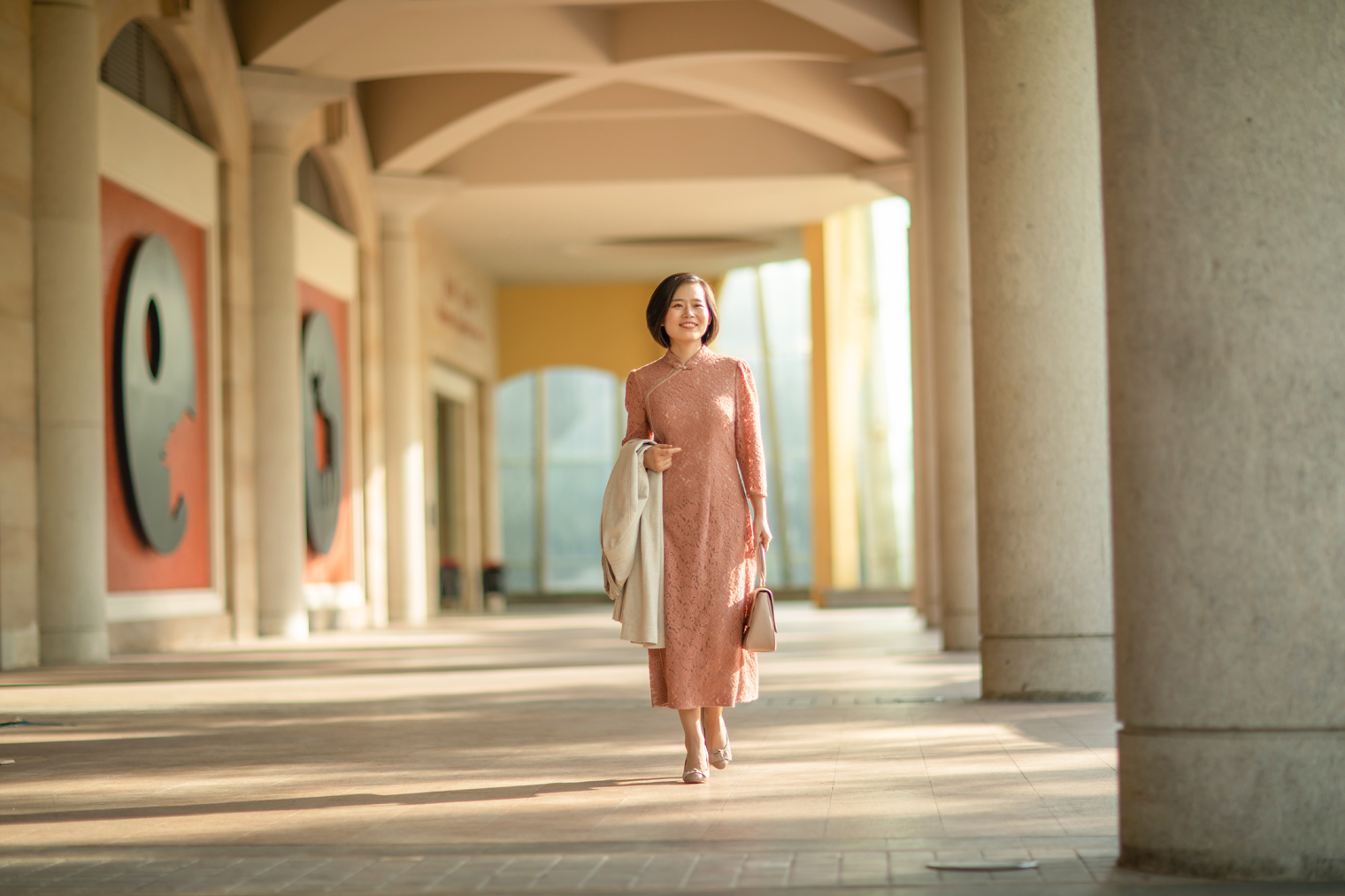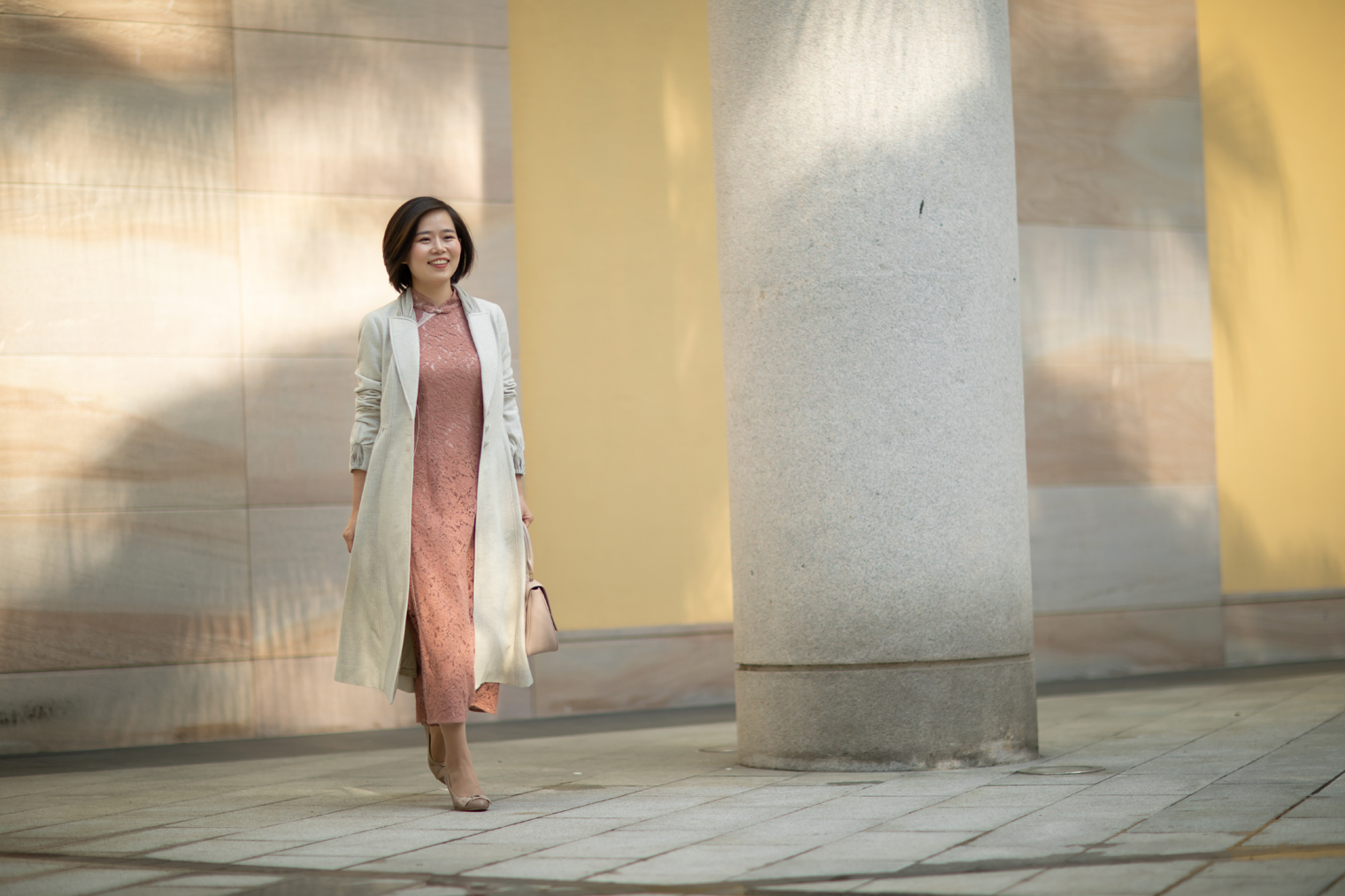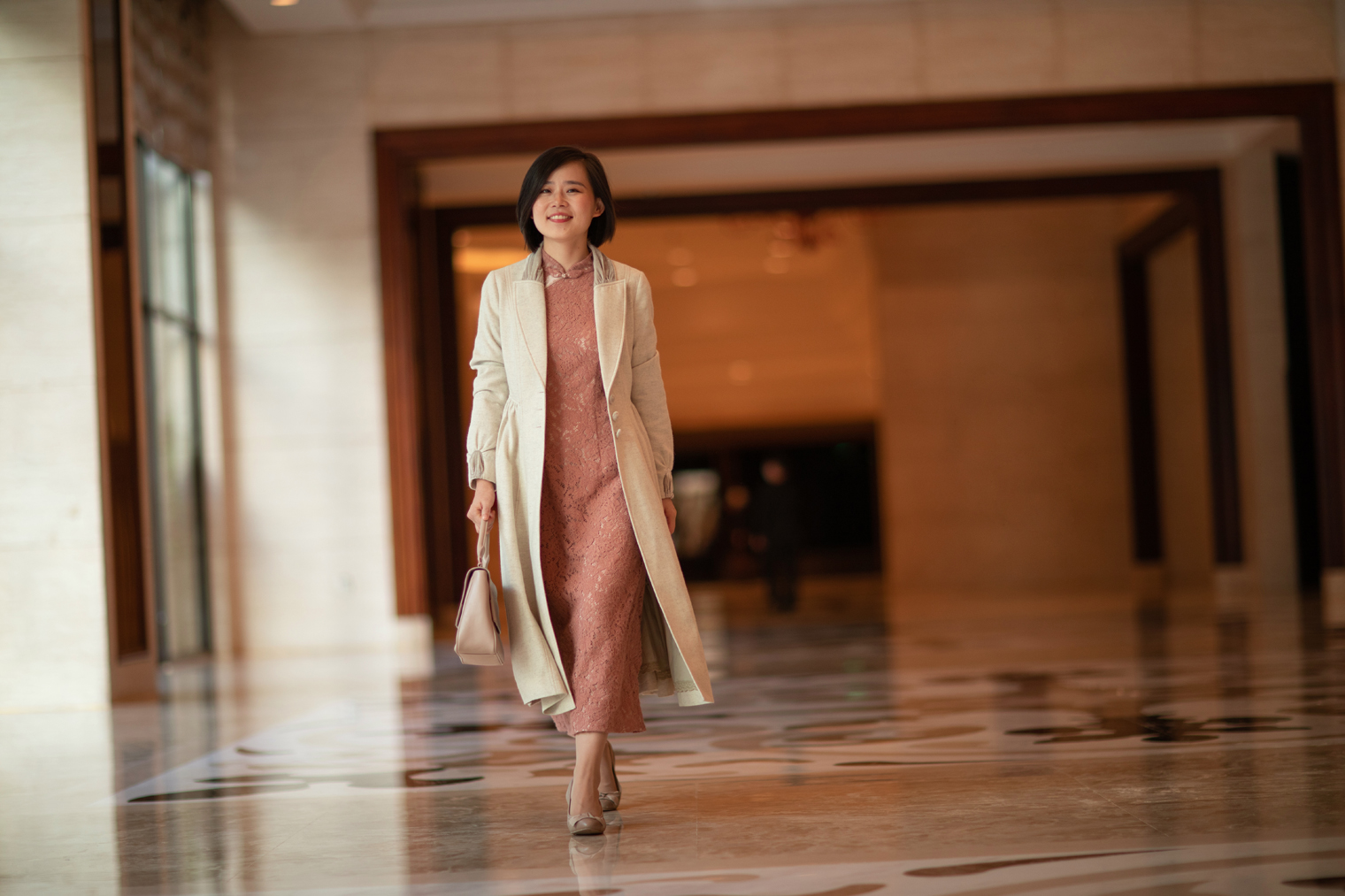 “美福”意味着在庆典时刻献上最美的祝福和最美的福分。华美浪漫的蕾丝与温婉、清雅的粉调,交融出甜蜜的幸福感,独特的绒感面料令花型图案更为立体生动,更释放出绵长馨香……斜襟的真丝波浪花边散发着淡淡光泽,右侧精美滚边工艺刻画出优美曲线,节制地点缀出庄重感,也衬托出淑女身材曲线美;立体手工盘扣、袖口精美定位花边、扇形的鱼尾后衩……细节中尽显尊贵格调。