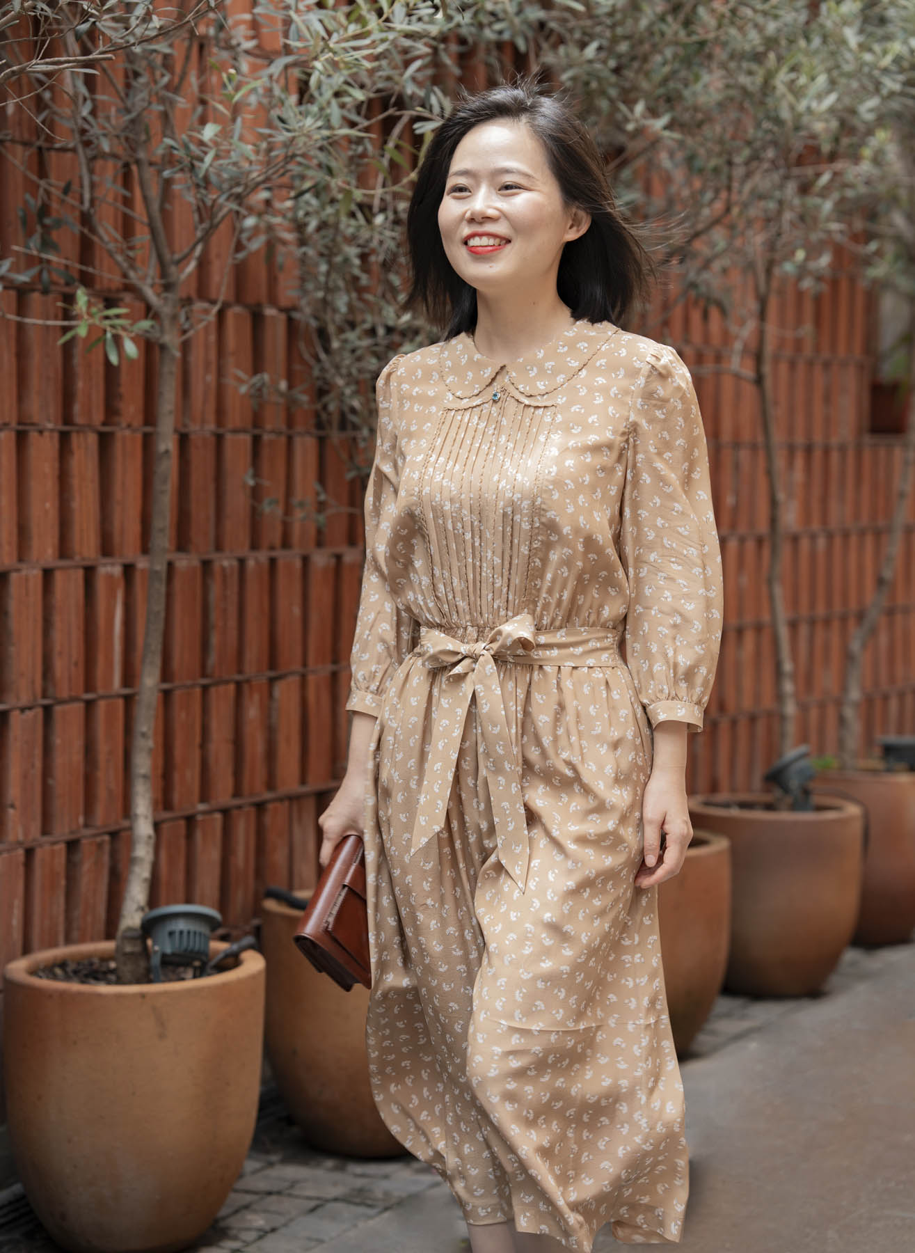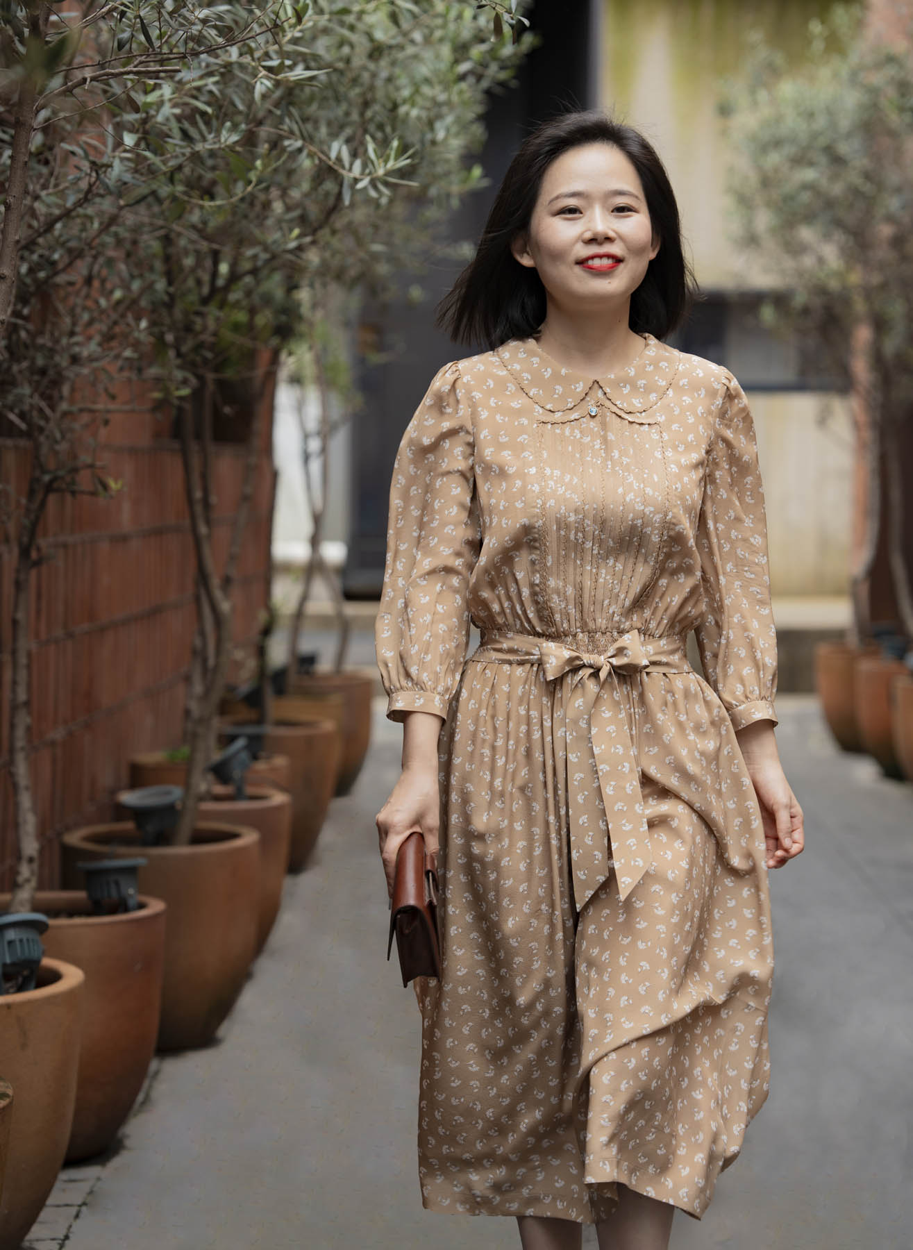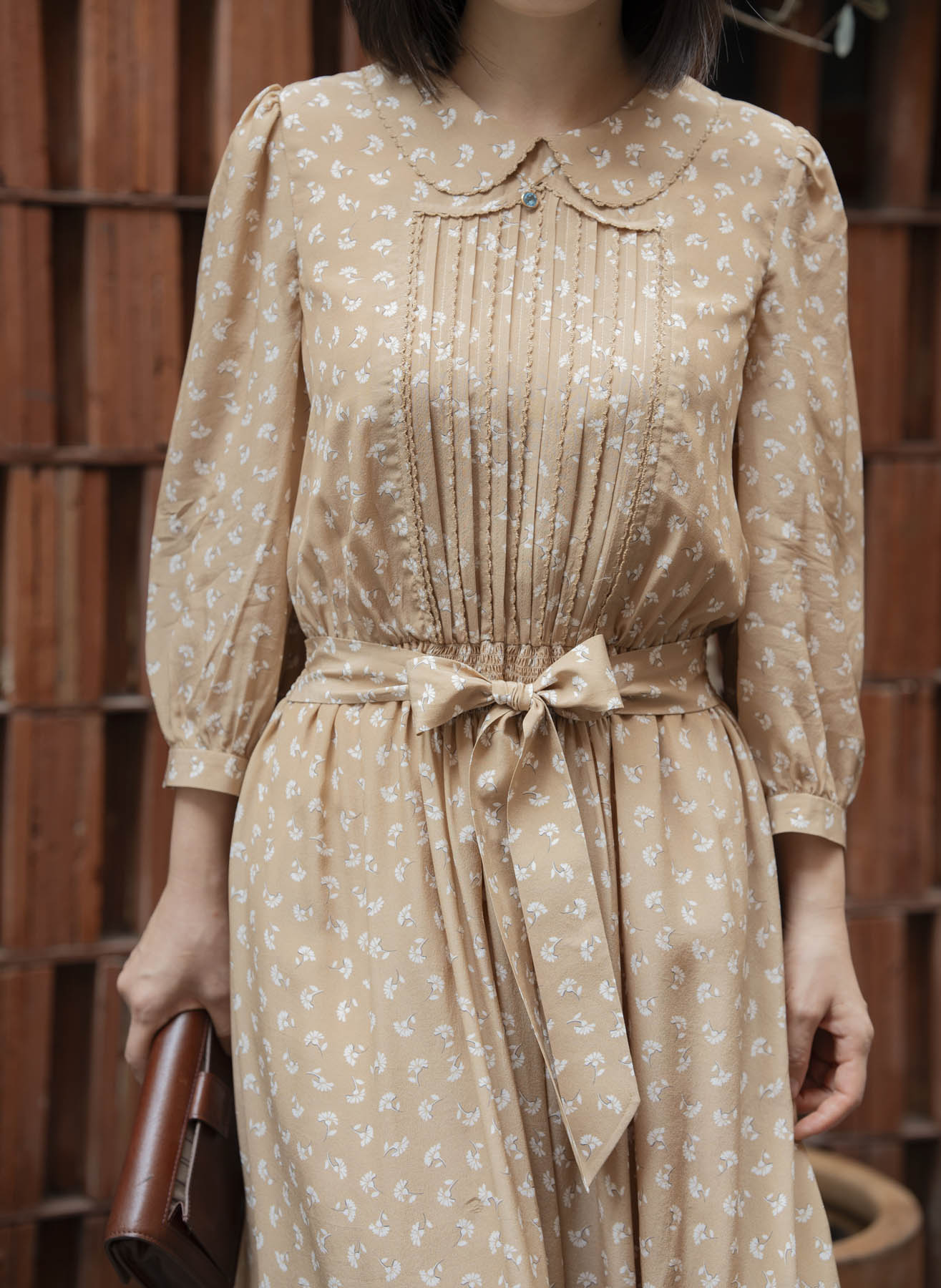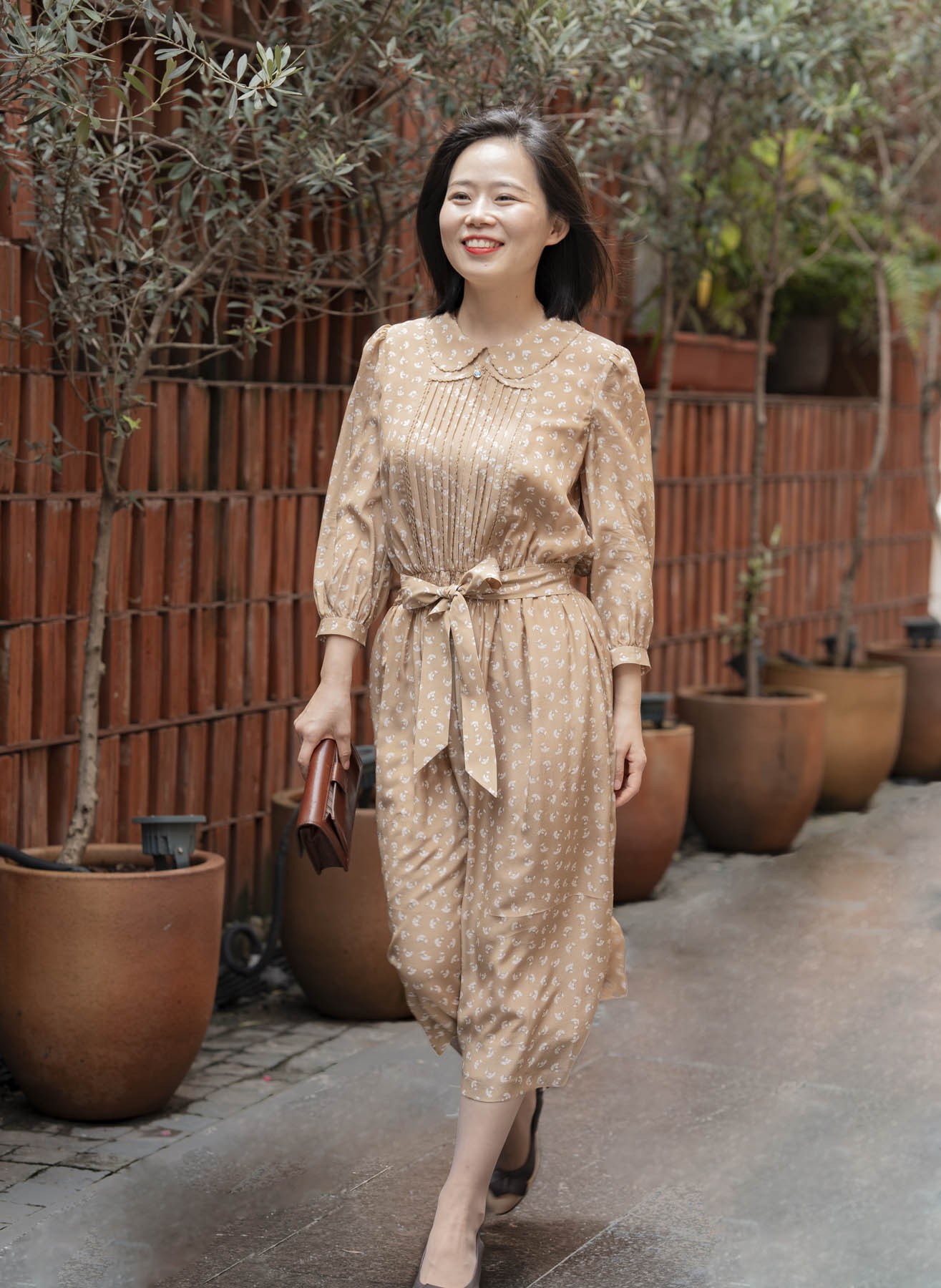 具有包容性的卡其色传递着隽永耐品气质,白色花朵如漫天飞舞的蒲公英,一如淑女青春浪漫的气息。诗意的情怀还体现在许多精心的细节中:双层的彼得潘领、精致的钩花花边、复古典雅的风琴褶、精美的腰部打缆工艺……“笑语声声沁家园”的气质是轻松喜悦的,油然而生的雀跃来自对生活的感恩、对家园的喜爱,是用心操持后所得的满足。她的家就像一座花园,让置身其中的人得安歇得喜乐,久久难忘……