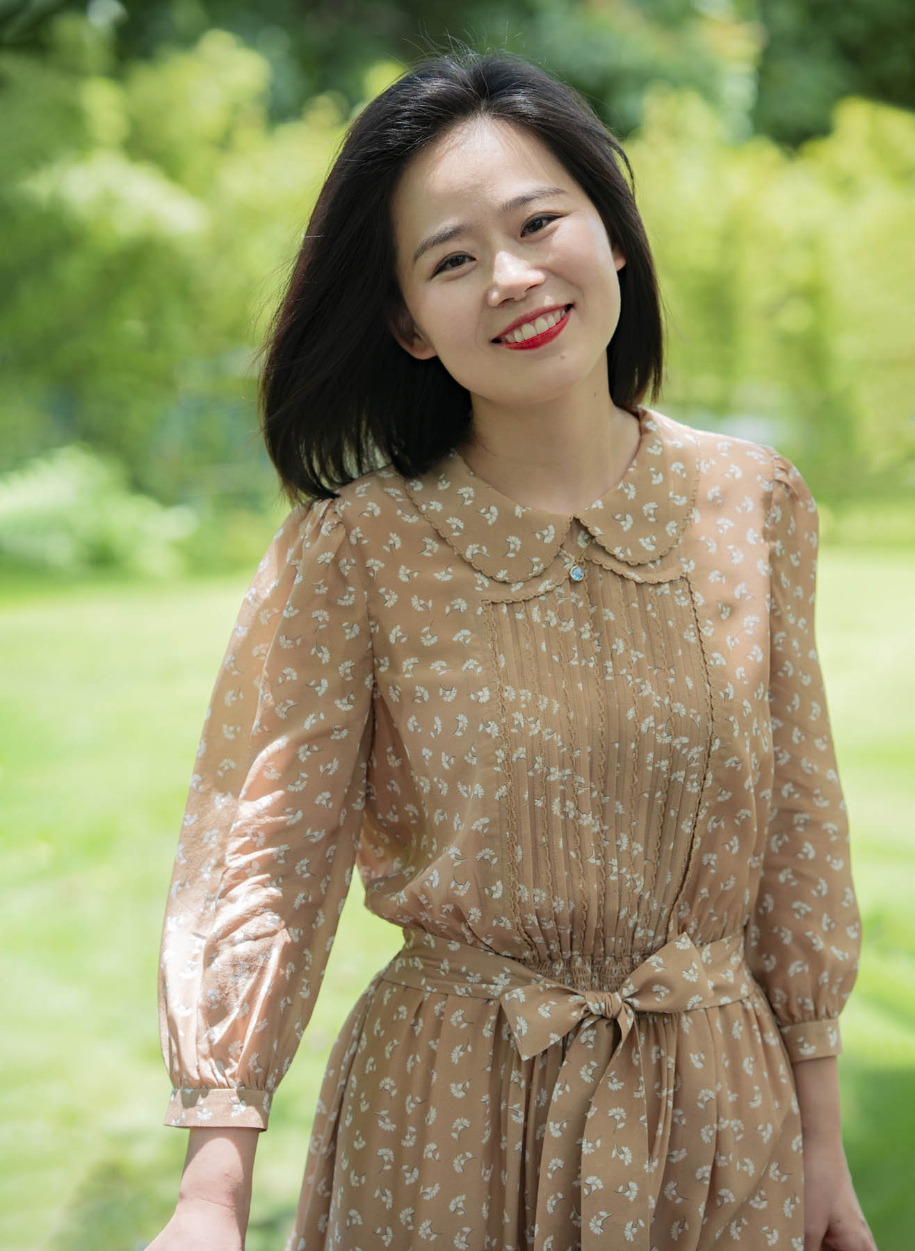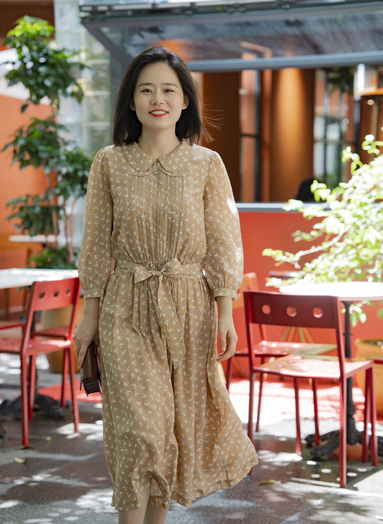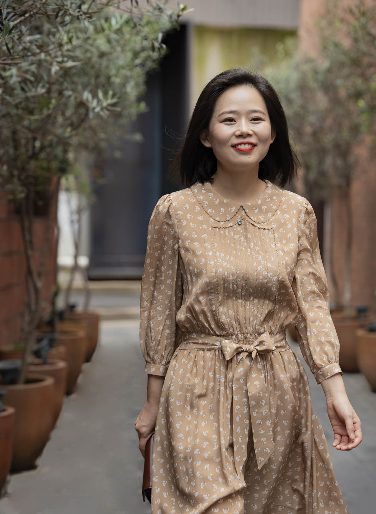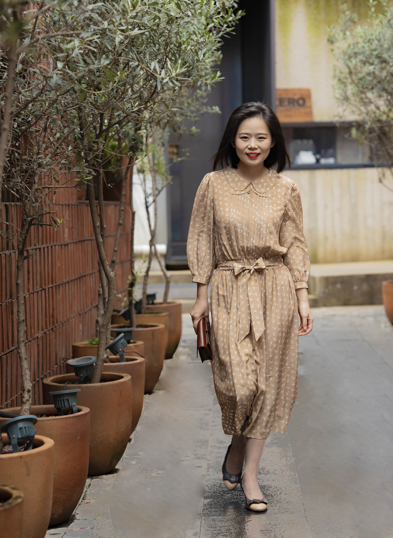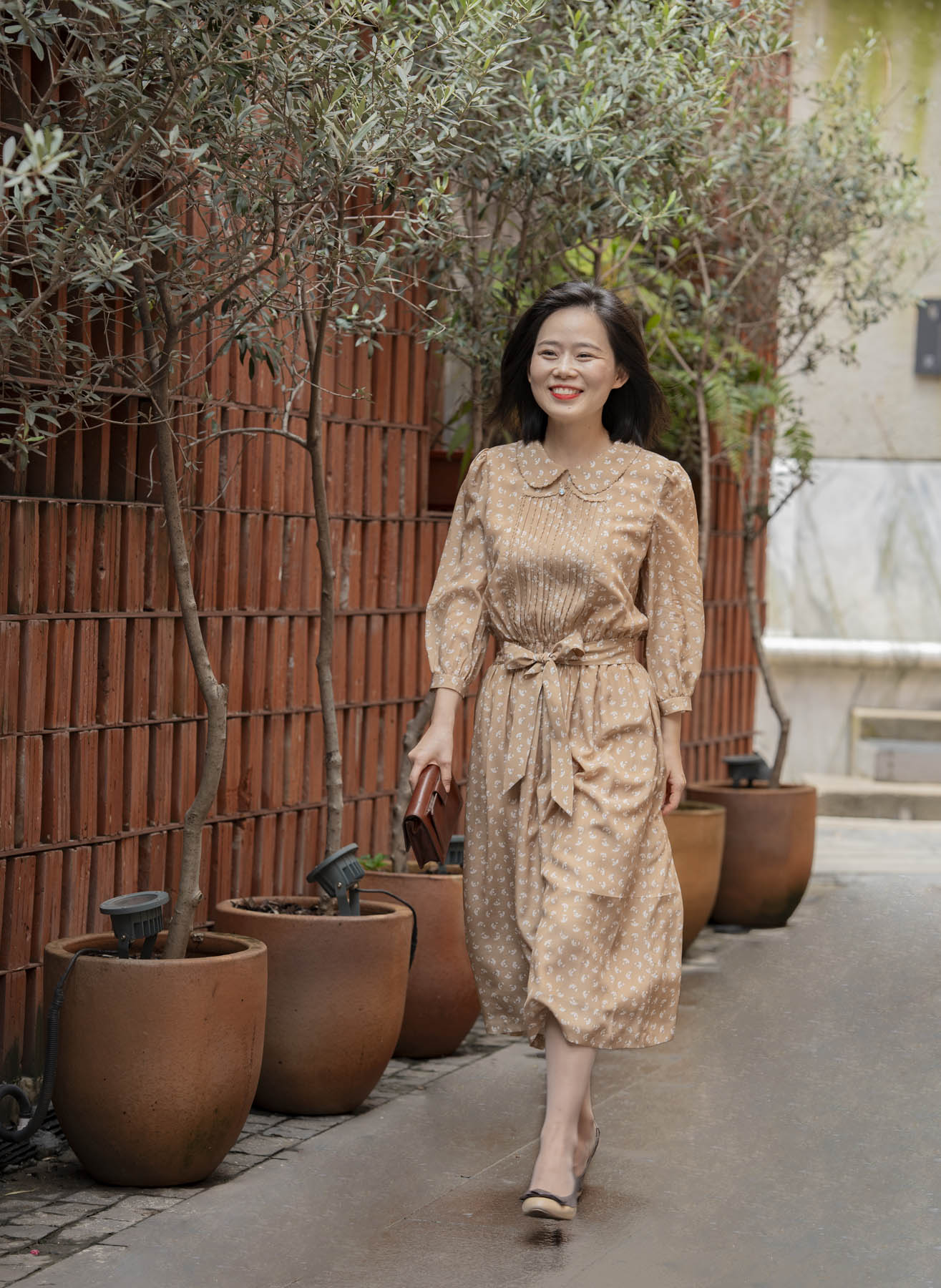 具有包容性的卡其色传递着隽永耐品气质,白色花朵如漫天飞舞的蒲公英,一如淑女青春浪漫的气息。诗意的情怀还体现在许多精心的细节中:双层的彼得潘领、精致的钩花花边、复古典雅的风琴褶、精美的腰部打缆工艺……“笑语声声沁家园”的气质是轻松喜悦的,油然而生的雀跃来自对生活的感恩、对家园的喜爱,是用心操持后所得的满足。她的家就像一座花园,让置身其中的人得安歇得喜乐,久久难忘……