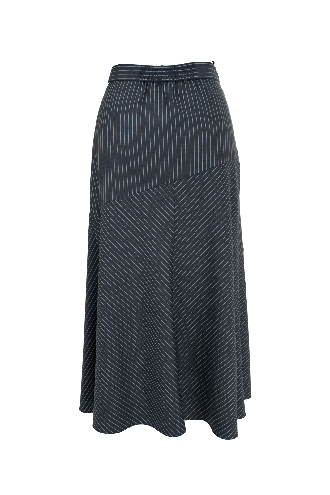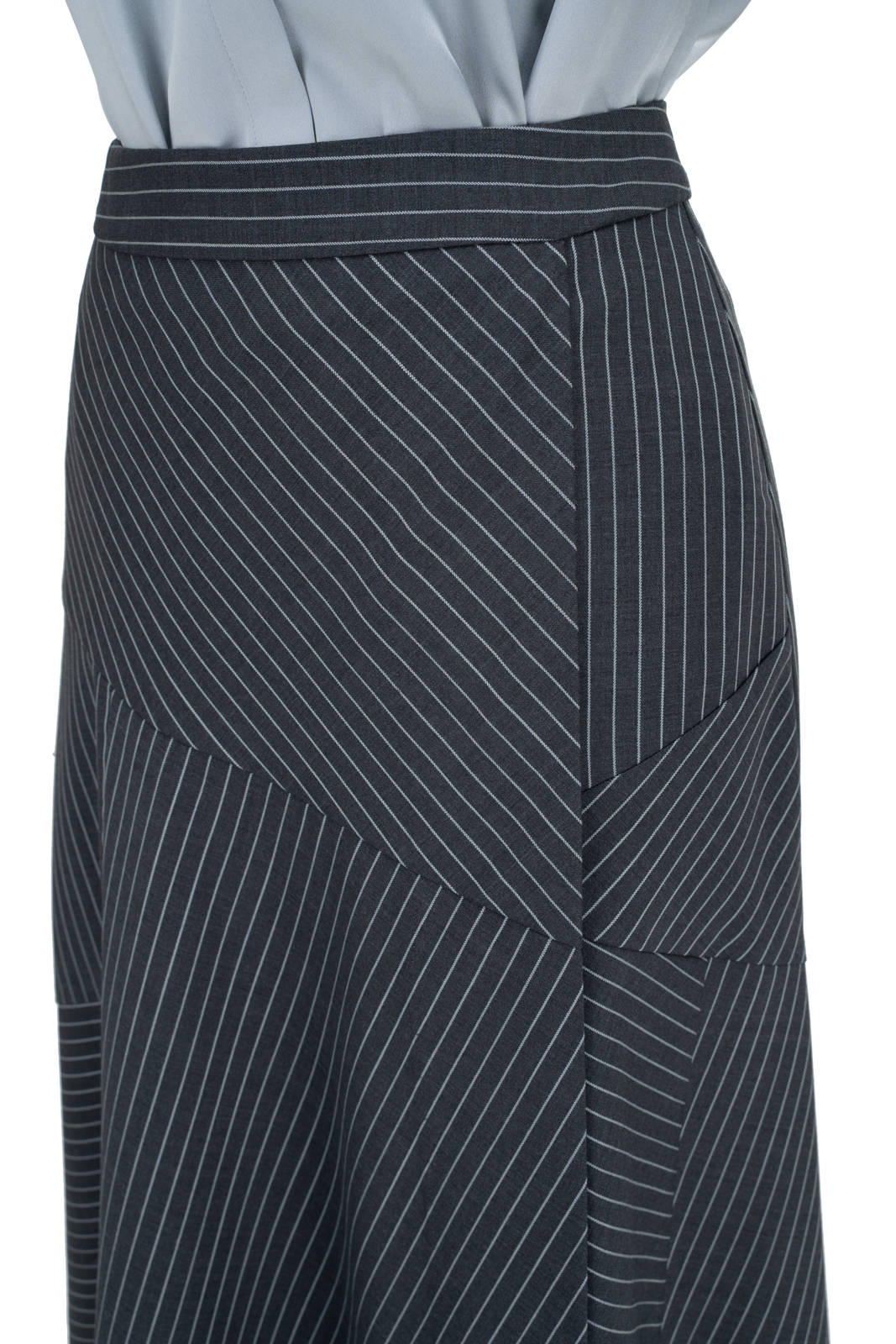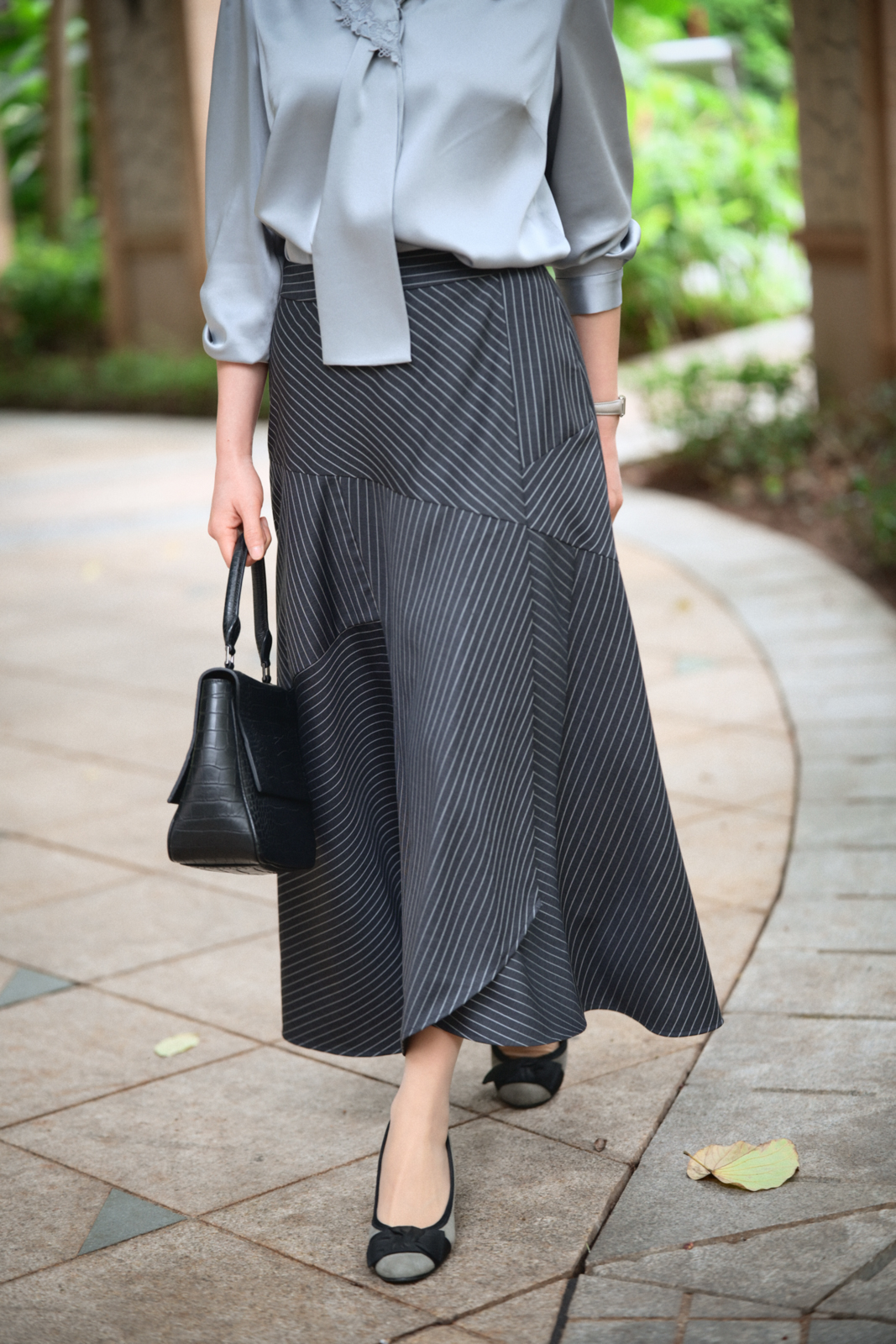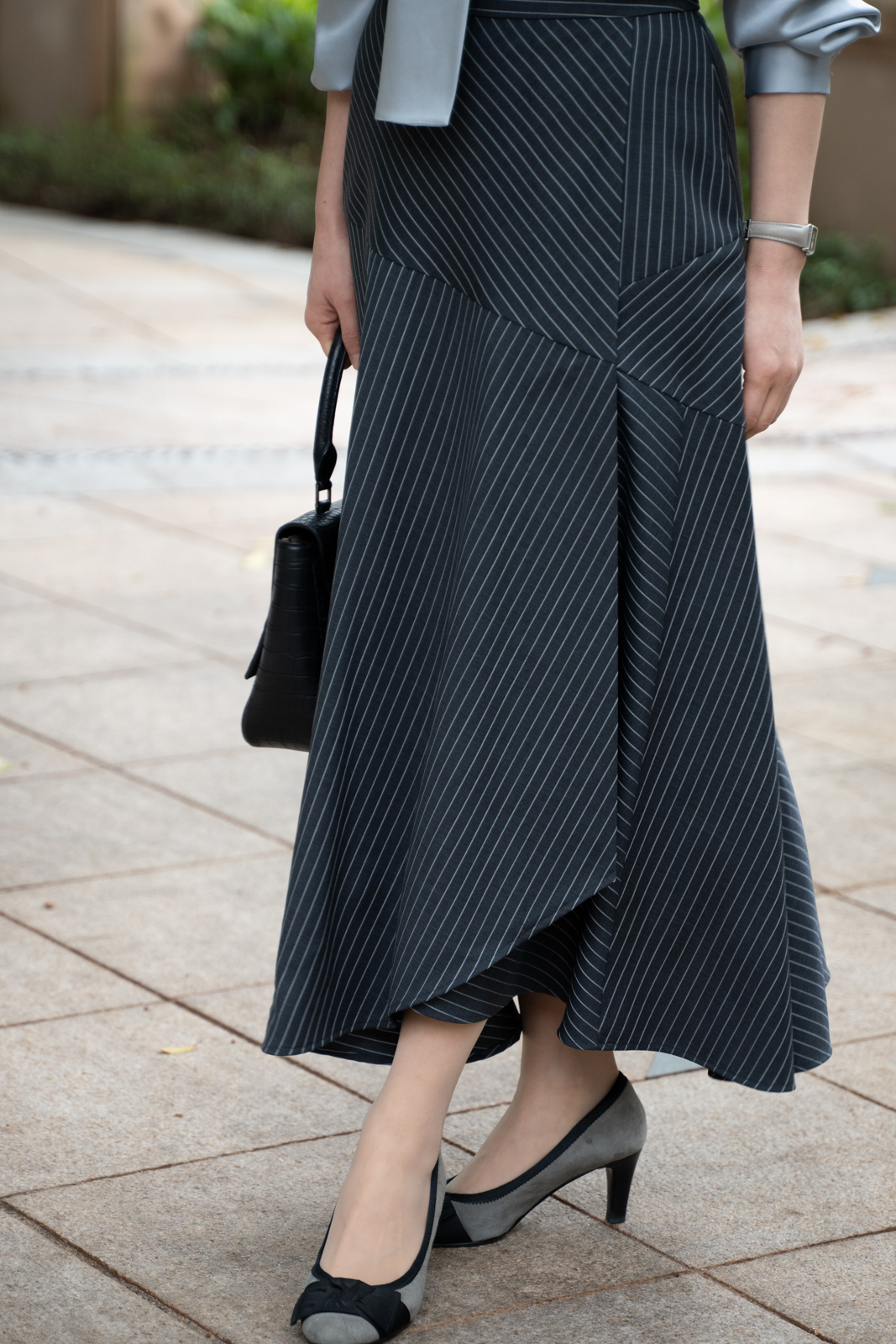 条纹是有节制的理性图案,灰白色里有谦逊内敛温柔和轻盈,彼此的相遇和恰到好处的分寸,令条纹有多样精彩,也令理性灵动平衡……这条不可多得的长半裙,将经典与个性完美融合,突破条纹规整与刻板的印象,用微妙的拼接角度呈现活泼流动的气质,赋予趣意盎然又不失沉稳的基调。百分百精纺羊毛质地天然透气,既能搭配西装、风衣穿出专业与干练,又可以与针织衫、衬衫搭配穿出刚柔并济的随性魅力。