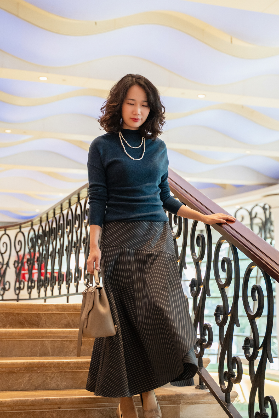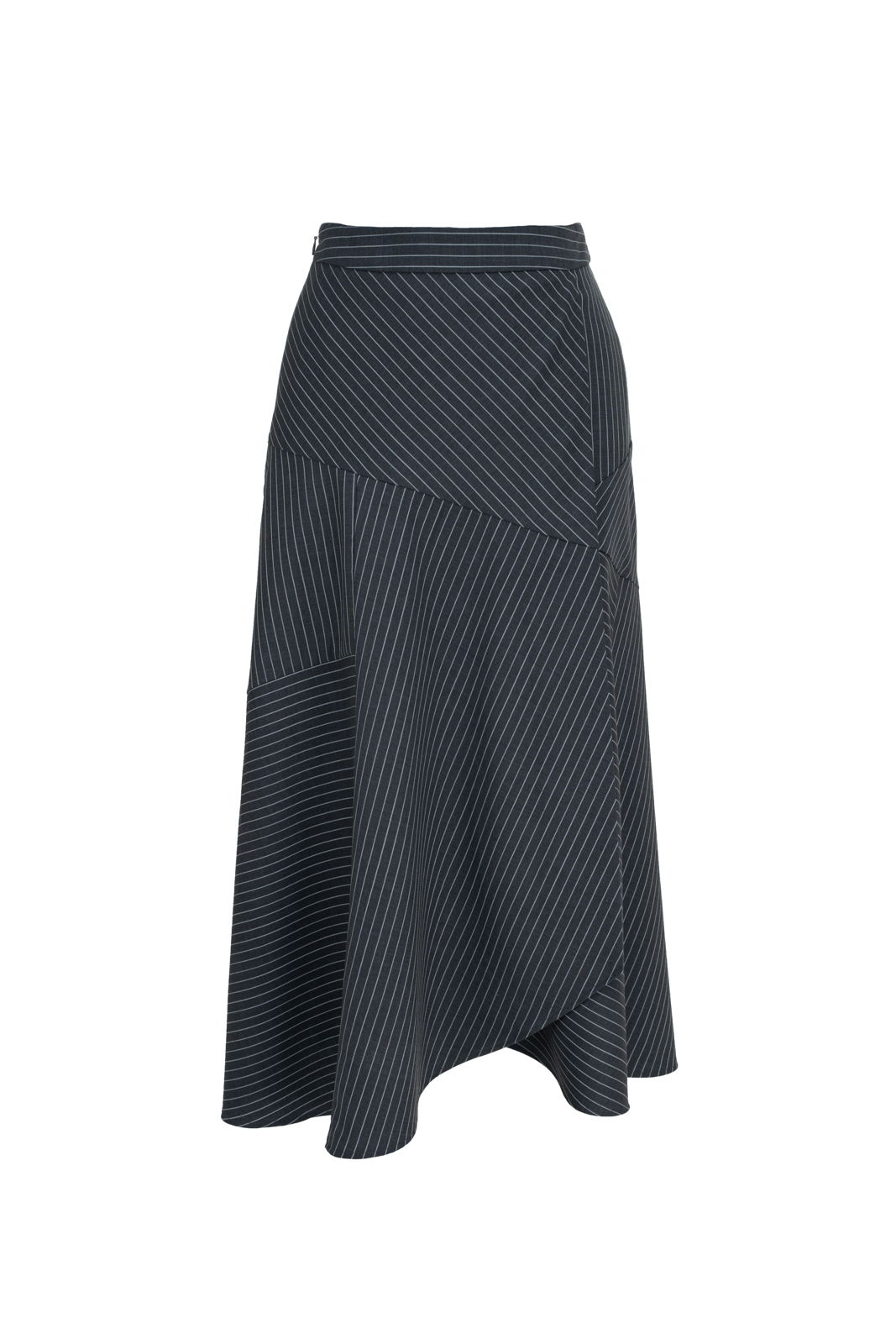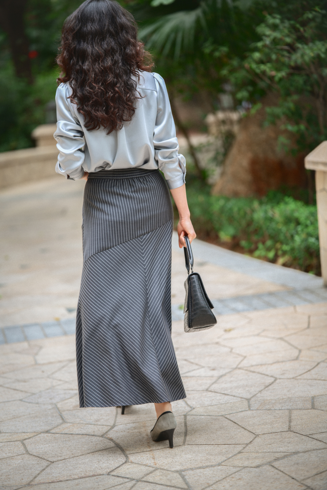 条纹是有节制的理性图案,灰白色里有谦逊内敛温柔和轻盈,彼此的相遇和恰到好处的分寸,令条纹有多样精彩,也令理性灵动平衡……这条不可多得的长半裙,将经典与个性完美融合,突破条纹规整与刻板的印象,用微妙的拼接角度呈现活泼流动的气质,赋予趣意盎然又不失沉稳的基调。百分百精纺羊毛质地天然透气,既能搭配西装、风衣穿出专业与干练,又可以与针织衫、衬衫搭配穿出刚柔并济的随性魅力。