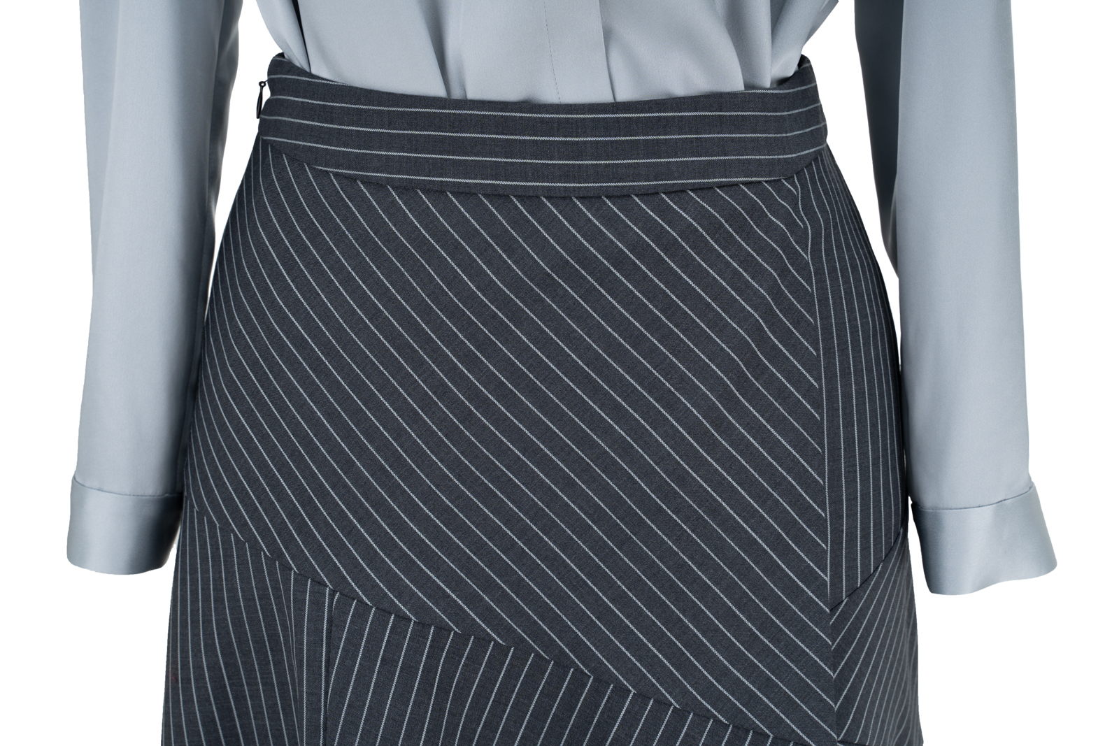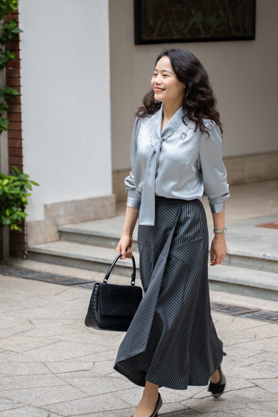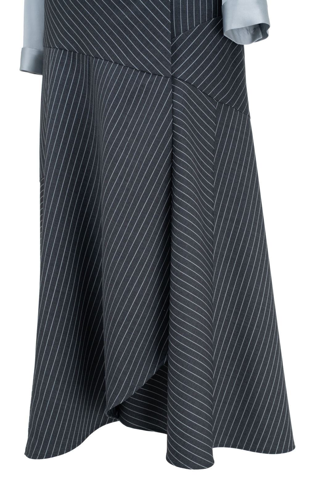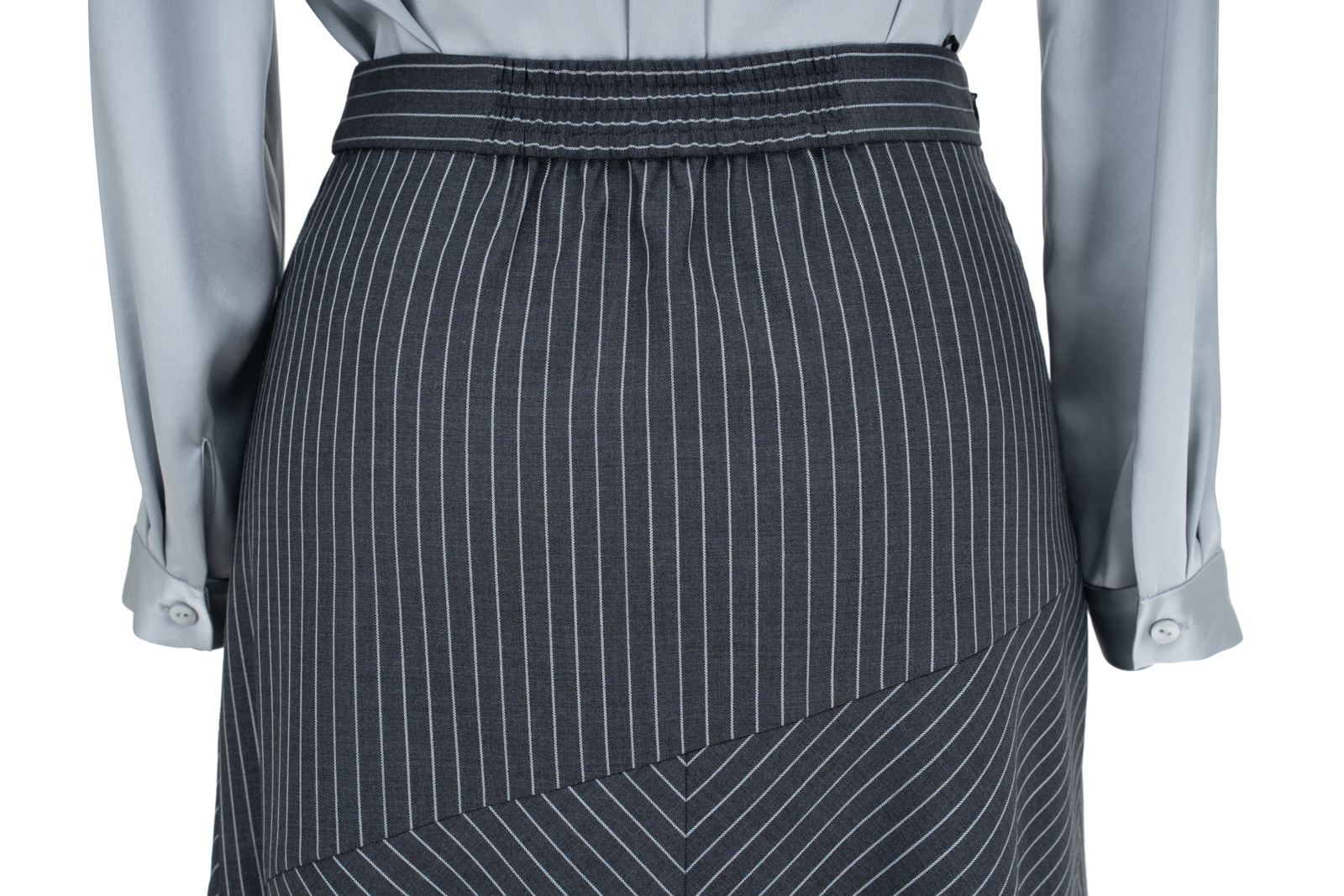 条纹是有节制的理性图案,灰白色里有谦逊内敛温柔和轻盈,彼此的相遇和恰到好处的分寸,令条纹有多样精彩,也令理性灵动平衡……这条不可多得的长半裙,将经典与个性完美融合,突破条纹规整与刻板的印象,用微妙的拼接角度呈现活泼流动的气质,赋予趣意盎然又不失沉稳的基调。百分百精纺羊毛质地天然透气,既能搭配西装、风衣穿出专业与干练,又可以与针织衫、衬衫搭配穿出刚柔并济的随性魅力。