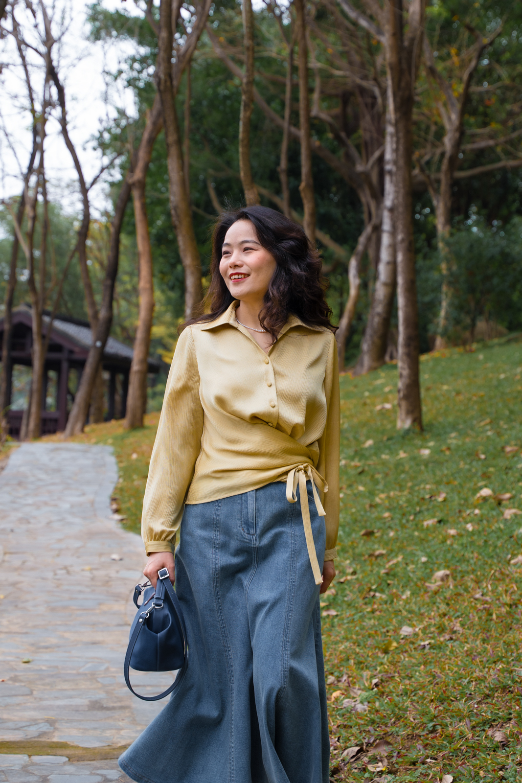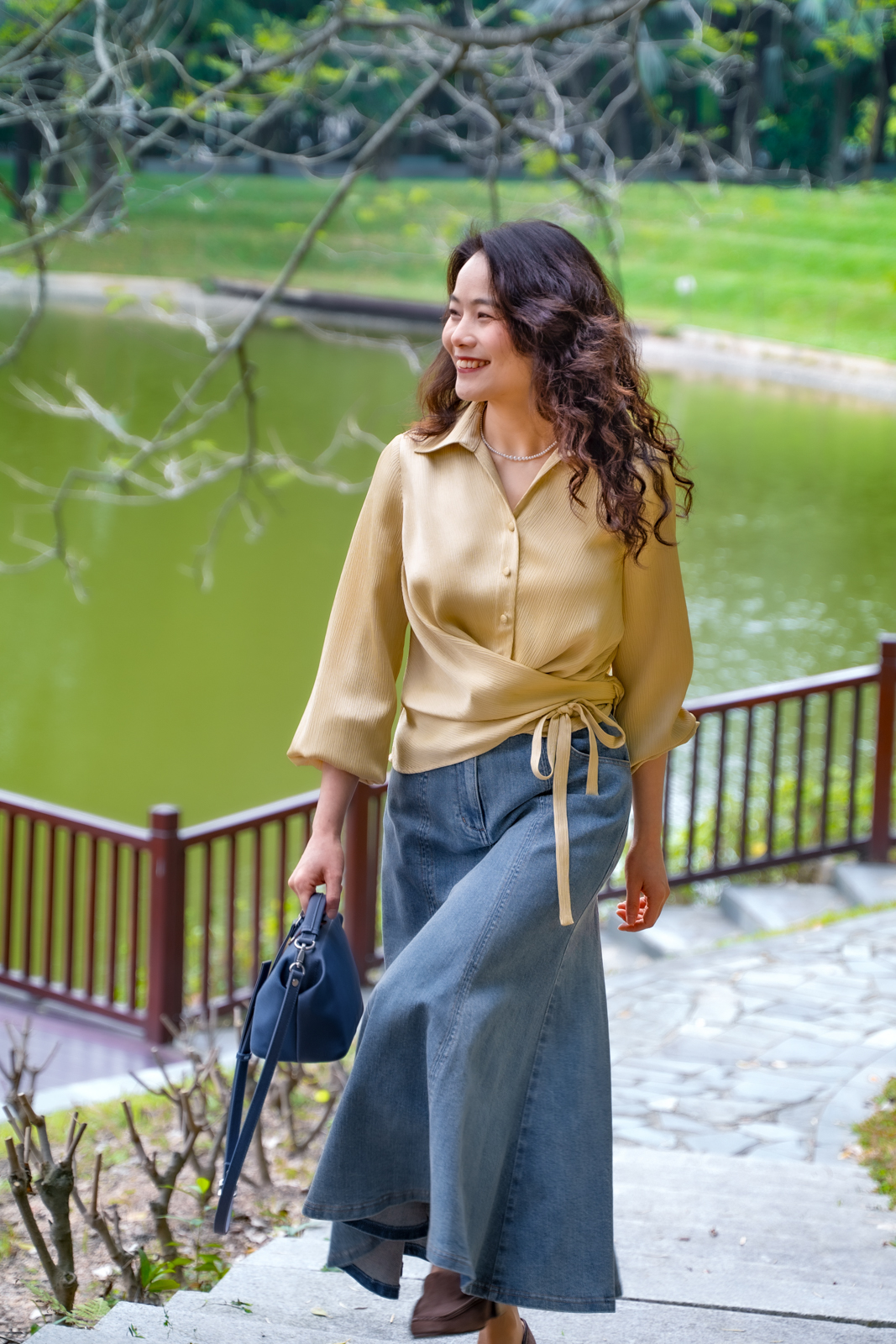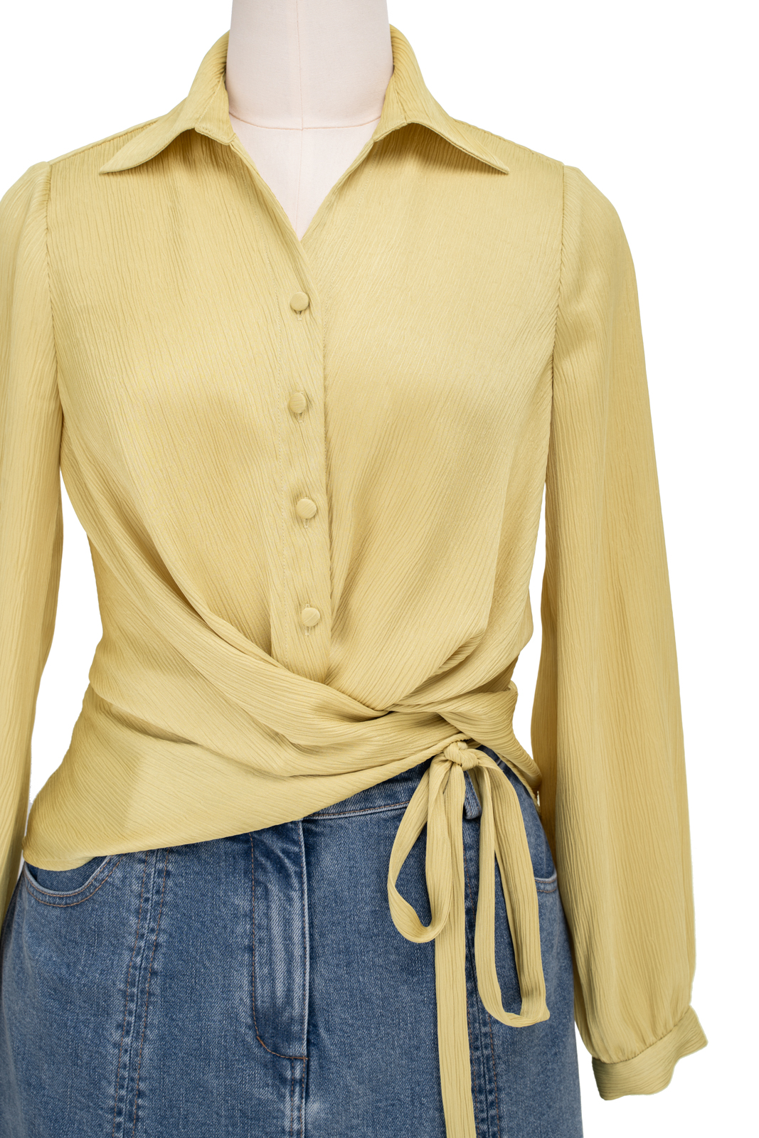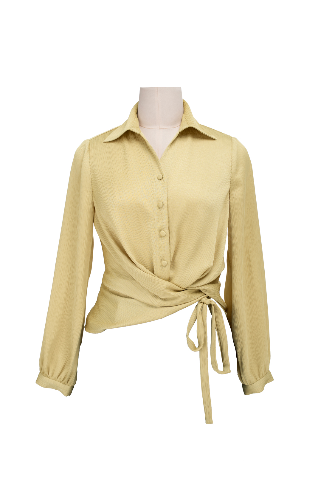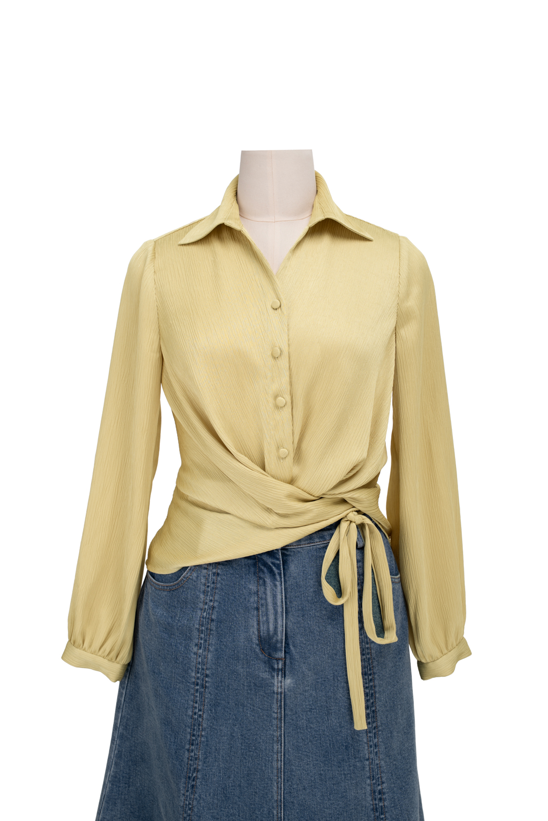 柔和的黄是春日里的明媚,是自然里生出的欢喜,令人喜悦的物产常常以黄色呈现,“幸福的黄”名副其实。带着褶皱纹理的进口纤维面料质感柔滑垂坠,泛着微微淡雅珠光,如月色朦胧的光芒。在经典衬衫的版型上,巧妙融入创意设计,下摆扭结与可调节的系带设计是神来之笔,让淑女穿出松弛优美的姿态,可根据自身喜好和穿着需求发挥创意,自由打造随意、有个性的造型,令形象具有设计感,让人常见常新……