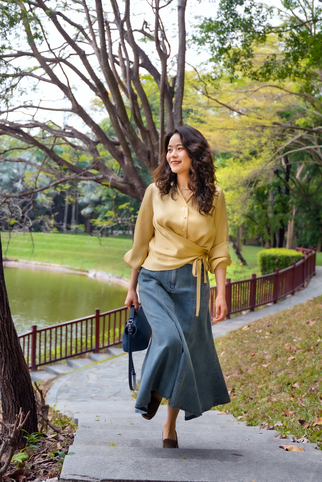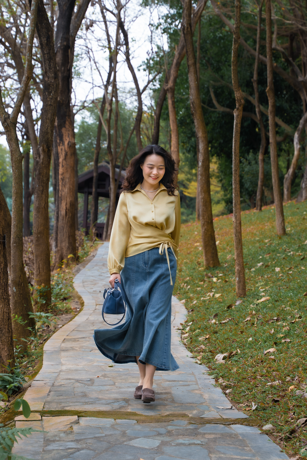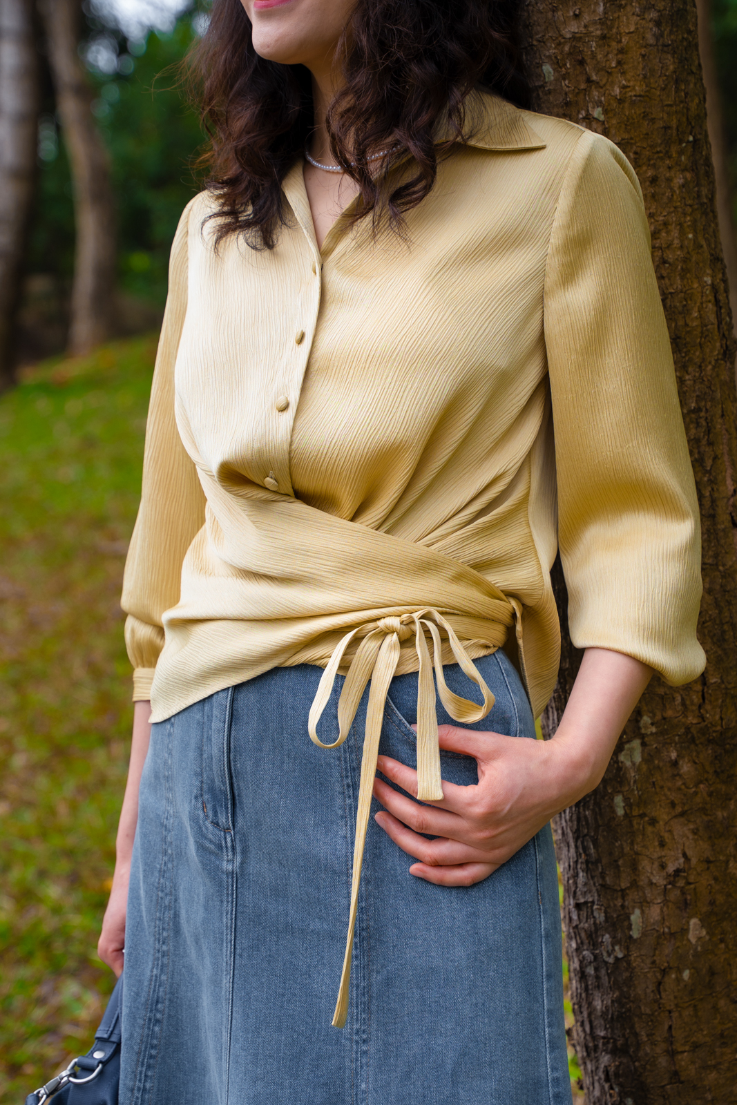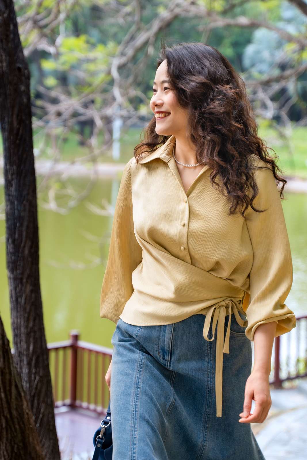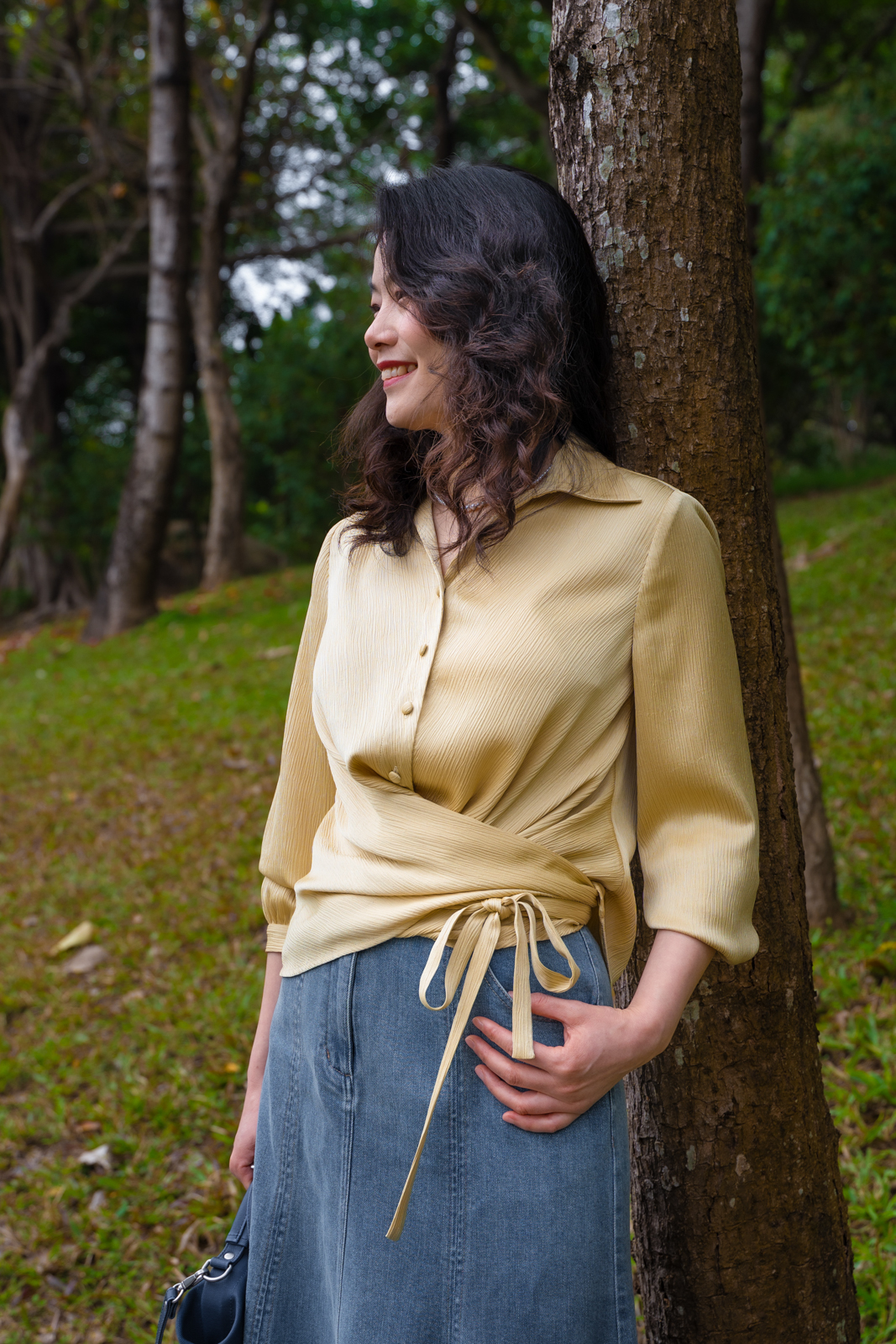 柔和的黄是春日里的明媚,是自然里生出的欢喜,令人喜悦的物产常常以黄色呈现,“幸福的黄”名副其实。带着褶皱纹理的进口纤维面料质感柔滑垂坠,泛着微微淡雅珠光,如月色朦胧的光芒。在经典衬衫的版型上,巧妙融入创意设计,下摆扭结与可调节的系带设计是神来之笔,让淑女穿出松弛优美的姿态,可根据自身喜好和穿着需求发挥创意,自由打造随意、有个性的造型,令形象具有设计感,让人常见常新……